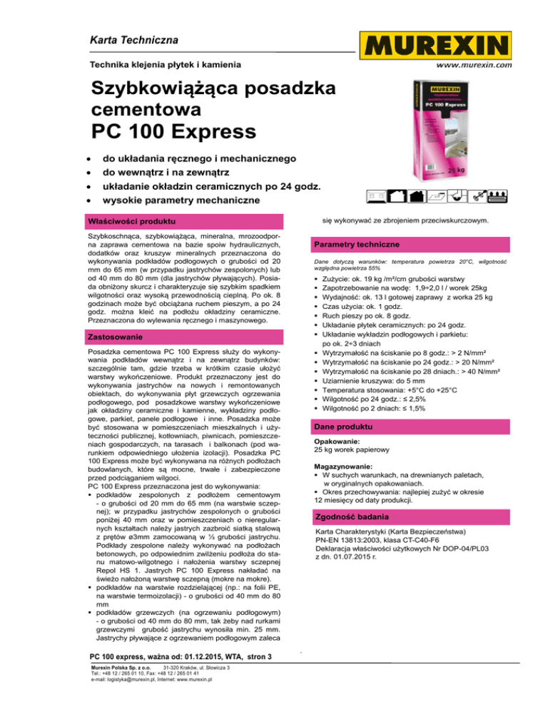 Karta Techniczna Technika klejenia płytek i kamienia FLT_PC100 express Szybkowiążąca posadzka cementowa PC 100 Express do układania ręcznego i mechanicznego do wewnątrz i na zewnątrz układanie okładzin ceramicznych po 24 godz. wysokie parametry mechaniczne się wykonywać ze zbrojeniem przeciwskurczowym. Właściwości produktu Szybkoschnąca, szybkowiążąca, mineralna, mrozoodporna zaprawa cementowa na bazie spoiw hydraulicznych, dodatków oraz kruszyw mineralnych przeznaczona do wykonywania podkładów podłogowych o grubości od 20 mm do 65 mm (w przypadku jastrychów zespolonych) lub od 40 mm do 80 mm (dla jastrychów pływających). Posiada obniżony skurcz i charakteryzuje się szybkim spadkiem wilgotności oraz wysoką przewodnością cieplną. Po ok. 8 godzinach może być obciążana ruchem pieszym, a po 24 godz. można kleić na podłożu okładziny ceramiczne. Przeznaczona do wylewania ręcznego i maszynowego. Parametry techniczne Dane dotyczą warunków: temperatura powietrza 20oC, wilgotność względna powietrza 55% Zastosowanie Posadzka cementowa PC 100 Express służy do wykonywania podkładów wewnątrz i na zewnątrz budynków: szczególnie tam, gdzie trzeba w krótkim czasie ułożyć warstwy wykończeniowe. Produkt przeznaczony jest do wykonywania jastrychów na nowych i remontowanych obiektach, do wykonywania płyt grzewczych ogrzewania podłogowego, pod posadzkowe warstwy wykończeniowe jak okładziny ceramiczne i kamienne, wykładziny podłogowe, parkiet, panele podłogowe i inne. Posadzka może być stosowana w pomieszczeniach mieszkalnych i użyteczności publicznej, kotłowniach, piwnicach, pomieszczeniach gospodarczych, na tarasach i balkonach (pod warunkiem odpowiedniego ułożenia izolacji). Posadzka PC 100 Express może być wykonywana na różnych podłożach budowlanych, które są mocne, trwałe i zabezpieczone przed podciąganiem wilgoci. PC 100 Express przeznaczona jest do wykonywania: podkładów zespolonych z podłożem cementowym - o grubości od 20 mm do 65 mm (na warstwie sczepnej); w przypadku jastrychów zespolonych o grubości poniżej 40 mm oraz w pomieszczeniach o nieregularnych kształtach należy jastrych zazbroić siatką stalową z prętów ø3mm zamocowaną w ⅓ grubości jastrychu. Podkłady zespolone należy wykonywać na podłożach betonowych, po odpowiednim zwilżeniu podłoża do stanu matowo-wilgotnego i nałożenia warstwy sczepnej Repol HS 1. Jastrych PC 100 Express nakładać na świeżo nałożoną warstwę sczepną (mokre na mokre). podkładów na warstwie rozdzielającej (np.: na folii PE, na warstwie termoizolacji) - o grubości od 40 mm do 80 mm podkładów grzewczych (na ogrzewaniu podłogowym) - o grubości od 40 mm do 80 mm, tak żeby nad rurkami grzewczymi grubość jastrychu wynosiła min. 25 mm. Jastrychy pływające z ogrzewaniem podłogowym zaleca PC 100 express, ważna od: 01.12.2015, WTA, stron 3 Murexin Polska Sp. z o.o. 31-320 Kraków, ul. Słowicza 3 Tel.: +48 12 / 265 01 10, Fax: +48 12 / 265 01 41 e-mail: [email protected], Internet: www.murexin.pl Zużycie: ok. 19 kg /m²/cm grubości warstwy Zapotrzebowanie na wodę: 1,9÷2,0 l / worek 25kg Wydajność: ok. 13 l gotowej zaprawy z worka 25 kg Czas użycia: ok. 1 godz. Ruch pieszy po ok. 8 godz. Układanie płytek ceramicznych: po 24 godz. Układanie wykładzin podłogowych i parkietu: po ok. 2÷3 dniach Wytrzymałość na ściskanie po 8 godz.: > 2 N/mm² Wytrzymałość na ściskanie po 24 godz.: > 20 N/mm² Wytrzymałość na ściskanie po 28 dniach.: > 40 N/mm² Uziarnienie kruszywa: do 5 mm Temperatura stosowania: +5°C do +25°C Wilgotność po 24 godz.: ≤ 2,5% Wilgotność po 2 dniach: ≤ 1,5% Dane produktu Opakowanie: 25 kg worek papierowy Magazynowanie: W suchych warunkach, na drewnianych paletach, w oryginalnych opakowaniach. Okres przechowywania: najlepiej zużyć w okresie 12 miesięcy od daty produkcji. Zgodność badania Karta Charakterystyki (Karta Bezpieczeństwa) PN-EN 13813:2003, klasa CT-C40-F6 Deklaracja właściwości użytkowych Nr DOP-04/PL03 z dn. 01.07.2015 r. 1 Karta Techniczna Technika klejenia płytek i kamienia FLT_PC100 express Stosowanie Zalecane narzędzia: Standardowe urządzenia i narzędzia do wykonywania podkładów i posadzek, elektryczne mieszadło wolnoobrotowe, kielnia, paca, łata, pojemnik do mieszania, pojemnik do odmierzania wody. Obróbka: Przygotowaną zaprawę rozłożyć równomiernie na podłożu i ściągnąć łatą po wypoziomowanych prowadnicach, następnie usunąć prowadnice i uzupełnić zaprawę. Następnie zagęścić za pomocą łaty wibracyjnej lub pac plastikowych do uzyskania odpowiedniej struktury powierzchni. W celu zmniejszenia prawdopodobieństwa pojawienia się rys skurczowych oraz zwiększenia wytrzymałości posadzki na rozciąganie można dodać do zaprawy włókna polipropylenowe Austrofaser PP 18 mm w ilości ok. 0,9 kg włókna na 1 m3 zaprawy. Pod cienkie wykładziny podłogowe np. PVC zaleca się wylanie masy wyrównawczej Murexin NB 10 lub ST 25 na zagruntowany preparatem D1 lub D7 jastrych. Świeżo ułożoną warstwę jastrychu można utwardzić powierzchniowo za pomocą posypki utwardzającej BH 100 lub BH 400 i zatarcie mechaniczne jastrychu. Taka zatarta powierzchnia może być warstwą użytkową. Podłoże: Stosować na wszystkich mineralnych, chłonnych podłożach budowlanych przeznaczonych do wylewania podkładów i posadzek, np. na betonie, ale też na izolacjach termicznych i akustycznych, warstwach rozdzielających, itp. Podłoże w przypadku jastrychów zespolonych: musi być suche, odpowiednio mocne, stabilne, nieprzemarznięte, czyste, bez substancji zmniejszających przyczepność (pyły, bitumy, tłuszcze, resztki farb, zapraw) i luźnych części. Podłoże należy odpowiednio przygotować: jeśli jest konieczność wyszlifować, frezować lub piaskować oraz dokładnie oczyścić i odkurzyć. Słabe i luźne fragmenty podłoża należy skuć i uzupe