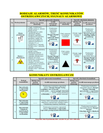 rodzaje alarmów, treść komunikatów ostrzegawczych, sygnały