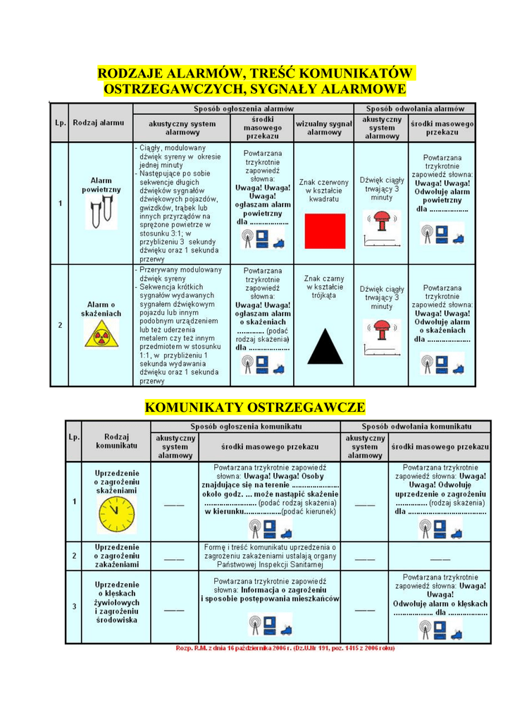 RODZAJE ALARMÓW, TREŚĆ KOMUNIKATÓW OSTRZEGAWCZYCH, SYGNAŁY ALARMOWE KOMUNIKATY OSTRZEGAWCZE POSTĘPOWANIE PO OGŁOSZENIU SYGNAŁÓW ALARMOWYCH ALARM POWIETRZNY Po usłyszeniu sygnału alarmu powietrznego należy działać szybko, ale rozważnie i bez paniki. Osoby znajdujące się w domu powinny: ¾ ubrać się, zabrać dokumenty osobiste, zapas żywności‚ indywidualne środki ochrony przed skażeniami, środki opatrunkowe oraz w miarę potrzeb i możliwości latarkę elektryczną koc, odbiornik radiowy z zakresem fal UKF itp., ¾ wyłączyć wszystkie urządzenia elektryczne i gazowe oraz wygasić ogień w piecu, ¾ zamknąć okna i zabezpieczyć mieszkanie, ¾ zawiadomić o alarmie sąsiadów, ¾ udać się do najbliższego schronu lub ukrycia. Osoby znajdujące się miejscu publicznym powinny: ¾ udać się do najbliższego schronu lub ukrycia, ¾ pomagać słabszym, chorym i ułomnym, ¾ podporządkować się ściśle poleceniom organów i służb obrony cywilnej. Prowadzący pojazdy mechaniczne po usłyszeniu sygnału alarmu powietrznego winni zatrzymać je i zaparkować tak aby nie blokowały ciągów komunikacyjnych i wejść do ukryć. Kierowca i pasażerowie powinni udać się do najbliższego ukrycia. Osoby, które z jakichkolwiek przyczyn nie zdążyły udać się do budowli ochronnych, ukrywają się w zagłębieniach terenu lub za innymi trwałymi osłonami. ALARM O SKAŻENIACH Po usłyszeniu sygnału alarmu o skażeniach należy: ¾ nie zbliżać się do rejonu awarii, ¾ zachowywać się spokojnie, przeciwdziałać panice i lękowi, ściśle wykonywać zarządzenia służb porządkowych, ¾ stosować się do zaleceń informacji przekazywanych w komunikatach, głównie środkami nagłaśniającymi umieszczonymi na samochodach. Przebywając na terenie otwartym należy: ¾ zwrócić uwagę na kierunek wiatru (obserwować unoszące się dymy, pary), ¾ opuścić zagrożony rejon (prostopadle do kierunku wiatru) stosując się do poleceń zawartych w komunikatach przekazywanych przez ruchome środki nagłaśniające, ¾ udać się do najbliższych budynków mieszkalnych lub publicznych. Osoby przebywające w pomieszczeniach, które z jakichkolwiek przyczyn przed wystąpieniem skażenia nie zdążyły wyjść z rejonu zagrożenia powinny: ¾ włączyć odbiornik radiowy lub telewizyjny na jedno z pasm lokalnych, zastosować się do przekazywanych komunikatów i poleceń‚ ¾ pozostać w pomieszczeniach, zamknąć i uszczelnić mokrym papierem lub szmatami drzwi, okna i otwory wentylacyjne, przebywać w miarę możliwości w pomieszczeniach środkowych, ¾ osoby wyposażone w maski przeciwgazowe zakładają je, ¾ do chwili odwołania alarmu lub zarządzenia ewakuacji nie opuszczać uszczelnionych pomieszczeń, nie przebywać w pobliżu okien innych otworów wentylacyjnych, ¾ powstrzymać się od spożywania posiłków, palenia tytoniu oraz prac wymagających wysiłku a więc dużego zapotrzebowania na tlen, ¾ wyłączyć wszystkie urządzenia elektryczne (oprócz radia i telewizora), wygasić ogień w piecu, ¾ do ochrony dróg oddechowych stosować zwilżoną w wodzie lub w wodnym roztworze sody oczyszczonej chusteczkę, tampon z gazy, ręcznik itp., ¾ przebywając w obiektach użyteczności publicznej stosować się do poleceń kierownictwa. UPRZEDZENIE O ZAGROŻENIU SKAŻENIAMI I ZAKAŻENIAMI Po usłyszeniu uprzedzenia o zagrożeniu skażeniami lub zakażeniami należy: ¾ sprawdzić posiadane indywidualne środki ochrony, ¾ sprawdzić zabezpieczenie posiadanych zapasów żywności, wody, paszy, ¾ sprawdzić szczelność przygotowanych pomieszczeń dla ludzi i zwierząt, ¾ jeśli nie ma innych zaleceń, udać się do pomieszczeń ochronnych (ukryć), ¾ przestrzegać ogłaszanych zarządzeń oraz wykonywać polecenia organów i służb OC. ODWOŁANIE ALARMU Po usłyszeniu sygnału odwołania alarmu należy: ¾ opuścić schron (ukrycie), ¾ w przypadku wystąpienia skażeń poddać się zabiegom sanitarnym, ¾ przeprowadzić dezaktywację (w przypadku skażeń promieniotwórczych) lub odkażanie (w przypadku skażeń chemicznych) żywności, sprzętu, zwierząt gospodarskich, paszy oraz pozostałego mienia, ¾ przewietrzyć dokładnie wszystkie pomieszczenia, ¾ przeprowadzić dezaktywację lub odkażanie odzieży, w której wykonywano wymienione uprzednio zabiegi i poddać się ponownie zabiegom sanitarnym, ¾ stosować się ściśle do poleceń organów obrony cywilnej, ¾ w przypadku zakażenia biologicznego stosować się ściśle do zasad profilaktyki przeciwepidemicznej, ustalonych przez jednostki służby zdrowia.