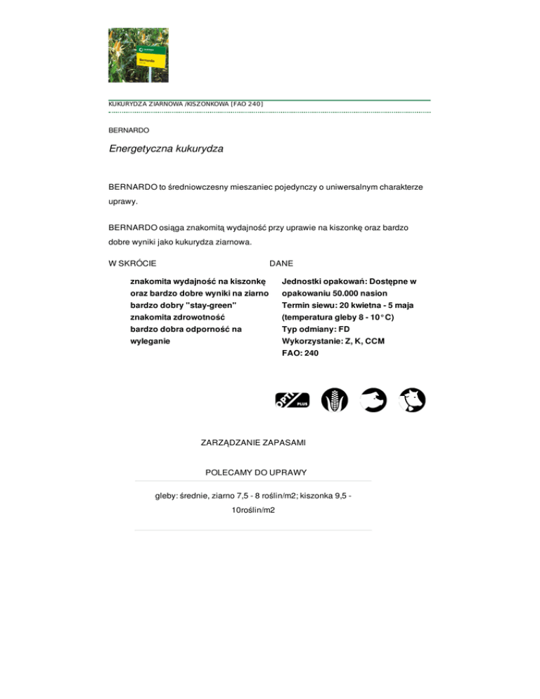 KUKURYDZA ZIARNOWA /KISZONKOWA [FAO 240] BERNARDO Energetyczna kukurydza BERNARDO to średniowczesny mieszaniec pojedynczy o uniwersalnym charakterze uprawy. BERNARDO osiąga znakomitą wydajność przy uprawie na kiszonkę oraz bardzo dobre wyniki jako kukurydza ziarnowa. W SKRÓCIE DANE znakomita wydajność na kiszonkę Jednostki opakowań: Dostępne w oraz bardzo dobre wyniki na ziarno opakowaniu 50.000 nasion bardzo dobry "stay-green" Termin siewu: 20 kwietna - 5 maja znakomita zdrowotność (temperatura gleby 8 - 10°C) bardzo dobra odporność na Typ odmiany: FD wyleganie Wykorzystanie: Z, K, CCM FAO: 240 ZARZĄDZANIE ZAPASAMI POLECAMY DO UPRAWY gleby: średnie, ziarno 7,5 - 8 roślin/m2; kiszonka 9,5 10roślin/m2