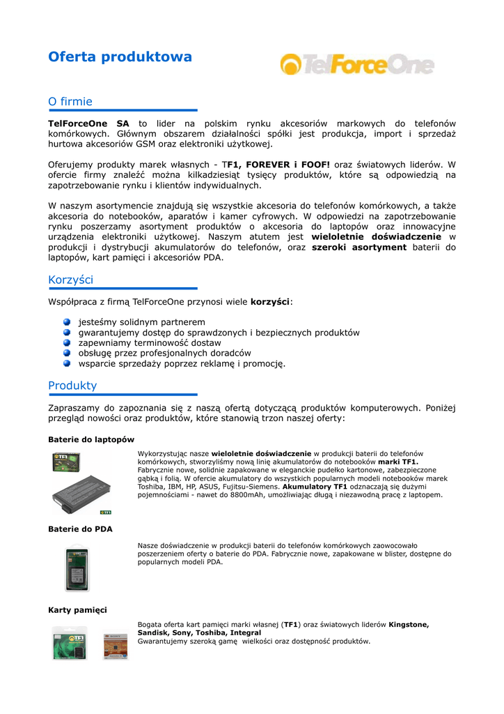 Oferta produktowa O firmie TelForceOne SA to lider na polskim rynku akcesoriów markowych do telefonów komórkowych. Głównym obszarem działalności spółki jest produkcja, import i sprzedaż hurtowa akcesoriów GSM oraz elektroniki użytkowej. Oferujemy produkty marek własnych - TF1, FOREVER i FOOF! oraz światowych liderów. W ofercie firmy znaleźć można kilkadziesiąt tysięcy produktów, które są odpowiedzią na zapotrzebowanie rynku i klientów indywidualnych. W naszym asortymencie znajdują się wszystkie akcesoria do telefonów komórkowych, a także akcesoria do notebooków, aparatów i kamer cyfrowych. W odpowiedzi na zapotrzebowanie rynku poszerzamy asortyment produktów o akcesoria do laptopów oraz innowacyjne urządzenia elektroniki użytkowej. Naszym atutem jest wieloletnie doświadczenie w produkcji i dystrybucji akumulatorów do telefonów, oraz szeroki asortyment baterii do laptopów, kart pamięci i akcesoriów PDA. Korzyści Współpraca z firmą TelForceOne przynosi wiele korzyści: jesteśmy solidnym partnerem gwarantujemy dostęp do sprawdzonych i bezpiecznych produktów zapewniamy terminowość dostaw obsługę przez profesjonalnych doradców wsparcie sprzedaży poprzez reklamę i promocję. Produkty Zapraszamy do zapoznania się z naszą ofertą dotyczącą produktów komputerowych. Poniżej przegląd nowości oraz produktów, które stanowią trzon naszej oferty: Baterie do laptopów Wykorzystując nasze wieloletnie doświadczenie w produkcji baterii do telefonów komórkowych, stworzyliśmy nową linię akumulatorów do notebooków marki TF1. Fabrycznie nowe, solidnie zapakowane w eleganckie pudełko kartonowe, zabezpieczone gąbką i folią. W ofercie akumulatory do wszystkich popularnych modeli notebooków marek Toshiba, IBM, HP, ASUS, Fujitsu-Siemens. Akumulatory TF1 odznaczają się dużymi pojemnościami - nawet do 8800mAh, umożliwiając długą i niezawodną pracę z laptopem. Baterie do PDA Nasze doświadczenie w produkcji baterii do telefonów komórkowych zaowocowało poszerzeniem oferty o baterie do PDA. Fabrycznie nowe, zapakowane w blister, dostępne do popularnych modeli PDA. Karty pamięci Bogata oferta kart pamięci marki własnej (TF1) oraz światowych liderów Kingstone, Sandisk, Sony, Toshiba, Integral Gwarantujemy szeroką gamę wielkości oraz dostępność produktów. Bramka VOIP Bramka skonfigurowana i gotowa do połączeń zaraz po podłączeniu. Funkcjonalność: współpraca z dowolnym operatorem SIP, 2 porty FXS - możliwość podłączenia 2 telefonów analogowych, 1 port do podłączenia Internetu (FastEthernet RJ-45), kompatybilność z każdą siecią, bez sim-locka, obsługa DHCP lub stałego IP, Nie wymaga publicznego adresu IP (praca za NAT), intuicyjna konfiguracja poprzez przeglądarkę www lub telefon. Routery Coraz bardziej modne stają się urządzenia pracujące bezprzewodowo - nie tylko notebooki i palmtopy, ale również sprzęt RTV, taki jak telewizory, wieże i odtwarzacze filmów. W takim wypadku najlepiej wykorzystać router zarówno do podłączenia do Sieci, jak i w celu zapewnienia bezprzewodowej łączności w domu. Pendrive z czytnikiem linii papilarnych Z bogatej oferty pamięci przenośnych USB proponujemy pendrive 2GB z czytnikiem linii papilarnych, posiada wysoce zaawansowany technologicznie czytnik biometryczny. Szyfrowanie/deszyfrowanie danych algorytmem AES z 256 bitowym kluczem. Technologia AIAC (Advanced Image Auto-Calibration) umożliwiająca wyraźne skanowanie odcisku bez różnicy, czy palec jest wilgotny czy suchy. Dioda LED sygnalizująca pracę urządzenia. Współpracuje z Windows Vista / XP / 2000. Prezenter multimedialny Bezprzewodowy prezenter multimedialny, działający w paśmie 2,4 GHz pomaga efektywnie sterować pokazem. Posiada 15-metrowy zasięg bezprzewodowej komunikacji. Niepotrzebne żadne oprogramowanie. W jednym ręku wszystkie stery: pokaz slajdów i wskaźnik laserowy. Miniodbiornik mieści się w urządzeniu, obsługa wysokiej jakości kodeków, Myszka na palec Myszka optyczna „na palec” podłączana do gniazda USB, czułość 800dpi, układ przycisków jak w standardowej myszce (lewy, prawy, przewijanie), posiada miękkie oraz regulowane zamocowanie do palca przez co jest wygodna i komfortowa w użyciu, długość kabla ok.1m, kompatybilna z systemami: Win98/Me/2000/XP/Vista. Produkty GSM Zachęcamy także do zapoznania się z ofertą naszych produktów GSM: Ładowarki TF1 HQ Doświadczenie w produkcji ładowarek do telefonów komórkowych pozwala nam wciąż udoskonalać nasza ofertę aby spełniać oczekiwania naszych klientów. HQ marki TF1 to nasz nowy produkt, ładowarka impulsowa najwyższej jakości. Zapewnia efektywne ładowanie zgodne z parametrami podanymi przez producentów telefonów. Ładowarka HQ TF1 to nowoczesny i bezpieczny sposób ładowania. Karta Turbo Sim Z licznej gamy akcesoriów GSM proponujemy kartę turbo SIM. Karta, ta pozwala na ominięcie blokady SimLock. Atutem karty jest fakt, iż po jej użyciu gwarancja na telefon nie zostaje naruszona. Zestaw słuchawkowy stereo TF1! Eleganckie, smukłe słuchawki w kolorze srebrnym sprawiają, że zestaw wygląda dyskretnie i szlachetnie. Zestaw posiada panel z wbudowanym mikrofonem do odbierania i kończenia rozmów, co zapewnia niezwykłą wygodę użytkowania. Specjalny klip umożliwia przypięcie do ubrania, natomiast długi kabel gwarantuje komfortowe korzystanie z telefonu. Zestaw jest niezwykle lekki i niekrępujący ruchów. Zapraszamy do współpracy Pełen asortyment naszych produktów dostępny jest w naszym sklepie internetowym na www.telforcone.pl*. Jeżeli są Państwo zainteresowani współpracą to proszę o kontakt. Monika Jagielska Konsultant ds.sprzedaży tel. +48 71 7177084 fax. +48 71 3272090 gg 10398485 [email protected] *ceny widoczne przed zalogowaniem są cenami detalicznymi. Ceny hurtowe dostępne są po zalogowaniu.