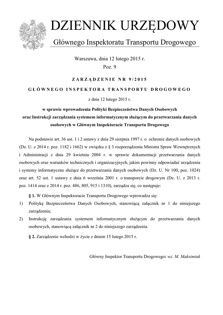 zarządzenie nr 9/2015 Głównego Inspektora Transportu Drogowego