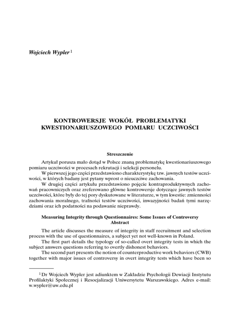 Wojciech Wypler 1 KONTROWERSJE WOKÓŁ PROBLEMATYKI KWESTIONARIUSZOWEGO POMIARU UCZCIWOŚCI Streszczenie Artykuł porusza mało dotąd w Polsce znaną problematykę kwestionariuszowego pomiaru uczciwości w procesach rekrutacji i selekcji personelu. W pierwszej jego części przedstawiono charakterystykę tzw. jawnych testów uczciwości, w których badany jest pytany wprost o nieuczciwe zachowania. W drugiej części artykułu przedstawiono pojęcie kontraproduktywnych zachowań pracowniczych oraz zreferowano główne kontrowersje dotyczące jawnych testów uczciwości, które były do tej pory dyskutowane w literaturze, w tym kwestie: zmienności zachowania moralnego, trafności testów uczciwości, inwazyjności badań tymi narzędziami oraz ich podatności na podawanie nieprawdy. Measuring Integrity through Questionnaires: Some Issues of Controversy Abstract The article discusses the measure of integrity in staff recruitment and selection process with the use of questionnaires, a subject yet not well-known in Poland. The first part details the typology of so-called overt integrity tests in which the subject answers questions referring to overtly dishonest behaviors. The second part presents the notion of counterproductive work behaviors (CWB) together with major issues of controversy in overt integrity tests which have been so 1 Dr Wojciech Wypler jest adiunktem w Zakładzie Psychologii Dewiacji Instytutu Profilaktyki Społecznej i Resocjalizacji Uniwersytetu Warszawskiego. Adres e-mail: [email protected] 54 Wojciech Wypler far discussed in the literature, including the lability of moral behavior, the validity of integrity tests, the invasiveness of testing with such tools and their susceptibility to give biased results. Wprowadzenie Współcześnie obserwuje się, że instytucje państwowe, przedsiębiorstwa oraz prywatne osoby oczekują od partnerów interakcji uczciwości, którą do pewnego stopnia wstępnie zakładają, ale którą również starają się sprawdzać. Odpowiedzią na to w obrębie psychologii są poszukiwania zarówno teoretyczne, jak i praktyczne. Psychologia sądowa odpowiadając na potrzeby wymiaru sprawiedliwości usiłuje dostarczać coraz bardziej rzetelnych metod oceny prawdziwości zeznań przesłuchiwanych świadków. Psychologia pracy i organizacji zajmuje się badaniami nad możliwościami przewidywania uczciwości, zaangażowania oraz ryzyka podejmowania przez kandydatów na pracowników zachowań, które mogą szkodzić ich organizacjom i innym pracownikom. Branża systemów bezpieczeństwa prowadzi badania nad systemami technicznymi, które umożliwią masowe monitorowanie ludzkich zachowań i fizjologii w celu wykrywania zmian w poziomie pobudzenia świadczącym o przeżywanym stresie, który może towarzyszyć kłamstwu lub zwiastować możliwość agresji (Rosenblatt 2008). Psychologia rozwojowa zajmuje się zachowaniami moralnymi dzieci, a psychologia wychowawcza kłamstwem jako problemem wychowawczym. Na rynku szkoleń i usług psychologicznych coraz liczniej pojawiają się takie, na których zainteresowane osoby mogą uczyć się metod wykrywania kłamstwa oraz ćwiczyć nowe sposoby komunikowania, które mają podnieść ich wiarygodność w relacjach z innymi. Omawiane w literaturze przedmiotu psychologiczne metody wykrywania kłamstwa oraz oceny uczciwości można podzielić na następujące grupy: • Obserwowanie zachowania niewerbalnego • Analiza treści mowy • Badanie reakcji fizjologicznych (por. Vrij 2009) • Techniki kwestionariuszowe. Zagadnienie kwestionariuszowego pomiaru uczciwości dotyczy prawie w całości mało znanych w Polsce badań rzetelno- Kontrowersje wokół problematyki kwestionariuszowego pomiaru… 55 ści oraz etyki zawodowej w procesach rekrutacji i selekcji personelu. Kwestionariuszowe metody pomiaru uczciwości można podzielić na: • Pomiary zorientowane na osobowość oraz • Jawne testy uczciwości (Berry, Sackett i Wiemann 2007, Witkowski 2007). W pierwszym wypadku chodzi o kwestionariusze psychologiczne, które badają szerszy zakres zmiennych osobowościowych związanych z funkcjonowaniem zawodowym i nie są bezpośrednio ukierunkowane na pomiar uczciwości, natomiast umożliwiają badanie zmiennych z uczciwością związanych, takich jak sumienność, dostosowanie społeczne, itp. Przykładem może być Kwestionariusz Reakcji Personelu 2 (Personnel Reaction Blank), Inwentarz Pracowniczy (PDI Employment Inventory), czy Skala Niezawodności (Reliability Scale) z Kwestionariusza Osobowości Hogana (Hogan Personality Inventory; por. Witkowski 2006, Berry, Sackett i Wiemann 2007, Hoffman 2008). W swoich rozważaniach zajmuję się jedynie kwestionariuszowymi technikami o charakterze jawnym, w których badany jest pytany otwarcie i wprost o nieuczciwe zachowania. Narzędzia tego rodzaju, bardzo popularne w Stanach Zjednoczonych, stały się odpowiedzią na dostrzegane przez amerykańskich pracodawców koszty wynikające z kradzieży popełnianych przez pracowników. Należy zaznaczyć, że zjawisko kradzieży popełnianych przez pracowników jest rozumiane szeroko i dotyczy pracowników wszystkich szczebli zatrudnienia działających na szkodę swoich organizacji, m.in. sprzedawców wykradających towar, pracowników administracji wynoszących do domu materiały i urządzenia biurowe, przedstawicieli handlowych fałszujących koszty podróży służbowych, konsultantów zawyżających czas swojej pracy, czy wreszcie menedżerów defraudujących znaczne kwoty w ramach budżetów, którymi dysponują. Szacunkowe roczne straty ponoszone przez organizacje w związku z kradzieżami oraz innego rodzaju nieuczciwymi działaniami popełnianymi przez pracowników w Stanach Zjednoczonych mierzy się w miliardach 2 Tłumaczenia nazw amerykańskich testów i kwestionariuszy zostały dostosowane do tych, które przedstawiono w książce Edwarda Hoffmana pt. „Ocena psychologiczna pracowników” (2008). 56 Wojciec