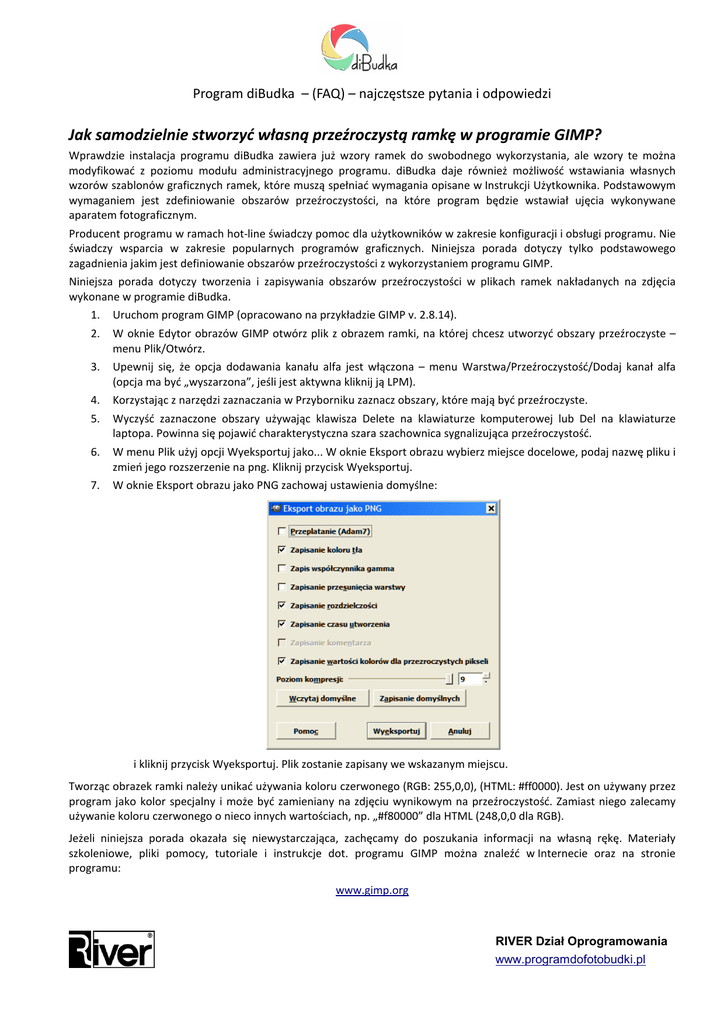 Program diBudka – (FAQ) – najczęstsze pytania i odpowiedzi Jak samodzielnie stworzyć własną przeźroczystą ramkę w programie GIMP? Wprawdzie instalacja programu diBudka zawiera już wzory ramek do swobodnego wykorzystania, ale wzory te można modyfikować z poziomu modułu administracyjnego programu. diBudka daje również możliwość wstawiania własnych wzorów szablonów graficznych ramek, które muszą spełniać wymagania opisane w Instrukcji Użytkownika. Podstawowym wymaganiem jest zdefiniowanie obszarów przeźroczystości, na które program będzie wstawiał ujęcia wykonywane aparatem fotograficznym. Producent programu w ramach hot-line świadczy pomoc dla użytkowników w zakresie konfiguracji i obsługi programu. Nie świadczy wsparcia w zakresie popularnych programów graficznych. Niniejsza porada dotyczy tylko podstawowego zagadnienia jakim jest definiowanie obszarów przeźroczystości z wykorzystaniem programu GIMP. Niniejsza porada dotyczy tworzenia i zapisywania obszarów przeźroczystości w plikach ramek nakładanych na zdjęcia wykonane w programie diBudka. 1. Uruchom program GIMP (opracowano na przykładzie GIMP v. 2.8.14). 2. W oknie Edytor obrazów GIMP otwórz plik z obrazem ramki, na której chcesz utworzyć obszary przeźroczyste – menu Plik/Otwórz. 3. Upewnij się, że opcja dodawania kanału alfa jest włączona – menu Warstwa/Przeźroczystość/Dodaj kanał alfa (opcja ma być „wyszarzona”, jeśli jest aktywna kliknij ją LPM). 4. Korzystając z narzędzi zaznaczania w Przyborniku zaznacz obszary, które mają być przeźroczyste. 5. Wyczyść zaznaczone obszary używając klawisza Delete na klawiaturze komputerowej lub Del na klawiaturze laptopa. Powinna się pojawić charakterystyczna szara szachownica sygnalizująca przeźroczystość. 6. W menu Plik użyj opcji Wyeksportuj jako... W oknie Eksport obrazu wybierz miejsce docelowe, podaj nazwę pliku i zmień jego rozszerzenie na png. Kliknij przycisk Wyeksportuj. 7. W oknie Eksport obrazu jako PNG zachowaj ustawienia domyślne: i kliknij przycisk Wyeksportuj. Plik zostanie zapisany we wskazanym miejscu. Tworząc obrazek ramki należy unikać używania koloru czerwonego (RGB: 255,0,0), (HTML: #ff0000). Jest on używany przez program jako kolor specjalny i może być zamieniany na zdjęciu wynikowym na przeźroczystość. Zamiast niego zalecamy używanie koloru czerwonego o nieco innych wartościach, np. „#f80000” dla HTML (248,0,0 dla RGB). Jeżeli niniejsza porada okazała się niewystarczająca, zachęcamy do poszukania informacji na własną rękę. Materiały szkoleniowe, pliki pomocy, tutoriale i instrukcje dot. programu GIMP można znaleźć w Internecie oraz na stronie programu: www.gimp.org RIVER Dział Oprogramowania www.programdofotobudki.pl