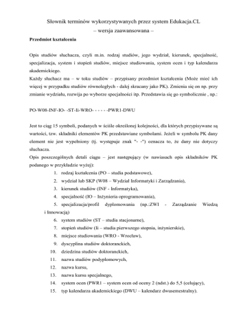 Słownik terminów wykorzystywanych przez system Edukacja.CL – wersja zaawansowana – Przedmiot kształcenia Opis studiów słuchacza, czyli m.in. rodzaj studiów, jego wydział, kierunek, specjalność, specjalizacja, system i stopień studiów, miejsce studiowania, system ocen i typ kalendarza akademickiego. KaŜdy słuchacz ma – w toku studiów – przypisany przedmiot kształcenia (MoŜe mieć ich więcej w przypadku studiów równoległych - dalej skracany jako PK). Zmienia się on np. przy zmianie wydziału, rozwija po wyborze specjalności itp. Przedstawia się go symbolicznie , np.: PO-W08-INF-IO- -ST-Ii-WRO- - - - - -PWR1-DWU Jest to ciąg 15 symboli, podanych w ściśle określonej kolejności, dla których przypisywane są wartości, tzw. składniki elementów PK przedstawiane symbolami. JeŜeli w symbolu PK dany element nie jest wypełniony (tj. występuje znak "- -") oznacza to, Ŝe dany nie dotyczy słuchacza. Opis poszczególnych detali ciągu – jest następujący (w nawiasach opis składników PK podanego w przykładzie wyŜej): 1. rodzaj kształcenia (PO – studia podstawowe), 2. wydział lub SKP (W08 – Wydział Informatyki i Zarządzania), 3. kierunek studiów (INF - Informatyka), 4. specjalność (IO – InŜynieria oprogramowania), 5. specjalizacja/profil dyplomowania (np.:ZWI - Zarządzanie Wiedzą i Innowacją) 6. system studiów (ST – studia stacjonarne), 7. stopień studiów (Ii – studia pierwszego stopnia, inŜynierskie), 8. miejsce studiowania (WRO - Wrocław), 9. dyscyplina studiów doktoranckich, 10. dziedzina studiów doktoranckich, 11. nazwa studiów podyplomowych, 12. nazwa kursu, 13. nazwa kursu specjalnego, 14. system ocen (PWR1 – system ocen od oceny 2 (ndst.) do 5,5 (celujący), 15. typ kalendarza akademickiego (DWU – kalendarz dwusemestralny). Wiązka PN/PS Zestaw programów nauczania (PN) i planów studiów (PS) odpowiadających poszczególnym specjalnościom (i specjalizacjom) dla danego całego kierunku studiów, realizowanych na danym wydziale, w ramach ustalonego systemu i stopnia studiów i które dotyczą danego słuchacza. KaŜdy słuchacz ma, po rozpoczęciu studiów, przypisany odpowiedni przedmiot kształcenia (m.in. opisujący wydział, kierunek studiów, system i stopień studiów) oraz wiązkę PN/PS Zawiera ona wszystkie programy nauczania i plany studiów dostępne temu słuchaczowi. Odpowiadają one wszystkim specjalnościom (specjalizacjom), o ile takie istnieją na tym kierunku studiów. W przypadku braku specjalności przypisuje się wiązkę PN/PS składającą się tylko z jednego PN i PS odpowiadającego temu kierunkowi studiów. Wiązka PN/PS moŜe być standardowa lub zindywidualizowana i słuŜy głównie do oceny dorobku akademickiego słuchacza w toku jego studiów. W przypadku np. wyboru specjalności przez słuchacza, w przypisanej mu wiązce PN/PS następuje uaktywnienie „gałęzi” PN/PS odpowiadających tej specjalności. Rozliczenie (bilans) dorobku akademickiego odbywa się wg aktywnej części wiązki. Punkty ECTS Liczba punktów ECTS (European Credit Transfer System), przypisana jest danemu kursowi (grupie kursów) w semestrze. Odzwierciedla po przeliczeniu tzw. „Całkowity Nakład Pracy Słuchacza” niezbędny do realizacji i zaliczenia danego kursu (grupy kursów). Przyjmuje się, Ŝe ok. 30 godz. CNPS odpowiada jednemu punktowi (kredytowemu) ECTS, Ŝe łączna liczba punktów przewidziana planem studiów dla kaŜdego semestru studiów wynosi od 27 do 33, a dla roku akademickiego co najmniej 60 punktów. Punkty ECTS, w ramach stosowanego systemu punktowego ECTS, przyznaje się słuchaczowi po zaliczeniu danego kursu (grupy kursów), niezaleŜnie od uzyskanej oceny. Dają one moŜliwość sterowania swoim tokiem studiów poprzez swobodę przy wyborze części kursów do realizacji w danym semestrze oraz zachowania odpowiedniego tempa edukacji. Stanowią one podstawę do oceny dorobku akademickiego słuchacza słuŜąc do wyznaczania semestralnego deficytu punktowego (opóźnienia lub przyśpieszenia w realizacji planu studiów) i konfrontacji tego deficytu z tzw. dopuszczalnym deficytem punktowym. Ma to istotny wpływ na uzyskanie wpisu na kolejny semestr. Do zrealizowania programu nauczania i ukończenia studiów wymagana jest liczba punktów ECTS równa co najmniej iloczynowi, liczby semestrów w planie studiów i liczby 30, np. dla 7 semestralnych studiów I stopnia jest to 210 punktów. Godziny ZZU Liczba godzin (Zajęć Zorganizowanych na Uczelni) danego kursu w semestrze. Liczba godzin dydaktycznych (45 min) ZZU (Zajęć Zorganizowanych na Uczelni) danego kursu w semestrze, przypisana temu kursowi, jak równieŜ liczba godzin dla prowadzącego dany kurs w semestrze, wymagana do zrealizowania programu kursu. Do godzin ZZU nie wlicza się godzin pracy własnej słuchacza na Uczelni i poza nią, a takŜe czasu przeznaczonego np. na składanie egzaminów. Zajęcia Zorganizowane na Uczelni mają przypisane terminy, salę, prowadzącego kurs i są ogłaszane w semestralnych rozkładach zajęć. Na zajęcia te (na kursy) słuchacze dokonują zapisów przed rozpoczęciem semestru. W przypadku powtarzania kursu, liczba godzin ZZU stanowi podstawę do naliczania właściwych opłat. Godziny CNPS Liczba godzin CNPS (Całkowity Nakład Pracy Słuchacza) przewidziana do zrealizowania oraz zaliczenia danego kursu (grupy kursów) w semestrze. Liczba godzin CNPS (Całkowity Nakład Pracy Słuchacza) przewidziana - w planie studiów i programie nauczania – do zrealizowania oraz zaliczenia, danego kursu (grupy kursów) w semestrze. Do godzin CNPS wlicza się liczbę godzin zajęć zorganizowanych na Uczelni (godziny ZZU) danego kursu i oferowanych słuchaczowi w rozkładzie zajęć, a takŜe pracę własną słuchacza (studenta) na Uczelni i poza nią, przeznaczoną na przygotowanie się do zajęć zorganizowanych. Do godzin tych wlicza się równieŜ czas przeznaczany na przygotowanie się słuchacza