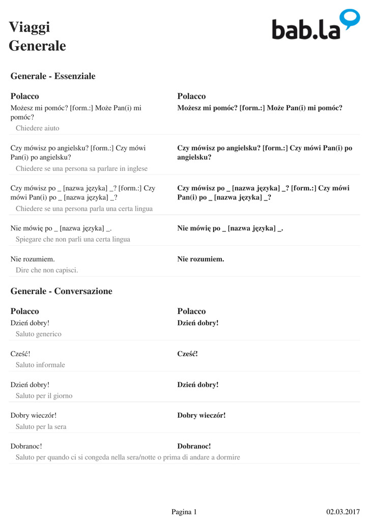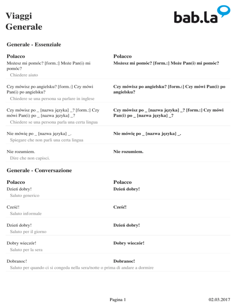 Viaggi Generale Generale - Essenziale Polacco Polacco Możesz mi pomóc? [form.:] Może Pan(i) mi pomóc? Chiedere aiuto Możesz mi pomóc? [form.:] Może Pan(i) mi pomóc? Czy mówisz po angielsku? [form.:] Czy mówi Pan(i) po angielsku? Chiedere se una persona sa parlare in inglese Czy mówisz po angielsku? [form.:] Czy mówi Pan(i) po angielsku? Czy mówisz po _ [nazwa języka] _? [form.:] Czy mówi Pan(i) po _ [nazwa języka] _? Chiedere se una persona parla una certa lingua Czy mówisz po _ [nazwa języka] _? [form.:] Czy mówi Pan(i) po _ [nazwa języka] _? Nie mówię po _ [nazwa języka] _. Spiegare che non parli una certa lingua Nie mówię po _ [nazwa języka] _. Nie rozumiem. Dire che non capisci. Nie rozumiem. Generale - Conversazione Polacco Polacco Dzień dobry! Saluto generico Dzień dobry! Cześć! Saluto informale Cześć! Dzień dobry! Saluto per il giorno Dzień dobry! Dobry wieczór! Saluto per la sera Dobry wieczór! Dobranoc! Dobranoc! Saluto per quando ci si congeda nella sera/notte o prima di andare a dormire Pagina 1 02.03.2017 Viaggi Generale Jak się masz? [form.:] Jak się Pan(i) ma? Jak się masz? [form.:] Jak się Pan(i) ma? Modo educato per informarsi sulla salute dell'interlocutore Dobrze, dziękuję. Risposta educata per 'come va?' Dobrze, dziękuję. Jak się nazywasz? [form.:] Jak się Pan(i) nazywa? Chiedere il nome dell'interlocutore Jak się nazywasz? [form.:] Jak się Pan(i) nazywa? Nazywam się ___. Dire il tuo nome a qualcuno Nazywam się ___. Skąd pochodzisz? [form.:] Skąd Pan(i) pochodzi? Chiedere la provenienza di una persona Skąd pochodzisz? [form.:] Skąd Pan(i) pochodzi? Pochodzę z ___. Dire da dove vieni Pochodzę z ___. Ile masz lat? [form.:] Ile ma Pan(i) lat? Chiedere l'età di una persona Ile masz lat? [form.:] Ile ma Pan(i) lat? Mam ___ lat(a). Dire quanti anni hai Mam ___ lat(a). Tak Risposta positiva Tak Nie Risposta negativa Nie Proszę Parola da aggiungere per essere più cortese Proszę Proszę bardzo! Usato quando si dà qualcosa a qualcuno Proszę bardzo! Dziękuję. Ringraziare qualcuno Dziękuję. Pagina 2 02.03.2017 Viaggi Generale Dziękuję bardzo. Ringraziare qualcuno in modo sentito Dziękuję bardzo. Proszę bardzo! / Nie ma za co! Risposta educata per un 'grazie' Proszę bardzo! / Nie ma za co! Przepraszam. Scusarsi per qualcosa Przepraszam. Przepraszam. Richiamare l'attenzione di qualcuno Przepraszam. Nic się nie stało. Accettare delle scuse Nic się nie stało. Nie ma sprawy. Accettare delle scuse Nie ma sprawy. Uwaga! Avvertire qualcuno di un pericolo Uwaga! Jestem głodny/-a. Usato quando si ha fame Jestem głodny/-a. Chce mi się pić. Usato quando si ha sete Chce mi się pić. Jestem zmęczony/-a. Usato quando ci si sente stanchi Jestem zmęczony/-a. Źle się czuję. Usato quando ci si sente male Źle się czuję. Nie wiem. Non sai la risposta ad una domanda Nie wiem. Miło było cię poznać. [form.:] Miło było Panią/Pana poznać. Modo educato per salutarsi dopo un primo incontro Miło było cię poznać. [form.:] Miło było Panią/Pana poznać. Pagina 3 02.03.2017 Viaggi Generale Do widzenia! Saluto di congedo Do widzenia! Generale - Reclami Polacco Polacco Chciał(a)bym złożyć skargę. Modo educato per iniziare il tuo reclamo Chciał(a)bym złożyć skargę. Kto tu rządzi? Chiedere chi è il responsabile Kto tu rządzi? To jest absolutnie niedopuszczalne! Esprimere con forza la propria insoddisfazione To jest absolutnie niedopuszczalne! Żądam zwrotu pieniędzy! Chiedere la restituzione del proprio denaro Żądam zwrotu pieniędzy! Czekamy ponad godzinę. Lamentarsi dei lunghi tempi d'attesa Czekamy ponad godzinę. Generale - Imprecazioni Polacco Polacco To jedzenie smakuje jak gówno! Modo maleducato di espremere disgusto per il cibo To jedzenie smakuje jak gówno! Ten napój/drink smakuje jak szczyny! Ten napój/drink smakuje jak szczyny! Modo maleducato per esprimere disgusto per una bibita To miejsce to obrzydliwa nora! To miejsce to obrzydliwa nora! Modo maleducato di esprimere disgusto per un posto Ten samochód to wrak! Ten samochód to wrak! Modo maleducato di esprimere disgusto per una macchina Obsługa jest do dupy! Obsługa jest do dupy! Modo maleducato per esprimere disgusto per il servizio Pagina 4 02.03.2017 Viaggi Generale To jest totalne zdzierstwo! Lamentarsi in modo maleducato di un prezzo alto To jest totalne zdzierstwo! Gówno prawda! Gówno prawda! Modo maleducato per dire che non si crede a qualcosa che qualcuno ha detto Kretyn/Kretynka! Insultare qualcuno per la sua scarsa intelligenza Kretyn/Kretynka! Gówno wiesz! Insultare qualcuno per la sua scarsa conoscenza Gówno wiesz! Odwal się! Odwal się! Dire a qualcuno di sparire immediatamente in malo modo Załatwmy to na zewnątrz! Załatwmy to na zewnątrz! Chiedere a una persona di combattere fuori da un edificio Pagina 5 Powered by TCPDF (www.tcpdf.org) 02.03.2017