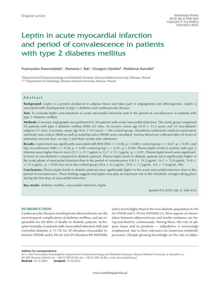 Kardiologia Polska 2010; 68, 6: 648–653 Copyright © Via Medica ISSN 0022–9032 Original article Leptin in acute myocardial infarction and period of convalescence in patients with type 2 diabetes mellitus Przemysław Krasnodębski1, Marianna I. Bąk1, Grzegorz Opolski2, Waldemar Karnafel1 1Department of Gastroenterology and Metabolic Diseases, Warsaw Medical University, Warsaw, Poland 21st Department of Cardiology, Warsaw Medical University, Warsaw, Poland Abstract Background: Leptin is a protein produced in adipose tissue and takes part in angiogenesis and atherogenesis. Leptin is associated with development of type 2 diabetes and cardiovascular disease. Aim: To evaluate leptin concentrations in acute myocardial infarction and in the period of convalescence in patients with type 2 diabetes mellitus. Methods: Coronary angiography was performed in 58 patients with acute myocardial infarction. The study group comprised 35 patients with type 2 diabetes mellitus (DM) (25 men, 10 women, mean age 63.8 ± 11.5 years) and 23 non-diabetic subjects (17 men, 6 women, mean age 58.6 ± 9.9 years) — the control group. All patients underwent medical examination and body mass indices (BMI) as well as waist/hip ratios (WHR) were calculated. Venous blood was collected after 24 hours of admission (second day), on day 5 and three weeks after admission. Results: Leptin level was significantly associated with BMI (DM: r = 0.46, p = 0.005; control group: r = 0.67, p < 0.01), and hip circumference (DM: r = 0.28, p = 0.09; control group: r = 0.41, p = 0.04). Plasma leptin levels in women with type 2 diabetes were higher than in men (32.1 ± 11.7 µg/mL vs 12.7 ± 11.2 µg/mL, p < 0.01). Plasma leptin levels were significantly lower in non-diabetics compared to diabetic patients. Plasma leptin levels in diabetic patients were significantly higher in the acute phase of myocardial infarction than in the period of convalescence (18.3 ± 14.3 µg/mL, 16.1 ± 12.8 µg/mL, 14.8 ± ± 11.2 µg/mL, p = 0.02) but not in the control group (10.6 ± 8.2 µg/mL, 10.0 ± 7.3 µg/mL, 9.6 ± 7.0 µg/mL, NS). Conclusions: Plasma leptin levels in diabetic patients were significantly higher in the acute myocardial infarction than in the period of convalescence. These findings suggests that leptin may play an important role in the metabolic changes taking place during the first days of myocardial infarction. Key words: diabetes mellitus, myocardial infarction, leptin Kardiol Pol 2010; 68, 6: 648–653 INTRODUCTION Cardiovascular diseases resulting from atherosclerosis are the most frequent complications of diabetes mellitus, and are responsible for 60–80% of deaths in diabetic patients. In-hospital mortality in patients with myocardial infarction (MI) and comorbid diabetes is 11.7% for ST-elevation myocardial infarction (STEMI) and 6.3% for non-ST-elevation MI (NSTEMI), and is much higher than in the non-diabetic population (6.4% for STEMI and 5.1% for NSTEMI) [1]. New aspects of interrelation between atherosclerosis and insulin resistance are being searched for continuously. Among these, the role of adipose tissue and its products — adipokines, is increasingly emphasised, due to their relevance for numerous metabolic processes. Despite growing knowledge on the role of adipo- Address for correspondence: dr n. med. Przemysław Krasnodębski, Department of Gastroenterology and Metabolic Diseases, Warsaw Medical University, ul. Banacha 1a, 02–097 Warsaw, Poland, tel: +48 22 599 28 38, fax: +48 22 599 18 38, e-mail: [email protected] Received Accepted Received: 19.12.2009 Accepted: 10.03.2010 www.kardiologiapolska.pl 649 Leptin in acute myocardial infarction cytokines, their direct effects on the pathogenesis of acute coronary syndromes are still difficult to define. Leptin is one of the adipocytokines produced by white adipose tissue, although its synthesis was also detected in the hypophysis, placenta, breasts, skeletal muscles and gastric mucosa [2]. Leptin is a protein of molecular weight of 16 kD, consisting of 167 aminoacids, and its levels are dependent on the amount of adipose tissue and size of adipocytes. Leptin secretion has its diurnal variation with circa 32 pulses, peaking during nighttime, and is greater in women [2]. Leptin synthesis is stimulated by insulin, estrogens, corticosteroids and TNF-a [2, 3]. Conversely, the growth hormone, testosterone and long fasting reduce leptin secretion. In non-diabetic patients a significant correlation was found between leptin concentration and insulin resistance as measured by HOMA-IR index four months after MI [4]. Leptin effects on haematopoesis and angiogenesis through stimulation of proliferation and migration of endothelial cells have also been demonstrated [5] thus promoting plaque growth. Among US inhabitants, higher leptin concentrations were found in patients with a history of MI or stroke [6]. The aim of the study was to analyse the dynamic leptin concentration changes in acute phase of MI and during the period of convalescence in type 2 diabetic patients. METHODS Study group Fifty-eight patients admitted to hospital for acute MI at the end of 2005 and at the beginning of 2006 were included in the study. Thirty-five patients with at least 6-month history of diabetes formed the study group. The control group consisted of 23 patients in whom no glucose tolerance disorders were diagnosed. In these patients, impairment of glucose tolerance was additionally excluded on the basis of glucose tolerance test carried out on day 21 from symptom onset. Only patients with ECG and biochemical criteria of MI and time from symptom onset < 12 hours were included in the study. The study protocol was approved by the local bioethical committee. All patients gave their informed written consent. In all patients coronary angiography was carried out and in patients with significant coronary stenosis — primary coronary angioplasty was performed. Table 1 presents comparison of demograph