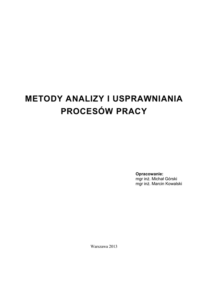 METODY ANALIZY I USPRAWNIANIA PROCESÓW PRACY Opracowanie: mgr inż. Michał Górski mgr inż. Marcin Kowalski Warszawa 2013 LITERATURA 1. Liker J. K.: Droga Toyoty. MT Biznes, Warszawa 2005 2. Muhlemann A. P., Oakland J. S., Locker K. G.: Zarządzanie. Produkcja i usługi. PWN, Warszawa 2001 3. Rother M., Shook J..: Naucz się widzieć. Lean Enterprise Institute, USA 2001 4. Rother M., Harris R.: Tworzenie ciągłego przepływu. Lean Enterprise Institute, USA 2001 5. Wilson E.., Harris R.: Doskonalenie przepływu materiałów. Lean Enterprise Institute, USA 2001 6. Womack J.P, Jones D.T: Odchudzanie firm. Eliminacja marnotrawstwa kluczem do sukcesu. Centrum Informacji Menedżera, Warszawa 2001 7. Waters D.: Zarządzanie operacyjne. PWN, Warszawa 2001 8. Bieniok H.: Metody sprawnego zarządzania. PLACET, Warszawa 1997 9. Brzeziński M.: Organizacja i sterowanie produkcją. PLACET, Warszawa 2002 10. Burchart D.: Zarządzanie produkcją I usługami. WPŚ, Gliwice 2007 11. Durlik I.: Inżynieria zarządzania cz. I. PLACET, Gdańsk 1993 1. WSTĘP – Podstawowe pojęcia • • • Produktywność - stosunek wielkości produkcji wytworzonej i sprzedanej (Wy) w rozpatrywanym okresie do ilości wykorzystanych zasobów (We) Skuteczność – Miara osiągania celów postawionych przez organizacją Wydajność – Zdolność do wytworzenia lub czynienia tego co wymaga klient 79 • 4 METODY POPRAWY PRODUKTYWNOŚCI: 1. Poprawianie wydajności – Stosujmy mniejsze nakłady, aby osiągnąć te same efekty 2. Inne metody – Lepsza Jakość, mniejsza wypadkowość (BHP),mniejsza liczba zakłóceń 3. Podnoszenie skuteczności – podejmujmy lepsze decyzje 4. Poprawa morale pracowników – Stosowanie zachęt i zwiększenie kooperacji 2. LEAN MANUFACTURING – Wstęp • 3 PODSTAWOWE ELEMENTY LEAN MANUFACTURING 1. Redukcja marnotrawstwa - Muda 2. Tworzenie wartości dla klienta - Value 3. Ciągłe doskonalenie procesów – Kaizen • 7 Kategorii MUDA (Marnotrawstwa,Strat) 1. Nadprodukcja – Produkowanie czegoś co nie jest teraz potrzebne 2. Zbędne ruchy – Układanie I po chwili przekładanie w inne miejsce, przenoszenie pudełek z wyrobami 3. Zapasy – Magazynowanie części, których nie potrzebujemy w krótkim czasie 4. Zbędny transport – Ustawić “otoczenie” tak, aby nie trzeba było chodzić 5. Oczekiwanie – Czekanie na coś co powinno być już tu I teraz (np. na zakończenie poprzedniej operacji) 6. Zbędna praca – Robienie czegoś co I tak za chwile będzie zmienione 7. Braki/przeróbki – Poprawianie lub wyrzucanie braków • Kaizen – Ciągłe doskonalenie (procesów, ergonomii, BHP) wpisane w codzienną pracę każdego pracownika. Są to drobne i tanie usprawnienia (przeciwieństwo innowacji). Podstawa działania Kazein to budowanie świadomości pracowników poprzez np. szkolenia. 80 3. METODYKA POPRAWY PRODUKTYWNOŚCI – 5 etapów KAIZEN (CIĄGŁE DOSKONALENIE SYSTEMU) 0. PRZYGOTOWANIE 0. Przygotowanie projektu 1. Planowane zyski 2. Budowanie zespołu projektowego 3. Szkolenia wstępne 1.DIAGNOZA 1. Diagnoza stanu obecnego 2.PLANOWANIE 3.WDRAŻANIE 4.KONTROLA 2. Projektowanie stanu przyszłego 3. Wdrażanie projektu 4. Kontrola, utrzymanie i ciągłe doskonalenie 13 tygodni 3 tygodnie 2.1. Analiza celów projektu 3 tygodnie Rys 1. Metodyka poprawy produktywności 4. ANALIZA I DIAGNOZA STANU OBECNEGO • 4 OBSZARY ANALIZ:ANALIZA PROCESU PRODUKCYJNEGO, ANALIZA PRODUKTU, ANALIZA OBSADY, ANALIZA KOSZTÓW 1. ANALIZA PROCESU PRODUKCYJNEGO – NARZĘDZIA 1. Obserwacja migawkowa • Obserwacja rzeczywistości (np. produkcji) w losowo wybranych momentach np. co 1,2min. • Analiza czasu pracy pod kątem czynności: Tworzących wartość, Nietworzących wartości,ale koniecznych (uboczne), Marnotrawstwa (7 kategorii strat) • Daje informacje dot. udziału czasu dodawania wartości w czasie całkowitym oraz procentowe udziały poszczególnych kategorii strat w stratach ogółem. Informacje o obszarach, o nieodpowiedniej ergonomii pracy oraz obszarach niebezpiecznych dla zdrowia. • Wykorzystane do analizy celów projektu oraz wyboru odpowiednich narzędzi Lean do redukcji strat Muda Dzialania uboczne Skladowe pracy Czynnosci dodajace wartosc Rys 2. Podział czasu pracy 81 2. Mapowanie strumieni wartości (Mapa stanu obecnego) VSM – Value Stream Mapping (Mapowanie Strumienia Wartości) Strumień wartości, jest to zespół wszystkich czynności, zarówno dodających wartość jak i nie dodających wartości, podejmowanych w procesie wytwarzania wyrobu, począwszy od surowca, a skończywszy na wyrobie gotowym CEL: „Zobaczyć” przepływ materiału oraz informacji w procesie wytwarzania wyrobu wzdłuż jego strumienia wartości. Znaleźć potencjalne usprawnienia w procesie (zarówno pod kątem wytwarzania jak i BHP oraz Ergonomii) 8 KROKÓW MAPOWANIA STANU OBECNEGO: 1. Zdefiniowanie wymagań klienta 2. Narysowanie kroków procesu produkcji 3. Zebranie danych dotyczących procesu produkcji 4. Zebranie danych dotyczących zapasów 5. Określenie przepływu materiału (Zewnętrzny) 6. Określenie przepływu materiału (Wewnętrzny) oraz przepływu informacji 7. Obliczenie tzw. Czasu Przejścia (Lead Time) 8. Zaznaczenie potencjalnych usprawnień 3. Diagram „spaghetti • Narzędzie do szczegółowej analizy marnotrawstwa wynikającego z transportu i zbędnego przemieszczania (złej ergonomii). Polega na obserwacji wybranego operatora podczas wykonywania operacji i zaznaczenie na kartce papieru wszystkich momentów, w których operator musi gdzieś się przemieszczać w celu np. pobrania, odłożenia części itp.. 4. Wskaźnik OEE: • OEE (ang. Overall Equipement Effectiveness) – Kompleksowy wskaźnik do pomiaru efektywności działania maszyn i urządzeń • Wykorzystywany do analizy „problemów” które występują na danej maszynie i reagowaniu na te problemy „w odpowiednich miejscach” i z odpowiednimi priorytetami – Uwzględnia również wypadki. • 4 pozi