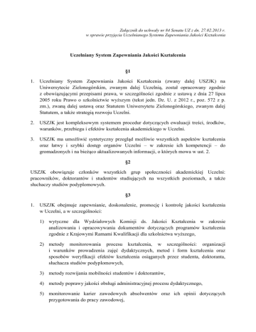 Załącznik do uchwały nr 84 Senatu UZ z dn. 27.02.2013 r. w sprawie przyjęcia Uczelnianego Systemu Zapewniania Jakości Kształcenia Uczelniany System Zapewniania Jakości Kształcenia §1 1. Uczelniany System Zapewniania Jakości Kształcenia (zwany dalej USZJK) na Uniwersytecie Zielonogórskim, zwanym dalej Uczelnią, został opracowany zgodnie z obowiązującymi przepisami prawa, w szczególności zgodnie z ustawą z dnia 27 lipca 2005 roku Prawo o szkolnictwie wyższym (tekst jedn. Dz. U. z 2012 r., poz. 572 z p. zm.), zwaną dalej ustawą oraz Statutem Uniwersytetu Zielonogórskiego, zwanym dalej Statutem, a także strategią rozwoju Uczelni. 2. USZJK jest kompleksowym systemem procedur dotyczących ewaluacji treści, środków, warunków, przebiegu i efektów kształcenia akademickiego w Uczelni. 3. USZJK ma umożliwić syntetyczny przegląd możliwie wszystkich aspektów kształcenia oraz łatwy i szybki dostęp organów Uczelni – w zakresie ich kompetencji – do gromadzonych i na bieżąco aktualizowanych informacji, o których mowa w ust. 2. §2 USZJK obowiązuje członków wszystkich grup społeczności akademickiej Uczelni: pracowników, doktorantów i studentów studiujących na wszystkich poziomach, a także słuchaczy studiów podyplomowych. §3 1. USZJK obejmuje zapewnianie, doskonalenie, promocję i kontrolę jakości kształcenia w Uczelni, a w szczególności: 1) wytyczne dla Wydziałowych Komisji ds. Jakości Kształcenia w zakresie analizowania i opracowywania dokumentów dotyczących programów kształcenia zgodnie z Krajowymi Ramami Kwalifikacji dla szkolnictwa wyższego, 2) metody monitorowania procesu kształcenia, w szczególności: organizacji i warunków prowadzenia zajęć dydaktycznych, metod i form kształcenia oraz sposobów weryfikacji efektów kształcenia osiąganych przez studenta, doktoranta, słuchacza studiów podyplomowych, 3) metody rozwijania mobilności studentów i doktorantów, 4) metody poprawy jakości obsługi administracyjnej procesu dydaktycznego, 5) monitorowanie karier zawodowych absolwentów oraz ich opinii dotyczących przygotowania do pracy zawodowej, 6) procedury współpracy z interesariuszami zewnętrznymi, 7) system motywowania, oceniania i nagradzania nauczycieli akademickich oraz doktorantów za działania na rzecz jakości kształcenia, 8) informatyzację obsługi studentów, doktorantów, słuchaczy studiów podyplomowych i działań administracji, 9) inne zadania wynikające z rozwoju uczelni, przepisów prawa i współpracy z innymi podmiotami. §4 1. Nadzór nad funkcjonowaniem USZJK na poziomie Uczelni sprawuje prorektor ds. jakości kształcenia. 2. Nadzór nad funkcjonowaniem UZSJK na wydziałach sprawują dziekani. §5 W celu realizacji działań określonych w § 3 powołuje się: 1) na poziomie ogólnouczelnianym Uczelnianą Radę ds. Jakości Kształcenia, zwaną dalej Uczelnianą Radą, 2) na każdym wydziale Wydziałową Komisję ds. Jakości Kształcenia, zwaną dalej Wydziałową Komisją. §6 1. Uczelniana Rada, powoływana przez rektora, składa się z Zespołu ds. Zapewniania Jakości Kształcenia i Zespołu ds. Ewaluacji Jakości Kształcenia. Obsługę administracyjną Uczelnianej Rady zapewnia pion prorektora ds. jakości kształcenia. 2. Przewodniczącym Uczelnianej Rady jest pełnomocnik rektora ds. jakości kształcenia, a jego zastępcą pełnomocnik rektora ds. ewaluacji jakości kształcenia. 3. W skład Zespołu ds. Zapewniania Jakości Kształcenia wchodzą: 1) pełnomocnik rektora ds. jakości kształcenia – jako przewodniczący, 2) przedstawiciele stałych komisji senackich określonych w Statucie, wskazani przez przewodniczących tych komisji, 3) koordynatorzy działań na rzecz jakości kształcenia wskazani przez rektora, 4) przedstawiciel studentów i doktorantów wskazani przez właściwe organy samorządu studenckiego i samorządu doktorantów, 5) inne osoby wskazane przez rektora. 4. W skład Zespołu ds. Ewaluacji Jakości Kształcenia wchodzą: 1) pełnomocnik rektora ds. ewaluacji jakości kształcenia– jako przewodniczący, 2) przedstawiciele pracowników naukowo-dydaktycznych – po jednym pracowniku wskazanym przez dziekana każdego wydziału, 3) przedstawiciel studentów i doktorantów wskazani przez właściwe organy samorządu studenckiego i samorządu doktorantów, 4) inne osoby wskazane przez rektora. 5. Dana osoba można być członkiem tylko jednego zespołu. 6. Do zadań Uczelnianej Rady należy w szczególności: 1) opracowywanie procedur służących zapewnieniu jakości kształcenia w Uczelni, 2) rekomendowanie Komisji ds. Kształcenia oraz rektorowi działań doskonalących proces kształcenia w Uczelni, 3) monitoring i merytoryczne wspieranie działań Wydziałowych Komisji ds. Jakości Kształcenia, 4) przedstawianie rektorowi rocznego sprawozdania z funkcjonowania Uczelnianego Systemu Zapewniania Jakości Kształcenia. 7. Zadania Zespołu ds. Zapewniania Jakości Kształcenia obejmują w szczególności: 1) rekomendowanie Wydziałowym Komisjom działań podnoszących jakość kształcenia w Uczelni, między innymi szkoleń dla nauczycieli akademickich i pracowników administracyjnych dotyczących Krajowych Ram Kwalifikacji, 2) opracowywanie i proponowanie działań w zakresie zapewnienia wymaganej przepisami prawa kadry akademickiej oraz systemu motywacji i oceny tej kadry, 3) propagowanie w uczelni różnych form kształcenia przez całe życie, 4) opracowywanie i rekomendowanie dziekanom metod rozwijania mobilności studentów, 5) opracowanie i wdrożenie i nieformalnego w Uczelni, reguł uznawalności kształcenia pozaformalnego 6) opracowywanie programów poprawy jakości kształcenia, 7) monitorowanie jakości kształcenia na wydziałach, w tym prac Wydziałowych Zespołów ds. Zapewniania Jakości Kształcenia, 8) monitorowanie wdrażania przez wydziały regulacji prawnych w zakresie kształcenia (w szczególności dokumentów dotyczących programów ksz