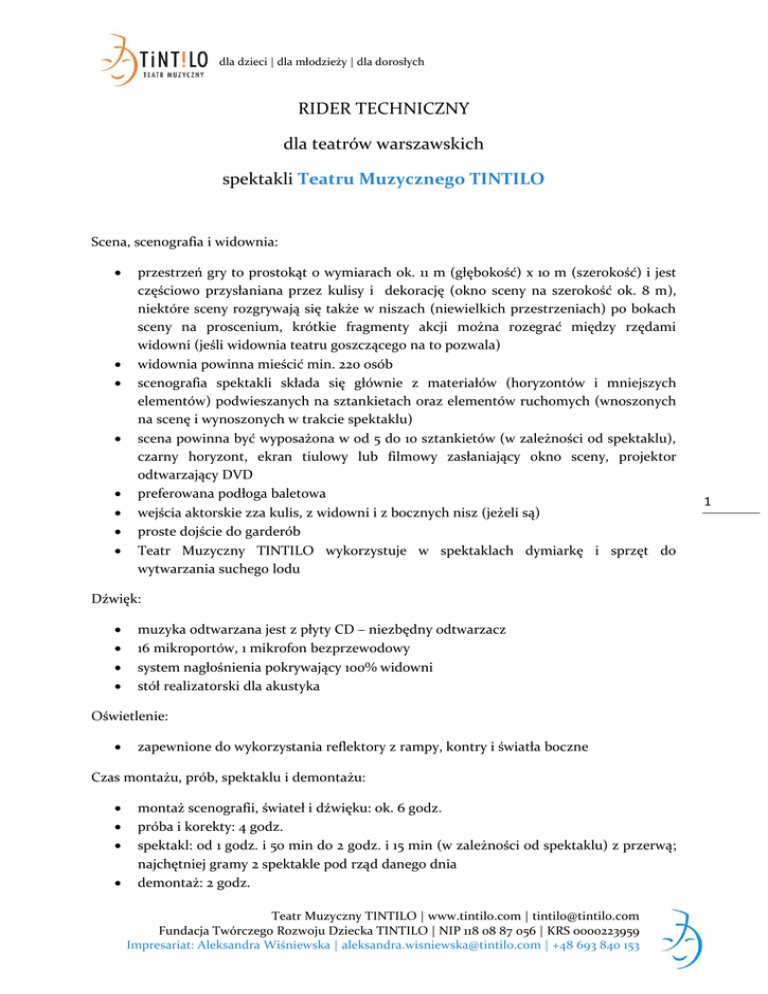 dla dzieci | dla młodzieży | dla dorosłych RIDER TECHNICZNY dla teatrów warszawskich spektakli Teatru Muzycznego TINTILO Scena, scenografia i widownia: przestrzeń gry to prostokąt o wymiarach ok. 11 m (głębokość) x 10 m (szerokość) i jest częściowo przysłaniana przez kulisy i dekorację (okno sceny na szerokość ok. 8 m), niektóre sceny rozgrywają się także w niszach (niewielkich przestrzeniach) po bokach sceny na proscenium, krótkie fragmenty akcji można rozegrać między rzędami widowni (jeśli widownia teatru goszczącego na to pozwala) widownia powinna mieścić min. 220 osób scenografia spektakli składa się głównie z materiałów (horyzontów i mniejszych elementów) podwieszanych na sztankietach oraz elementów ruchomych (wnoszonych na scenę i wynoszonych w trakcie spektaklu) scena powinna być wyposażona w od 5 d0 10 sztankietów (w zależności od spektaklu), czarny horyzont, ekran tiulowy lub filmowy zasłaniający okno sceny, projektor odtwarzający DVD preferowana podłoga baletowa wejścia aktorskie zza kulis, z widowni i z bocznych nisz (jeżeli są) proste dojście do garderób Teatr Muzyczny TINTILO wykorzystuje w spektaklach dymiarkę i sprzęt do wytwarzania suchego lodu Dźwięk: muzyka odtwarzana jest z płyty CD – niezbędny odtwarzacz 16 mikroportów, 1 mikrofon bezprzewodowy system nagłośnienia pokrywający 100% widowni stół realizatorski dla akustyka Oświetlenie: zapewnione do wykorzystania reflektory z rampy, kontry i światła boczne Czas montażu, prób, spektaklu i demontażu: montaż scenografii, świateł i dźwięku: ok. 6 godz. próba i korekty: 4 godz. spektakl: od 1 godz. i 50 min do 2 godz. i 15 min (w zależności od spektaklu) z przerwą; najchętniej gramy 2 spektakle pod rząd danego dnia demontaż: 2 godz. Teatr Muzyczny TINTILO | www.tintilo.com | [email protected] Fundacja Twórczego Rozwoju Dziecka TINTILO | NIP 118 08 87 056 | KRS 0000223959 Impresariat: Aleksandra Wiśniewska | [email protected] | +48 693 840 153 1 dla dzieci | dla młodzieży | dla dorosłych Niezbędna obsługa teatru goszczącego: 2 montażystów akustyk oświetleniowiec (do realizacji projekcji) Zespół Teatru Muzycznego TINTILO: aktorzy: ok. 5 aktorów dorosłych, kobiet i mężczyzn (ilość zależy od spektaklu) oraz ok. 30 dzieci i młodzieży inspicjent (1 kobieta) opiekun artystyczny – reżyser (1 kobieta) koordynator (1 kobieta) montażysta (1 mężczyzna) akustyk (1 mężczyzna) oświetleniowiec (1 mężczyzna) elektryk (1 mężczyzna) charakteryzatorka (1 kobieta) garderobiana (1 kobieta) 1-2 opiekunów do dzieci Skład zespołu może ulec zmianie, szczególnie w razie korzystania w większym zakresie z pomocy osób pracujących w teatrze goszczącym. Teatr Muzyczny TINTILO | www.tintilo.com | [email protected] Fundacja Twórczego Rozwoju Dziecka TINTILO | NIP 118 08 87 056 | KRS 0000223959 Impresariat: Aleksandra Wiśniewska | [email protected] | +48 693 840 153 2