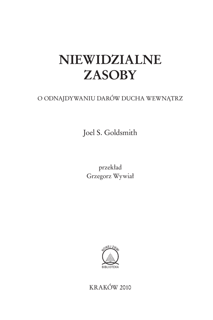NIEWIDZIALNE ZASOBY O ODNAJDYWANIU DARÓW DUCHA WEWNĄTRZ Joel S. Goldsmith przekład Grzegorz Wywiał KRAKÓW 2010 Tytuł oryginału: „Invisible Supply: finding the gifts of the spirit within” Copyright © 1983 Geri McDonald First published 1962 by Harper Collins Publishers – New York Copyright © for Polish edition 2010 – Biblioteka Nowej Ziemi Redakcja: Dariusz Jagiełło Przekład: Grzegorz Wywiał Skład i łamanie: Anna Szarko Obraz na okładce: Justyna Stoszek Druk i oprawa: www.kandk.com.pl Wszystkie prawa zastrzeżone. Nieautoryzowane rozpowszechnianie całości lub fragmentu niniejszej publikacji w jakiejkolwiek postaci jest zabronione. Wykonywanie kopii bez pisemnej zgody powoduje naruszenie praw autorskich niniejszej publikacji. ISBN 978-83-61897-44-6 Wydawnictwo Biblioteka Nowej Ziemi Węgrzce A10/50, 32-086 Kraków tel. (012) 285 87 26 fax (012) 286 30 81 [email protected] www.biblioteka-nz.pl Spis Treści I. Zasada Zasobów��������������������������������������������������������������������� 11 Dlaczego doświadczamy braku—Niewidzialne zasoby—Zasoby są Duchem—Namacalne i nienamacalne, widzialne i niewidzialne—Zasoby są ucieleśnione w nas—Rzucanie chleba na wodę—Przebaczanie win oraz modlitwa za nieprzyjaciół—Dzielenie się—Wdzięczność—Dziesięcina— Przejawianie zasobów II. Skrytość (Dyskrecja), Podstawowa Zasada Mistyki 30 Skrytość duchowa—Co możemy dzielić i z kim—Modlitwa w skrytości—Dawanie jałmużny w skrytości—Cnota grzmi znad dachów domostw III. Zasada Medytacji Kontemplacyjnej ���������������������������� 43 Urzeczywistnienie Boga—Świadomość Duchowa—Rozwijanie świadomości duchowej—Świadomość duchowa przez medytację—Zasada modlitwy—Ciągłe, świadome zamieszkiwanie w Prawdzie—Właściwe używanie fragmentów Pisma IV. Przezwyciężanie Poczucia Oddzielenia od Boga ��� 58 Błędne koncepcje na temat Boga—Bóg nie karze, ani nie nagradza—Bóg nie odmawia—Natura Boga—Bóg nie trzyma nas na uwięzi—Boga nie da się oszukać—Uznać Obecność Boga—„Mój dom jest w Tobie”—Przejawianie Wszechobecności—Bóg, czyli „all-inclusive”—Twoje środki do życia są zapewniane przez Łaskę—Urzeczywistnienie Wszechobecności V. Owoce z Właściwego Poznania Boga��������������������������� 77 Boska natura jako spełnienie—Bóg jest Stwórcą—Bóg, jedyna Miłość— Bóg, jedyna Siła—Bóg, jedyne Źródło Prawdy—Bóg, jedyny Dopływ Zasobów—Bóg, jedyne Życie—Bóg, Prawo i Substancja—Bóg, harmonia we wszystkim—W Bogu odpoczynek—Mądrość Duchowa—Uzyskanie zrozumienia duchowego VI. Zbroja Jedni ������������������������������������������������������������������������� 90 W Bogu istniejemy—Duchowy wgląd—Przywdziej zbroję Jedni VII. Praktykowanie Duchowej Prawdy��������������������������� 104 Pielęgnowanie nasion Prawdy w skrytości—Prawda może być niewygodna—Praktykuj Prawdę w każdym działaniu—Prawda to ciężka praca VIII. Trzy Zasady Uzdrawiania ���������������������������������������� 114 Bóg używa nas, aby uzdrawiać—Bóg jest Jedyną Siłą—Zło nie jest osobowe—Nie stawiajcie oporu złemu—Nie osądzajcie według zewnętrznych pozorów—Uzdrawianie jest manifestacją Prawdy—Dwa kroki uzdrawiania—Bezosobowość—Nicość—Błędne myślenie—Wyraź swoją świadomość IX. Zasada Leczenia �������������������������������������������������������������� 130 Panowanie nad umysłem i ciałem—Objęcie panowania dzięki medytacji—Leczenie jako rodzaj modlitwy—Leczenie dotyczące zasobów—Leczenie dolegliwości fizycznych X. Doczesna Moc Nie Jest Mocą �������������������������������������� 145 Zasada działania bez-siły—Siły zła nie są rzeczywiste—Królestwo Moje—Bóg nie jest mocą, której można by używać—Pokój na świecie— Brzemię stanie się lekkie—Od nicości – do Wszystkości „Jeśli Pan domu nie zbuduje, na próżno się trudzą ci, którzy go wznoszą”. Psalm 127 „Oświecenie zrywa wszelkie więzi materialne i łączy ludzi złotym łańcuchem zrozumienia duchowego; nie uznaje nic poza przewodnictwem Chrystusa. Nie posiada ani rytuału, ani reguły, z wyjątkiem Miłości Bożej – bezosobowej i uniwersalnej. Nie uznaje żadnego kultu poza czcią wewnętrznego Ognia, który zawsze płonie przed wewnętrznym sanktuarium Ducha. Ten związek jest wolnym stanem duchowego braterstwa. Jedynym przymusem jest dyscyplina Duszy. W ten sposób poznajemy wolność bez samowoli. Jesteśmy zjednoczonym wszechświatem bez fizycznych ograniczeń, służebnikami Boga bez ceremoniału i wierzeń. Oświeceni idą naprzód bez lęku – dzięki Łasce”. „Droga do Nieskończoności” Joela S. Goldsmitha I Zasada Zasobów S łowo Zasada (Principium) występuje w słowniku Webstera jako synonim Boga, i w takim samym znaczeniu używa go Nauka Chrześcijańska1. Jednak w przesłaniu Drogi do Nieskończoności2 używam słowa zasada w jego typowym znaczeniu jako zasad, na których opiera się nasze życie, nasza praca czy też nasza świadomość. Potrzebujemy zasad, by móc w oparciu o nie budować, pracować i byśmy mogli ostatecznie wznieść się ponad ślepą wiarę. Zasa