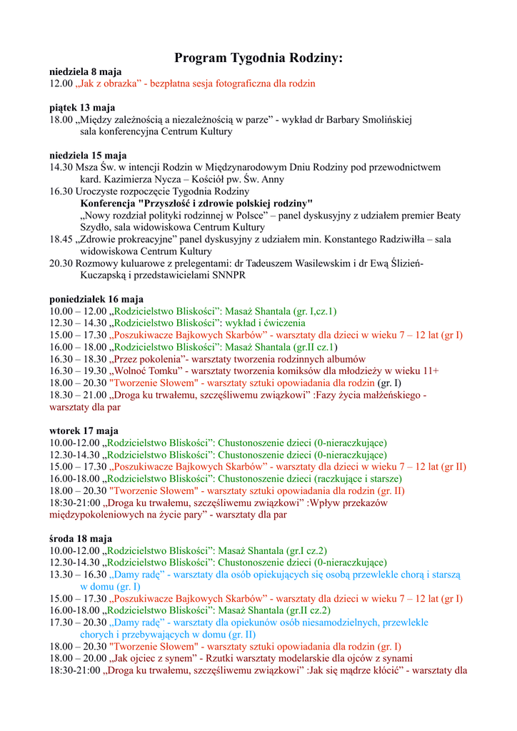 Program Tygodnia Rodziny: niedziela 8 maja 12.00 „Jak z obrazka” - bezpłatna sesja fotograficzna dla rodzin piątek 13 maja 18.00 „Między zależnością a niezależnością w parze” - wykład dr Barbary Smolińskiej sala konferencyjna Centrum Kultury niedziela 15 maja 14.30 Msza Św. w intencji Rodzin w Międzynarodowym Dniu Rodziny pod przewodnictwem kard. Kazimierza Nycza – Kościół pw. Św. Anny 16.30 Uroczyste rozpoczęcie Tygodnia Rodziny Konferencja "Przyszłość i zdrowie polskiej rodziny" „Nowy rozdział polityki rodzinnej w Polsce” – panel dyskusyjny z udziałem premier Beaty Szydło, sala widowiskowa Centrum Kultury 18.45 „Zdrowie prokreacyjne” panel dyskusyjny z udziałem min. Konstantego Radziwiłła – sala widowiskowa Centrum Kultury 20.30 Rozmowy kuluarowe z prelegentami: dr Tadeuszem Wasilewskim i dr Ewą ŚlizieńKuczapską i przedstawicielami SNNPR poniedziałek 16 maja 10.00 – 12.00 „Rodzicielstwo Bliskości”: Masaż Shantala (gr. I,cz.1) 12.30 – 14.30 „Rodzicielstwo Bliskości”: wykład i ćwiczenia 15.00 – 17.30 „Poszukiwacze Bajkowych Skarbów” - warsztaty dla dzieci w wieku 7 – 12 lat (gr I) 16.00 – 18.00 „Rodzicielstwo Bliskości”: Masaż Shantala (gr.II cz.1) 16.30 – 18.30 „Przez pokolenia”- warsztaty tworzenia rodzinnych albumów 16.30 – 19.30 „Wolnoć Tomku” - warsztaty tworzenia komiksów dla młodzieży w wieku 11+ 18.00 – 20.30 "Tworzenie Słowem" - warsztaty sztuki opowiadania dla rodzin (gr. I) 18.30 – 21.00 „Droga ku trwałemu, szczęśliwemu związkowi” :Fazy życia małżeńskiego warsztaty dla par wtorek 17 maja 10.00-12.00 „Rodzicielstwo Bliskości”: Chustonoszenie dzieci (0-nieraczkujące) 12.30-14.30 „Rodzicielstwo Bliskości”: Chustonoszenie dzieci (0-nieraczkujące) 15.00 – 17.30 „Poszukiwacze Bajkowych Skarbów” - warsztaty dla dzieci w wieku 7 – 12 lat (gr II) 16.00-18.00 „Rodzicielstwo Bliskości”: Chustonoszenie dzieci (raczkujące i starsze) 18.00 – 20.30 "Tworzenie Słowem" - warsztaty sztuki opowiadania dla rodzin (gr. II) 18:30-21:00 „Droga ku trwałemu, szczęśliwemu związkowi” :Wpływ przekazów międzypokoleniowych na życie pary” - warsztaty dla par środa 18 maja 10.00-12.00 „Rodzicielstwo Bliskości”: Masaż Shantala (gr.I cz.2) 12.30-14.30 „Rodzicielstwo Bliskości”: Chustonoszenie dzieci (0-nieraczkujące) 13.30 – 16.30 „Damy radę” - warsztaty dla osób opiekujących się osobą przewlekle chorą i starszą w domu (gr. I) 15.00 – 17.30 „Poszukiwacze Bajkowych Skarbów” - warsztaty dla dzieci w wieku 7 – 12 lat (gr I) 16.00-18.00 „Rodzicielstwo Bliskości”: Masaż Shantala (gr.II cz.2) 17.30 – 20.30 „Damy radę” - warsztaty dla opiekunów osób niesamodzielnych, przewlekle chorych i przebywających w domu (gr. II) 18.00 – 20.30 "Tworzenie Słowem" - warsztaty sztuki opowiadania dla rodzin (gr. I) 18.00 – 20.00 „Jak ojciec z synem” - Rzutki warsztaty modelarskie dla ojców z synami 18:30-21:00 „Droga ku trwałemu, szczęśliwemu związkowi” :Jak się mądrze kłócić” - warsztaty dla par czwartek 19 maja 16.30 – 19.30 „Wolnoć Tomku” - warsztaty tworzenia komiksów dla młodzieży w wieku 11+ 18.00 – 21.00 „Podstawy komunikacji asertywnej w rodzinie” - warsztaty dla wszystkich dorosłych 18:30 – 21:00 „Droga ku trwałemu, szczęśliwemu związkowi” :Wyrażanie złości w związku” warsztaty dla par piątek 20 maja 10.00 – 12.00 „Rodzicielstwo Bliskości”: Chustonoszenie dzieci (raczkujące i starsze) 12.30 - 14.30 „Rodzicielstwo Bliskości”: wykład i ćwiczenia) 14.30 – 16.00 „Animacje angielskie” zabawy po angielsku dla dzieci w wieku 5 – 10 lat 15.00 – 17.30 „Poszukiwacze Bajkowych Skarbów” - warsztaty dla dzieci w wieku 7 – 12 lat (gr II) 16.00 - 18.00 „Rodzicielstwo Bliskości”: Chustonoszenie dzieci (0-nieraczkujące) 16.30 – 18.00 „Animacje angielskie” zabawy po angielsku dla dzieci w wieku 5 – 10 lat, 18.00 – 20.30 "Tworzenie Słowem" - warsztaty sztuki opowiadania dla rodzin (gr. II) 18.00 – 20.00 „Jak ojciec z synem”- Tarcze i miecze – warsztaty dla ojców z synami 18:30 – 21:00 „Droga ku trwałemu, szczęśliwemu związkowi” :Moje, twoje, nasze” - warsztaty dla par sobota 21 maja 16.30 – 18.30 „Wychowanie do wolności” panel dyskusyjny 18.30 – 20.30 Rozmowy kuluarowe z prelegentami 19.00 koncert dla dzieci – Polskie Radio Dzieciom niedziela 22 maja 15.30 – 19.00 – Piknik „Z kocykiem i koszykiem” - Bajkowa Rodzina W programie: *Skarby Rodzinnych Zamków – tworzenie budowli z miliona klocków MuBaBaO *Kraina Bajkostworów - zabawy ruchowe z miękkimi wypychankami *Papierobajki – warsztaty ilustracji i książeczek przestrzennych *Papierowy teatrzyk lalkowy - warsztaty tworzenia laleczek i rodzinnych teatrzyków Powarsztatowa wystawa prac ceramicznych i fotograficznych Gawędy i gry harcerskie – Drużyny ZHR Umbria i Łowcy z Grodziska Mazowieckiego Występ Grupy teatralnej „AKCJA” i wiele wiele innych atrakcji! wtorek 24.maja 16.00- 19.00 „Płodność po urodzeniu dziecka” Dr Ewa Ślizień – Kuczapska - spotkanie dla kobiet i małżeństw – sala konferencyjna Centrum Kultury MIEJSCA: 1. Centrum Kultury, ul. Spółdzielcza 9 2. Willa Radogoszcz, ul. H. Sienkiewicza 31 3. Pawilon Kultury - filia biblioteki nr 2, ul. Westfala 3 4. Zespół Szkół Technicznych i Licealnych Nr 2, ul. Kilińskiego 8c 5.Szkoła Podstawowa nr 1, ul. Kilińskiego 6. Szpital Zachodni, ul. Daleka 11 7. Park Skarbków WARSZTATOWCY: „Jak z obrazka” - sesja fotograficzna – Aneta Żylińska „Między zależnością a niezależnością w parze” - wykład – dr Barbara Smolińska „Droga ku trwałemu, szczęśliwemu związkowi” - warsztaty – Pracownia Dialogu „Podstawy komunikacji asertywnej w rodzinie”. - warsztaty - Joanna Krupska „Rodzicielstwo Bliskości” - warsztaty i wyk