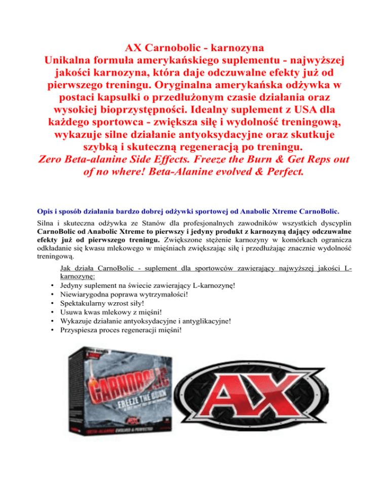 AX Carnobolic - karnozyna Unikalna formuła amerykańskiego suplementu - najwyższej jakości karnozyna, która daje odczuwalne efekty już od pierwszego treningu. Oryginalna amerykańska odżywka w postaci kapsułki o przedłużonym czasie działania oraz wysokiej bioprzystępności. Idealny suplement z USA dla każdego sportowca - zwiększa siłę i wydolność treningową, wykazuje silne działanie antyoksydacyjne oraz skutkuje szybką i skuteczną regeneracją po treningu. Zero Beta-alanine Side Effects. Freeze the Burn & Get Reps out of no where! Beta-Alanine evolved & Perfect. Opis i sposób działania bardzo dobrej odżywki sportowej od Anabolic Xtreme CarnoBolic. Silna i skuteczna odżywka ze Stanów dla profesjonalnych zawodników wszystkich dyscyplin CarnoBolic od Anabolic Xtreme to pierwszy i jedyny produkt z karnozyną dający odczuwalne efekty już od pierwszego treningu. Zwiększone stężenie karnozyny w komórkach ogranicza odkładanie się kwasu mlekowego w mięśniach zwiększając siłę i przedłużając znacznie wydolność treningową. • • • • • • Jak działa CarnoBolic - suplement dla sportowców zawierający najwyższej jakości Lkarnozynę: Jedyny suplement na świecie zawierający L-karnozynę! Niewiarygodna poprawa wytrzymałości! Spektakularny wzrost siły! Usuwa kwas mlekowy z mięśni! Wykazuje działanie antyoksydacyjne i antyglikacyjne! Przyspiesza proces regeneracji mięśni! Dlaczego karnozyna jest potrzebna sportowcom? Nie tylko badania naukowe, ale również opinie na forum wskazują jednoznacznie, że CarnoBolic to idealny suplement dla każdego sportowca! L-Karnozyna zawarta w silnej i skutecznej odżywce kulturystycznej Carnobolic od Anabolic Xtreme to połączenie dwóch aminokwasów: beta-alaniny i L-histydyny. Długo żyjące komórki jak komórki nerwowe (neurony) i komórki mięśni (miocyty) wykazują dużą zawartość L-karnozyny. Karnozyna charakteryzuje się właściwością odmładzania komórek właśnie w tym stadium, przywrócenia im normalnego wyglądu i przedłużenia ich życia. Anabolic Xtreme Carnobolic to idealny suplement dla osób oczekujących natychmiastowego wzrostu siły i wytrzymałości. Lkarnozyna neutralizuje bowiem działanie kwasu mlekowego w mięśniach. W zmęczonych mięśniach zbiera się ten kwas i spada współczynnik pH. Poprzez doprowadzenie karnozyny mięśnie odzyskują natychmiast siły i podejmują ponownie pracę, jak gdyby nigdy nie były zmęczone. Dla kogo dedykowany jest preparat antyoksydacyjny oraz o silnym działaniu anabolicznym i antykatabolicznym AX Carnobolic? Bardzo dobry suplement diety zawierający najwyższej jakości aminokwas l-karnozynę AX Carnobolic to doskonałe uzupełnienie diety dla każdego. Ze względu na silne działanie antyoksydacyjne ten stosunkowo tani suplement dedykowany jest głównie profesjonalnym sportowcom. Carnobolic to także idealne uzupełnienie diety każdej osoby żyjącej w ciągłym biegu, czyli aktywnej fizycznie, obciążonej lub narażonej na duże obciążenie psychiczne. Dobra odżywka w postaci wygodnych kapsułek poprawia także wydolność organizmu, zwiększa osiągi na treningu, daje siłę większą niż kreatyna oraz skutecznie pozwala się zregenerować mięśniom po treningu. Dawkowanie oraz sposób użycia taniej i dobrej karnozyny od Anabolic Xtreme: Zaleca się spożywać 4 kapsułki dziennie. W dni treningowe spożyć jedną porcję na pusty żołądek ok. 45 min. przed treningiem. W dni nietreningowe spożyć rano na pusty żołądek. Nie spożywać więcej niż 8 kapsułek na dobę. Opis i charakterystyka odżywki kulturystycznej z USA dla ciężarowców od Anabolic Xtreme: • 1 porcja = 4 kapsułki • Ilość porcji w opakowaniu: 21 • Zawartość opakowania: 84 kapsułki suplementu diety Skład produktu CarnoBolic: Zawartość: w jednej porcji 4 kaps. Mieszanka CarnoBolic: 293 mg - L-Carnosine (b-Alanyl-l-histidine) protected by Bio-Armored Time Released and Absorption Technology - Disodium ATP (Adenosine-5’-triphosphate, disodium salt) - Sodium Carbonate (Anhydrous) - Theobromine (Anhydrous) www.kulturystyka.sklep.pl