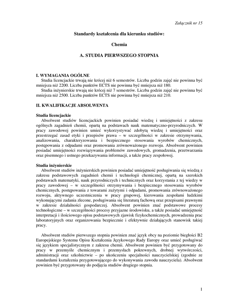 Zał cznik nr 15 Standardy kształcenia dla kierunku studiów: Chemia A. STUDIA PIERWSZEGO STOPNIA I. WYMAGANIA OGÓLNE Studia licencjackie trwaj nie krócej ni 6 semestrów. Liczba godzin zaj nie powinna by mniejsza ni 2200. Liczba punktów ECTS nie powinna by mniejsza ni 180. Studia in ynierskie trwaj nie krócej ni 7 semestrów. Liczba godzin zaj nie powinna by mniejsza ni 2500. Liczba punktów ECTS nie powinna by mniejsza ni 210. II. KWALIFIKACJE ABSOLWENTA Studia licencjackie Absolwent studiów licencjackich powinien posiada wiedz i umiej tno ci z zakresu ogólnych zagadnie chemii, opart na podstawach nauk matematyczno-przyrodniczych. W pracy zawodowej powinien umie wykorzystywa zdobyt wiedz i umiej tno ci oraz przestrzega zasad etyki i przepisów prawa – w szczególno ci w zakresie otrzymywania, analizowania, charakteryzowania i bezpiecznego stosowania wyrobów chemicznych, post powania z odpadami oraz promowania zrównowa onego rozwoju. Absolwent powinien posiada umiej tno ci rozwi zywania problemów zawodowych, gromadzenia, przetwarzania oraz pisemnego i ustnego przekazywania informacji, a tak e pracy zespołowej. Studia in ynierskie Absolwent studiów in ynierskich powinien posiada umiej tno posługiwania si wiedz z zakresu podstawowych zagadnie chemii i technologii chemicznej, opart na szerokich podstawach matematyki, nauk przyrodniczych i technicznych oraz korzystania z tej wiedzy w pracy zawodowej – w szczególno ci otrzymywania i bezpiecznego stosowania wyrobów chemicznych, post powania z towarami zu ytymi i odpadami, promowania zrównowa onego rozwoju, aktywnego uczestniczenia w pracy grupowej, kierowania zespołami ludzkimi wykonuj cymi zadania zlecone, posługiwania si literatur fachow oraz przepisami prawnymi w zakresie działalno ci gospodarczej. Absolwent powinien zna podstawowe procesy technologiczne – w szczególno ci procesy przyjazne rodowisku, a tak e posiada umiej tno interpretacji i ilo ciowego opisu podstawowych zjawisk fizykochemicznych, prowadzenia prac laboratoryjnych oraz organizowania bezpiecznie i efektywnie działaj cych stanowisk takiej pracy. Absolwent studiów pierwszego stopnia powinien zna j zyk obcy na poziomie biegło ci B2 Europejskiego Systemu Opisu Kształcenia J zykowego Rady Europy oraz umie posługiwa si j zykiem specjalistycznym z zakresu chemii. Absolwent powinien by przygotowany do pracy w przemy le chemicznym i przemysłach pokrewnych, drobnej wytwórczo ci, administracji oraz szkolnictwie – po uko czeniu specjalno ci nauczycielskiej (zgodnie ze standardami kształcenia przygotowuj cego do wykonywania zawodu nauczyciela). Absolwent powinien by przygotowany do podj cia studiów drugiego stopnia. 1 III. RAMOWE TRE CI KSZTAŁCENIA 1. GRUPY TRE CI KSZTAŁCENIA, MINIMALNA LICZBA GODZIN ZAJ ZORGANIZOWANYCH ORAZ MINIMALNA LICZBA PUNKTÓW ECTS licencjackie studia in ynierskie godziny ECTS godziny ECTS A. GRUPA TRE CI PODSTAWOWYCH B. GRUPA TRE CI KIERUNKOWYCH Razem 720 90 810 74 9 83 720 240 960 74 24 98 2. SKŁADNIKI TRE CI KSZTAŁCENIA W GRUPACH, MINIMALNA LICZBA GODZIN ZAJ ZORGANIZOWANYCH ORAZ MINIMALNA LICZBA PUNKTÓW ECTS studia licencjackie in ynierskie godziny ECTS godziny ECTS A. GRUPA TRE CI PODSTAWOWYCH Tre ci kształcenia w zakresie: 1. Matematyki 2. Fizyki 3. Biochemii i biologii 4. Chemii B. GRUPA TRE CI KIERUNKOWYCH Tre ci kształcenia w zakresie: 1. Chemii materiałów 2. Chemii stosowanej i zarz dzania chemikaliami 3. Technologii chemicznej 4. Aparatury i in ynierii chemicznej 5. Modelowania i projektowania procesów technologicznych 720 75 45 60 540 90 74 720 74 120 60 9 540 240 24 2 3. TRE CI I EFEKTY KSZTAŁCENIA A. GRUPA TRE CI PODSTAWOWYCH 1. Kształcenie w zakresie matematyki Tre ci kształcenia: Ci gi i szeregi liczbowe. Rachunek ró niczkowy funkcji jednej zmiennej (funkcje elementarne, ci gło i granica funkcji, pochodna funkcji i jej zastosowania). Rachunek całkowy funkcji jednej zmiennej (całka oznaczona i nieoznaczona, metody obliczania całek, zastosowania całek oznaczonych). Liczby zespolone. Algebra liniowa: macierze, układy równa , wyznaczniki, warto ci i wektory własne. Funkcje wielu zmiennych. Pochodna funkcji wielu zmiennych. Podstawy teorii równa ró niczkowych. Elementy geometrii analitycznej. Elementy geometrii przestrzennej. Podstawy teorii grup. Szeregi Fouriera. Elementy rachunku prawdopodobie stwa i statystyki. Efekty kształcenia – umiej tno ci i kompetencje: posługiwania si metodami matematycznymi w chemii; opisu matematycznego zjawisk i procesów fizycznych oraz chemicznych; abstrakcyjnego rozumienia problemów z zakresu fizyki i chemii. 2. Kształcenie w zakresie fizyki Tre ci kształcenia: Podstawy mechaniki klasycznej. Elementy hydromechaniki. Grawitacja. Drgania i fale w o rodkach spr ystych. Elektryczne i magnetyczne wła ciwo ci materii. Elektryczno . Fale elektromagnetyczne. Polaryzacja, interferencja i dyfrakcja fal. Elementy optyki falowej i geometrycznej. Elementy akustyki. Elementy fizyki ciała stałego. Promieniotwórczo naturalna i sztuczna. Elementy fizyki j drowej. Elementy kosmologii. Efekty kształcenia – umiej tno ci i kompetencje: pomiaru lub okre lania podstawowych wielko ci fizycznych; rozumienia zjawisk i procesów fizycznych w przyrodzie; wykorzystywania praw przyrody w technice i yciu codziennym. 3. Kształcenie w zakresie biochemii i biologii Tre ci kształcenia: Molekularne podło e ycia, teorie powstania ycia na Ziemi. Poziomy organizacji ycia – formy bezkomórkowe, komórki, tkanki, narz dy. Organizmy jedno- i wielokomórkowe. Biologiczne poj cie gatunku, procesy powstawania i wymierania gatunków. Budowa i fizjologia organizmów priokariotycznych i eukariotycznych. Budowa i funkcje błon biologicznych. Budowa oraz funkcje biologiczne białek, kwasów nukleinowych, lipidów i w glowodanów. Zale no ci mi dzy struktur a funkcj biologiczn zwi zków. Podstawowe szlaki metaboliczne. Fotosynteza i inne szlaki anaboliczne. Podstawy genetyki klasycznej, popu