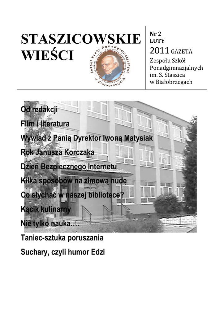 STASZICOWSKIE WIEŚCI Nr 2 LUTY 2011 GAZETA Zespołu Szkół Ponadgimnazjalnych im. S. Staszica w Białobrzegach Od redakcji Film i literatura Wywiad z Panią Dyrektor Iwoną Matysiak Rok Janusza Korczaka Dzień Bezpiecznego Internetu Kilka sposobów na zimową nudę Co słychać w naszej bibliotece? Kącik kulinarny Nie tylko nauka…. Taniec-sztuka poruszania Suchary, czyli humor Edzi Drodzy Czytelnicy! Z wielką przyjemnością publikujemy drugi numer „Staszicowskich wieści”. Czynimy to z ogromną radości, gdyż nie do końca wierzyliśmy, iż będzie to możliwe. Mamy nadzieję, że i w tym numerze znajdziecie to, co zainteresuje Was szczególnie. Warto sięgnąć po to pismo, gdyż czeka na Was wiele ciekawych informacji, których nie znajdziecie gdzie indziej. Rubryki stałe, jak film i literatura, wywiady oraz niesamowity humor, obecne na swoim miejscu! Ale nie zabraknie nowości: tańce standardowe - najlepsze na karnawałowe bale, sposoby na nudę w czasie ferii, czy ciekawostki z biblioteki na pewno zwrócą uwagę niejednego czytelnika. Zapraszamy do zakupu drugiego numeru! Redaktorzy 2 WAŻNE Warto śledzić na bieżąco wszystkie szkolne wydarzenia, m.in. W styczniu ruszył Konkurs Wiedzy o Stanisławie Staszicu. Przypominamy, że 20 stycznia minęła 186 rocznica śmierci patrona naszej szkoły! Na luty zaplanowany jest Konkurs Recytatorski- zapraszamy wszystkich chętnych do wzięcia udziału. Konkursów z pewnością będzie wiele więcej! Jednocześnie informujemy, że wszystkie ważne wydarzenia z życia szkoły znajdują się na stronie internetowej: www.zspbialobrzegi.edu.pl Stopka redakcyjna Redaktorzy: Monika „Molaczka” Molak Olga „Kamyk” Kamińska Edyta „Edzia” Gocel Anna „Cross” Gos Opiekun grupy: Katarzyna Kot Dominik „Sagan” Piekarski Norbert „Gumiany” Gumowski Bartosz „Koniu” Majchrowski Iwona Radecka KONTAKT Z REDAKCJĄ email: [email protected] w każdy czwartek od 1500-1545 Serdecznie dziękujemy za pomoc przy wydaniu gazety Pani Marzenie Górskiej i Pani Krystynie Kozłowskiej 3 FIL M I LITERATURA Wszyscy spotykamy się na co dzień z groźnie brzmiącym, wszechobecnym słowem: "narkotyk". Powoli stał on się nieodłącznym elementem ciemnej strony cywilizacji, takim samym jak alkoholizm czy bezrobocie... Jesteśmy coraz bardziej otępiali, zdajemy sobie sprawę z groźby, jaką niesie biały proszek, a jednocześnie nie rozumiemy jego władzy. Nowe pokolenie dorasta w "czasach narkotyku" – dla nich to już nie temat tabu, to tania sensacja, wykorzystywana przez brukowce. Książka "My, dzieci z dworca ZOO" daje prawdziwe spojrzenie na sprawę narkomanii, mimo że napisana ponad dwadzieścia lat temu, to wciąż zatrważająco aktualna. Niemiecka pozycja to utwór, który musi wstrząsnąć czytelnikiem. Niby wszystko jest dla nas oczywiste – każdy wie, że narkotyki uzależniają, wyniszczają organizm, każdy czyta artykuły o Monarze, białej śmierci. Cały problem narkomani pokazany jest tu od podszewki. Nie jesteśmy już biernymi widzami – stajemy w samym centrum wydarzeń, obserwujemy, jak bohaterka dokonuje przerażających i nielogicznych dla nas wyborów, widzimy rozpaczliwą, bezskuteczną walkę z nałogiem. W czasie lektury powoli dociera do czytelnika, że mimo iż żyje w świecie ogólnodostępnej informacji – to tak naprawdę nie ma pojęcia o narkotykach. Suche statystyki, tabele i sprawozdania nie są porównywalne ze sceną śmierci narkomana w miejskim szalecie. Brutalność książki wyrywa nas z ogarniającej społeczeństwo znieczulicy, szokująco i bezpardonowo przedstawia nam ten "inny" świat. Świat upodlenia, który znajduje się tuż obok nas... "My, dzieci z dworca ZOO" to relacja piętnastoletniej dziewczyny, spisana pod koniec lat siedemdziesiątych przez dwóch niemieckich dziennikarzy. Pozycja adresowana przede wszystkim do młodzieży, zwięzła, ciekawa językowo, nie sprawiająca problemu nawet ludziom niechętnie sięgającym po lekturę. Całą sytuację widzimy zarówno z perspektywy matki, jak i dziecka. Ten sposób budowy utworu daje nam doskonałe spojrzenie na relacje: rodzina – narkoman – otoczenie. Książka o losach Christiane jest lekturą, którą powinno się przeczytać. Łatwo tu dopatrzeć się odniesień do naszego dzisiejszego życia – blokowisko, brak nadziei na przyszłość. Bezlitośnie uświadamiająca władzę narkotyku, odzierającą nas z wszelkich złudzeń. Dla młodych ludzi - lektura obowiązkowa! Nasza Ocena: Pozycja jest dostępna w kilku egzemplarzach w naszej bibliotece. Zapraszamy! 4 „WSZYSTKO O MOJEJ MATCE” Greckie przysłowie mówi, że jedynie kobiety, które skąpały oczy we łzach, widzą jasno. Przysłowie to nie spełnia się jednak w przypadku Manueli. Tej nocy, gdy jej syn Esteban ginie przejechany przez samochód Manuela płacze tak długo, aż zabraknie jej łez. A mimo to, wcale nie widzi jasno; teraźniejszość i przyszłość giną w jednakowych ciemnościach. Czekając w szpitalu, czyta ostatnie linijki jakie jej syn zapisał w notesie, z którym nigdy się nie rozstawał. "Dziś rano przeszukałem pokój mojej matki i znalazłem plik zdjęć. Wszystkim brakowało połowy. Był na nich, jak sądzę, mój ojciec. Mam wrażenie, że w moim życiu brakuje tego samego kawałka. Chcę poznać mojego ojca, nie ważne kim jest i jak zachował się wobec mamy. Nikt nie może odebrać mi tego prawa..." Manuela nigdy mu nie powiedziała kim był. "Twój ojciec umarł na długo przed twoim narodzeniem" - to wszystko, co zdążył od niej usłyszeć. Przez pamięć dla swego syna Manuela opuszcza Madryt i jedzie do Barcelony odnaleźć jego ojca. Chce mu powiedzieć, że ostatnie słowa, jakie zapisał jego syn skierował właśnie do niego, chociaż wcale go nie znał. Ale najpierw musi powiedzieć ojcu, że gdy ona od niego odeszła 18 lat temu, była w ciąży, i że mieli syna, i że syn ten właśnie umarł. Musi powiedzie