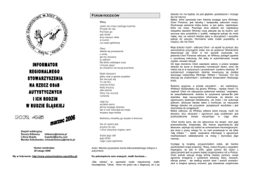 FORUM RODZICÓW Obcy Jeżeli nie znasz żadnego kosmity Przyjdź do nas Poznasz go gdy siedzi przy naszym stole w kuchni i je zupę ogórkową Obcy składa się przeważnie z wody jak my wszyscy tu zebrani Ma lekko odstające uszy i krzywy zgryz bo ortodonci nie leczą kosmitów Myśli obrazami jakby miał w głowie projektor Ale nie łudź się To nie film science fiction kiedy krzyczy albo płacze Obcy ma uczucia i powody Jego łzy są takie same jak łzy twojego dziecka ale w nich ściśnięta do kropli rozpacz tego świata Niektórzy chcieliby go wysłać w kosmos Zespół redakcyjny: Danuta Billewicz [email protected] Liliana Bujała [email protected] Monika Sokołowska [email protected] Numer zamknięto: 28 lutego 2006 My w Internecie: http://www.autyzmirodzina.republika.pl/ Ale on uparty jest przybył do nas i chce mieszkać między nami Gdzie jego stół jego łóżko i jego zupa ogórkowa Autor: Memiko (prywatnie mama kilkunastoletniego chłopca z autyzmem) Ku pokrzepieniu serc waszych, matki kochane.... „Siła miłości” to opowieść matki niepokornej, matki nieustępliwej. Takiej - która nie godzi się z diagnozą, że z jej dziecka nic nie będzie, bo jest głęboko upośledzone i niczego się nie nauczy. Matka, która opowiada nam historię swojego syna Whitneja, Cheri Florance, jest lekarką i terapeutką zaburzeń mowy. Wychowuje samotnie trójkę dzieci, w tym jedno, najmłodsze, które nie mówi. Pewnego dnia właśnie ten najmłodszy niespełna dwuletni Whitney nocą zakrada się do kuchni, tam wyrzuca stos produktów z szafek, następnie pakuje do miski mąkę, olej, na wierzch kładzie jajka w skorupkach i wszystko pakuje do piecyka. Normalnie wiele matek popadłoby w rozpacz, ale nie Cheri. Moje dziecko myśli! - odkrywa Cheri - on wpadł na pomysł, aby samodzielnie przyrządzić sobie coś do jedzenia! Wielokrotnie obserwował jak Cheri w ten sposób szykowała mu jedzenie.Cheri Florance odkrywa, że Whitney postąpił zgodnie z rysunkową instrukcją. Ale żeby to wykombinować musiał myśleć, chociaż milczał. Od tego momentu Cheri zawzięcie walczy o prawo swojego dziecka do życia w środowisku normalnych dzieci, choć nie mieści się to w wytycznych i procedurach systemu edukacji. W codziennych zmaganiach dzielnie towarzyszy jej dwójka starszego rodzeństwa Whitneja: William i Vanessa. Oni też okazują się znakomitymi i wytrwałymi terapeutami młodszego brata. Rodzina wygrywa, a przede wszystkim - ten najmłodszy, Whitney! Wydawałoby się głuchy Whitney - będzie mówił i to mądrze! Cheri nie odpuszcza systemowi edukacji ”uważałam, że zaszufladkowanie dziecka to ryzykowna sprawa.Bo jeśli etykietka daje nauczycielowi informacje, że dziecko ma ograniczony potencjał intelektualny, nie mówi i nie wykonuje poleceń, wówczas bardzo łatwo o konkluzje, że nauczanie takiego dziecka nie przyniesie pożądanych rezultatów i jest niemożliwe do osiągnięcia”. Matka odkrywa, że Whitney odbiera świat inaczej, myśli nie słowami, lecz obrazami i ogromnym jego problemem jest przekształcanie świata wizualnego w ciągi słów. Cheri kocha syna, ale nie odpuszcza mu terapii. Jest jego przewodniczką, terapeutką. Ma mocne argumenty,bo jest lekarzem, zajmuje się ludźmi ze schorzeniami neurologicznymi, wie dużo o pracy mózgu.To, co nam przekazuje to nie tylko "siłę miłości " - także racjonalne informacje o ogromnych możliwościach oddziaływania na mózg i stymulacji jego rozwoju. Czytając tę książkę, przypomniałam sobie, jak bardzo zazdrościłam mojej znajomej - Rose, matce Krzysia z zespołem Aspergera, że jest w USA, gdzie pomoc dla dzieci z zaburzeniami jest na pewno lepiej zorganizowana niż w Polsce. Cheri jednak opisuje drugą stronę medalu pomocy: swoje ogromne zmagania z systemem edukacji, który, owszem, oferuje pomoc - ale według swoich ocen i swoich procedur. Jest w książce opisany moment, gdy oświatowa urzędniczka grozi Cheri, że jeżeli nie przyprowadzi syna do wskazanej szkoły specjalnej - mogą pozbawić ją praw rodzicielskich. To urzędnik, bowiem, a nie ma matka decyduje gdzie i jak ma uczyć się dziecko! W książce Cheri Florance znalazłam niejedną gorzką prawdę, żywą i tam za oceanem i tutaj w środku Europy również. Zacytuje, więc jeszcze jeden Fragment książki „Sposób, w jaki w naszym społeczeństwie, a w szczególności w naszym szkolnictwie, wyróżnia się ludzi mających trudności z komunikowaniem się stanowi ogromną i zasadniczą przeszkodę w niesieniu tym ludziom pomocy. Zawsze z tym walczyłam, zarówno w swojej praktyce zawodowej jak i dla Whitneja, przez całe jego życie. Jestem przekonana, że większość kłopotów wychowawczych, jakie sprawiają dzieci w szkole - popisywanie się, depresja, wagary- bierze się stąd, że uczniowie z trudnościami w nauce uznawani są za "głąby". No właśnie, czy my tego nie znamy? „Siła miłości” - Cheri Florance (matka) i Marin Gazzaniga (dziennikarka, która opowieść tę spisała). Tytuł oryginału: Maverick mind – Wydawnictwo Świat Książki cena 29,90 (Członkowie klubu Świata Książki kupują o jedną trzecią taniej) Strona internetowa Cheri Florance: http://www.cheriflorance.com/index.jsp Krystyna Milewska z Warszawy, mama dziewczyny z zespołem Aspergera WARTO WIEDZIEĆ Jak pokonać autyzm Na początku 2006 roku w państwach Unii Europejskiej rozpoczną się badania epidemiologiczne stopnia zachorowalności na autyzm. Będą w nich uczestniczyć także specjaliści z Polski. W pracach Naukowej Rady Doradczej projektu o nazwie „Nadzieja”, finansowanego przez Komitet ds. Zdrowia UE, bierze udział dr Kenneth John Aitken z Wielkiej Brytanii, światowej sławy specjalista, od 25 lat leczący dzieci z autyzmem. Dr Aitken wygłosił w Warszawie wykład o biologicznym podłożu tej choroby. Na całym świecie notuje się wzrost zachorowań na autyzm. Przez wiele lat współczynnik rozpowszechnienia autyzm