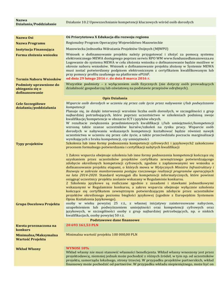 Nazwa Działania/Poddziałanie Działanie 10.2 Upowszechnianie kompetencji kluczowych wśród osób dorosłych Nazwa Osi Oś Priorytetowa X Edukacja dla rozwoju regionu Nazwa Programu Regionalny Program Operacyjny Województwo Mazowieckie Instytucja Finansująca Mazowiecka Jednostka Wdrażania Projektów Unijnych (MJWPU) Forma złożenia wniosku Wniosek o dofinansowanie projektu należy przygotować i złożyć za pomocą systemu elektronicznego MEWA dostępnego poprzez serwis RPO WM www.funduszedlamazowsza.eu Logowanie do systemu MEWA w celu złożenia wniosku o dofinansowanie będzie możliwe w okresie naboru wniosków. Wniosek o dofinansowanie projektu złożony w Systemie MEWA musi zostać potwierdzony podpisem elektronicznym z certyfikatem kwalifikowanym lub przy pomocy profilu zaufanego na platformie ePUAP. od dnia 29 lutego 2016 r. do dnia 8 marca 2016 r. Termin Naboru Wniosków Podmioty uprawnione do ubiegania się o dofinansowanie Cele Szczegółowe działania/poddziałania Typy projektów Grupa Docelowa Projektu Kwota przeznaczona na konkurs Wszystkie podmioty – z wyłączeniem osób fizycznych (nie dotyczy osób prowadzących działalność gospodarczą lub oświatową na podstawie przepisów odrębnych). Opis Działania Wsparcie osób dorosłych w uczeniu się przez całe życie przez nabywanie i/lub podwyższanie kompetencji Planuje się, że dzięki interwencji wzrośnie liczba osób dorosłych, w szczególności z grup najbardziej potrzebujących, które poprzez uczestnictwo w szkoleniach podniosą swoje kwalifikacje/kompetencje w obszarze ICT i języków obcych. W rezultacie zwiększenia przedmiotowych kwalifikacji i/lub umiejętności/kompetencji wzrosną także szanse uczestników kursów/szkoleń na rynku pracy. Wsparcie osób dorosłych w nabywaniu wskazanych kompetencji kształtować będzie również nawyk uczestnictwa w uczeniu się przez całe życie, a także przeciwdziała poczuciu marginalizacji wynikających z braku kompetencji, czy umiejętności Szkolenia lub inne formy podnoszenia kompetencji cyfrowych1 i językowych2 zakończone procesem formalnego potwierdzania i certyfikacji nabytych kwalifikacji 1 Zakres wsparcia obejmuje szkolenia lub inne formy podnoszenia kompetencji kończące się uzyskaniem przez uczestników projektów certyfikatu zewnętrznego potwierdzającego zdobycie określonych kompetencji cyfrowych, zgodnie z zaplanowanymi we wniosku o dofinansowanie projektu etapami, o których mowa w Wytycznych Ministra Infrastruktury i Rozwoju w zakresie monitorowania postępu rzeczowego realizacji programów operacyjnych na lata 2014-2020. Standard wymagań dla kompetencji informatycznych, które powinni osiągnąć uczestnicy projektu zostanie wskazany w Regulaminie konkursu. 2 Szkolenia językowe są rozliczane zgodnie z zasadami i stawkami jednostkowymi wskazanymi w Regulaminie konkursu, a zakres wsparcia obejmuje wyłącznie szkolenia kończące się certyfikatem zewnętrznym potwierdzającym zdobycie przez uczestników projektów określonego poziomu biegłości językowej (zgodnie z Europejskim Systemem Opisu Kształcenia Językowego). osoby w wieku powyżej 25 r.ż., z własnej inicjatywy zainteresowane nabyciem, uzupełnieniem lub podwyższeniem umiejętności oraz kompetencji cyfrowych oraz językowych, w szczególności osoby z grup najbardziej potrzebujących, np. o niskich kwalifikacjach, osoby powyżej 50 r.ż. Podstawowe dane finansowe 20 693 161,53 PLN Minimalna/Maksymalna Wartość Projektu Minimalna wartość projektu 100 000,00 PLN Wkład Własny WYNOSI 10% Wkład własny nie musi stanowić własności beneficjenta. Wkład własny wnoszony jest przez projektodawcę, niemniej jednak może pochodzić z różnych źródeł, w tym np. od uczestników projektu, samorządu lokalnego, strony trzeciej. W przypadku projektów partnerskich, wkład finansowy może pochodzić od partnerów. W przypadku wkładu niepieniężnego, może być on wnoszony przez beneficjenta ze składników jego majątku (np. nieruchomości) oraz z majątku innych podmiotów, o ile zostało to uregulowane prawnie (np. beneficjent będący NGO wnosi wkład w postaci nieruchomości udostępnionej przez gminę, przy czym możliwość wykorzystywania przez niego tej nieruchomości została uregulowana np. w umowie dzierżawy). Zaangażowanie wkładu niepieniężnego w realizację projektu może polegać na wykazaniu wyceny m.in. następujących kosztów: udostępnianie/użyczanie budynków, pomieszczeń, urządzeń, wyposażenia na potrzeby projektu świadczenia wykonywane przez wolontariuszy na podstawie ustawy o działalności pożytku publicznego i wolontariacie wkład niepieniężny w formie dodatków lub wynagrodzeń wypłacanych przez stronę trzecią (pracodawców) uczestnikom danego projektu wkład niepieniężny w innej formie Poziom dofinansowania Kryteria dostępu (0/1 pkt.) Wkład w postaci finansowej wykazywany przez projektodawcę w projekcie może pochodzić z następujących źródeł: opłaty związane z udziałem uczestników w projekcie środki pozyskane przez podmiot będący beneficjentem z innych programów krajowych/ regionalnych /lokalnych, pod warunkiem, że zasady realizacji tych programów nie zabraniają wnoszenia ich środków do projektów EFS (zagrożenie podwójnym finansowaniem wydatków) wpłaty pracodawców z tytułu uzyskanego wsparcia, w tym z tytułu uzyskanej pomocy publicznej (z wyłączeniem pomocy de minimis) środki finansowe będące w dyspozycji danej instytucji lub pozyskane przez tą instytucję z innych źródeł (np. od sponsorów, darczyńców – tak publicznych jak i prywatnych), w tym środki przeznaczone na wynagrodzenie kadry zaangażowanej przez beneficjenta w realizację projektu EFS, które nie jest finansowane ze środków dofinansowania. Istnieje możliwość łączenia różnych form wnoszenia wkładu własnego. Celem zapewnienia określonej wysokości wkładu własnego możliwe jest łączenie różnych jego f