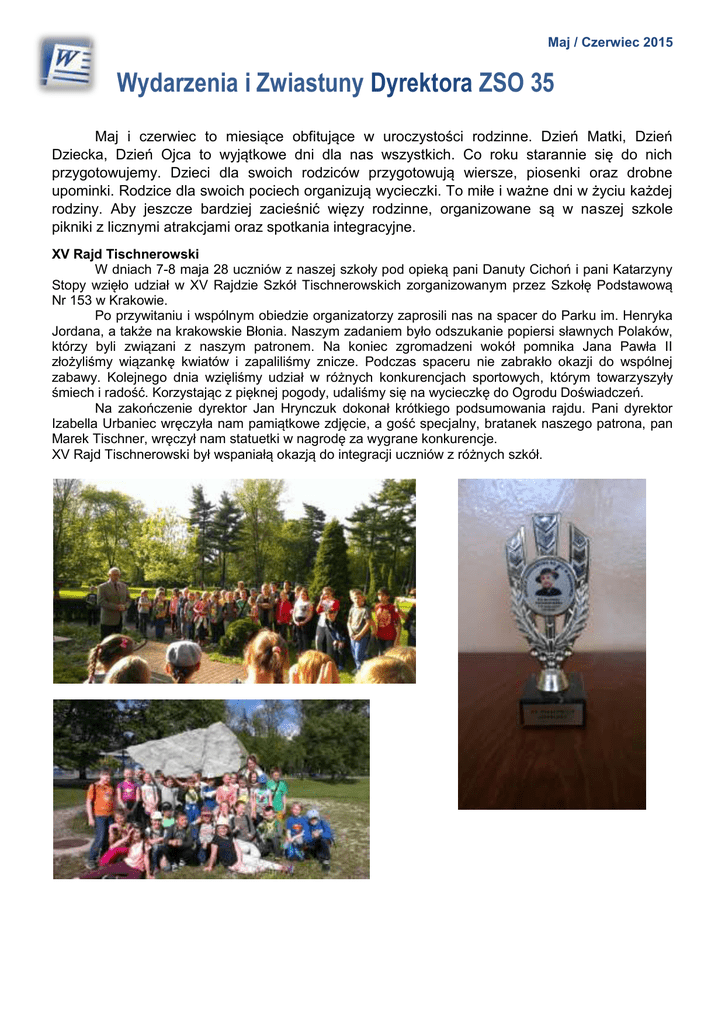 Maj / Czerwiec 2015 Wydarzenia i Zwiastuny Dyrektora ZSO 35 Maj i czerwiec to miesiące obfitujące w uroczystości rodzinne. Dzień Matki, Dzień Dziecka, Dzień Ojca to wyjątkowe dni dla nas wszystkich. Co roku starannie się do nich przygotowujemy. Dzieci dla swoich rodziców przygotowują wiersze, piosenki oraz drobne upominki. Rodzice dla swoich pociech organizują wycieczki. To miłe i ważne dni w życiu każdej rodziny. Aby jeszcze bardziej zacieśnić więzy rodzinne, organizowane są w naszej szkole pikniki z licznymi atrakcjami oraz spotkania integracyjne. XV Rajd Tischnerowski W dniach 7-8 maja 28 uczniów z naszej szkoły pod opieką pani Danuty Cichoń i pani Katarzyny Stopy wzięło udział w XV Rajdzie Szkół Tischnerowskich zorganizowanym przez Szkołę Podstawową Nr 153 w Krakowie. Po przywitaniu i wspólnym obiedzie organizatorzy zaprosili nas na spacer do Parku im. Henryka Jordana, a także na krakowskie Błonia. Naszym zadaniem było odszukanie popiersi sławnych Polaków, którzy byli związani z naszym patronem. Na koniec zgromadzeni wokół pomnika Jana Pawła II złożyliśmy wiązankę kwiatów i zapaliliśmy znicze. Podczas spaceru nie zabrakło okazji do wspólnej zabawy. Kolejnego dnia wzięliśmy udział w różnych konkurencjach sportowych, którym towarzyszyły śmiech i radość. Korzystając z pięknej pogody, udaliśmy się na wycieczkę do Ogrodu Doświadczeń. Na zakończenie dyrektor Jan Hrynczuk dokonał krótkiego podsumowania rajdu. Pani dyrektor Izabella Urbaniec wręczyła nam pamiątkowe zdjęcie, a gość specjalny, bratanek naszego patrona, pan Marek Tischner, wręczył nam statuetki w nagrodę za wygrane konkurencje. XV Rajd Tischnerowski był wspaniałą okazją do integracji uczniów z różnych szkół. Już po raz drugi wielu niezwykłych emocji i wzruszeń dostarczyły tańczące przedszkolaki. W Zespole Szkół Ogólnokształcących nr 35 odbył się II Przegląd Artystyczny Przedszkoli - Kraków Południe pod hasłem "Roztańczony Przedszkolak", który w tym roku honorowym patronatem objęli: miesięcznik "Bliżej Przedszkola", Radio Bajka, portal internetowy miastodzieci.pl. O randze imprezy świadczą ludzie wielkiego serca, dzięki którym może ona trwać i się rozwijać. Swoje serca i portfele otworzyli dla dzieci Sponsorzy i Partnerzy Przeglądu: BM Hause domy z bali, Marand, Syllabus, Krebo, 5 Fal, Lewiatan Swoszowice, Fundacja Tesco Dzieciom, Dorota Ostrowska fotografia, M-Team Kraków i Backoffice Project. Imprezę zaszczycili także swoją obecnością goście z różnych dziedzin kultury, tańca i Rady dzielnicy X, zasiadając w szanownym jury: Pani Iwona Blecharz - kierownik Osiedlowego Klubu Kultury Soboniowice, Pani Jadwiga Szarek - kierownik Osiedlowego Klubu Kultury Wróblowice, Pan Andrzej Drąg - radny Dzielnicy X, Pani Magdalena Dąbrowska - tancerka sportowego tańca towarzyskiego, instruktorka w szkole Prima Dance, Pani Anna Buraś - choreograf, Mistrzyni Polski w tańcu brzucha, instruktor zumby. II Przegląd Artystyczny Przedszkoli uroczyście otworzył dyrektor ZSO nr 35 Mariusz Wagiel, a imprezę poprowadziły Natalia Pazdan – główna pomysłodawczyni i organizatorka imprezy oraz Magdalena Mazur - nauczyciel przedszkola. Swoimi występami przegląd uświetnili: para taneczna z M-Team Kraków, a także dzieci z Osiedlowych Klubów Kultury Wróblowice i Soboniowice. Przegląd miał charakter konkursu, w którym wzięło udział 11 Przedszkoli z południowych dzielnic Krakowa. Oceniano choreografię, dobór muzyki i stroju, wykonanie, ogólne wrażenie. Grand Prix Zespół „Magic Dance” - Niepubliczne Przedszkole Zaczarowana Planeta I Miejsce Zespół „Czerwone Kropeczki” - Samorządowe Przedszkole nr 34 II Miejsce Zespół „UPA Dance” - Samorządowe Przedszkole nr 136 III Miejsce Zespół „Czaderki” - Samorządowe Przedszkole nr 32 Wyróżnienie Zespół „Wesołe Nutki” - Samorządowe Przedszkole nr 67 Ustne wyróżnienie Zespół „Babski Gang” - Samorządowe Przedszkole nr 2 Zespół „Wiosna” - Samorządowe Przedszkole nr 132 W konkursie nie było przegranych, wszystkie dzieci otrzymały medale, pamiątkowe dyplomy, nagrody i upominki! Poza fantastyczną atmosferą występów, radością oczekiwania na wyniki, nie zabrakło też świetnej organizacji i słodkiego poczęstunku dla wszystkich uczestników konkursu. Do zobaczenia za rok! DNI NAUKI. 22 maja klasa 2b gimnazjum gościła w laboratorium Instytutu Biochemii Collegium Medicum Uniwersytetu Jagiellońskiego w ramach dni otwartych tej instytucji. Było to niezwykle ciekawe doświadczenie. Obserwując doświadczenia z ciekłym azotem, suchym lodem i dwutlenkiem węgla można było poczuć się studentem medycyny. Nasi uczniowie samodzielnie przeprowadzili reakcje chemiczne z różnymi substancjami, obserwowali komórki przez mikroskop i dowiedzieli się, jak samodzielnie wyhodować komórki. DZIEŃ PATRONA to już coroczna tradycja naszej szkoły. Jest to wspaniała okazja do przypomnienia uczniom sylwetki ks. prof. Józefa Tischnera. W tym roku przypadł 27 maja. Z tej okazji klasy rywalizowały ze sobą podczas konkurencji sportowych, prezentacji stroju góralskiego, quizu na temat życiorysu patrona oraz przedstawiając scenki pełne humoru góralskiego. Sport , jak na tę dziedzinę przystało, wzbudził wiele emocji, wyzwolił głośny doping, rozgrzał i pobudził. Po takiej „rozgrzewce” lepiej się myślało nad odpowiedziami dotyczącymi życia naszego patrona, nie mówiąc już o prezentacjach stroju góralskiego, które wypadły znakomicie. I choć dziewczęce czerwone korale, usta i kwieciste spódnice bardziej przyciągały wzrok, to jednak trzeba zaznaczyć, że chłopcy prezentowali się jak urodzeni bacowie. Zwieńczeniem tych popisów były skecze z humorem góralskim, co już do reszty ociepliło atmosferę, wywołując salwy śmiechu. Sam patron byłby usatysfakcjonowany, bo jak wiadomo, humor lubił 