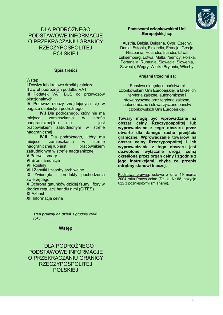 DLA PODRÓŻNEGO PODSTAWOWE INFORMACJE O PRZEKRACZANIU GRANICY RZECZYPOSPOLITEJ POLSKIEJ Spis treści Wstęp I Dewizy lub krajowe środki płatnicze II Zwrot podróżnym podatku VAT III Podatek VAT BUS od przewozów okazjonalnych IV Przewóz rzeczy znajdujących się w bagażu osobistym podróżnego IV.I Dla podróżnego, który nie ma miejsca zamieszkania w strefie nadgranicznej lub nie jest pracownikiem zatrudnionym w strefie nadgranicznej IV.II Dla podróżnego, który ma miejsce zamieszkania w strefie nadgranicznej lub jest pracownikiem zatrudnionym w strefie nadgranicznej V Paliwa i smary VI Broń i amunicja VII Rośliny VIII Zabytki i zasoby archiwalne IX Zwierzęta i produkty pochodzenia zwierzęcego X Ochrona gatunków dzikiej fauny i flory w drodze regulacji handlu nimi (CITES) XI Azbest XII Informacja celna Państwami członkowskimi Unii Europejskiej są: Austria, Belgia, Bułgaria, Cypr, Czechy, Dania, Estonia, Finlandia, Francja, Grecja, Hiszpania, Holandia, Irlandia, Litwa, Luksemburg, Łotwa, Malta, Niemcy, Polska, Portugalia, Rumunia, Słowacja, Słowenia, Szwecja, Węgry, Wielka Brytania, Włochy. Krajami trzecimi są: Państwa niebędące państwami członkowskimi Unii Europejskiej, a także ich terytoria zależne, autonomiczne i stowarzyszone oraz terytoria zależne, autonomiczne i stowarzyszone państw członkowskich Unii Europejskiej. Towary mogą być wprowadzane na obszar celny Rzeczypospolitej lub wyprowadzane z tego obszaru przez otwarte dla danego ruchu przejścia graniczne. Wprowadzanie towarów na obszar celny Rzeczypospolitej i ich wyprowadzanie z tego obszaru jest dozwolone wyłącznie drogą celną określoną przez organ celny i zgodnie z jego instrukcjami, chyba że przepis odrębny stanowi inaczej. Podstawa prawna: ustawa z dnia 19 marca 2004 roku Prawo celne (Dz. U. Nr 68, pozycja 622 z późniejszymi zmianami). stan prawny na dzień 1 grudnia 2008 roku Wstęp DLA PODRÓŻNEGO PODSTAWOWE INFORMACJE O PRZEKRACZANIU GRANICY RZECZYPOSPOLITEJ POLSKIEJ 1 I DEWIZY LUB KRAJOWE ŚRODKI PŁATNICZE krajowymi środkami płatniczymi są waluta polska oraz papiery wartościowe i inne dokumenty, pełniące funkcję środka płatniczego, wystawione w walucie polskiej, wartościami dewizowymi są zagraniczne środki płatnicze oraz złoto dewizowe i platyna dewizowa, zagranicznymi środkami płatniczymi są waluty obce i dewizy, walutami obcymi są znaki pieniężne (banknoty i monety) będące poza krajem prawnym środkiem płatniczym, a także wycofane z obiegu, lecz podlegające wymianie; na równi z walutami obcymi traktuje się wymienialne rozrachunkowe jednostki pieniężne stosowane w rozliczeniach międzynarodowych, w szczególności jednostkę rozrachunkową Międzynarodowego Funduszu Walutowego (SDR), dewizami są papiery wartościowe i inne dokumenty pełniące funkcję środka płatniczego, wystawione w walutach obcych, złotem dewizowym i platyną dewizową jest złoto i platyna w stanie nieprzerobionym oraz w postaci sztab, monet bitych po 1850 r., a także półfabrykatów, z wyjątkiem stosowanych w technice dentystycznej; złotem dewizowym i platyną dewizową są również przedmioty ze złota i platyny zazwyczaj niewytwarzane z tych kruszców, 1. Przekraczający granicę państwową są obowiązani zgłaszać, w formie pisemnej, organom celnym lub organom Straży Granicznej, przywóz na terytorium Rzeczypospolitej Polskiej oraz wywóz za granicę złota dewizowego lub platyny dewizowej, bez względu na ilość, a także krajowych lub zagranicznych środków płatniczych, jeżeli ich wartość przekracza łącznie równowartość 10. 000 euro (dziesięć tysięcy euro). 2. Przekraczający granicę państwową są obowiązani przedstawiać organom celnym lub organom Straży Granicznej, na ich żądanie, przywożone na terytorium Rzeczypospolitej Polskiej lub wywożone za granicę wartości dewizowe oraz krajowe środki płatnicze. Podstawa prawna: Rozporządzenie (WE) nr 18889/2005 Parlamentu Europejskiego i Rady z dnia 26. 10. 2005 roku w sprawie kontroli środków pieniężnych wwożonych do Wspólnoty lub wywożonych ze Wspólnoty (Dz. U. UE L 309); ustawa z dnia 27 lipca 2002 roku Prawo dewizowe (Dz. U. Nr 141, pozycja 1178 z późniejszymi zmianami). II ZWROT PODRÓŻNYM PODATKU VAT Przepisy art. 126-130 ustawy o VAT regulują zasady dokonywania zwrotu VAT podróżnym w systemie TAX FREE. Aby taki zwrot otrzymać, należy spełnić wymagane ustawą warunki: 1. Osoba występująca o zwrot podatku musi mieć status podróżnego. Definicję „podróżnego” na potrzeby VAT określa regulacja art. 126 ust. 1 ustawy. Jest nią osoba fizyczna, której miejsce zamieszkania znajduje się w kraju nienależącym do Unii Europejskiej. Miejsce stałego zamieszkania podróżnego ustala się na podstawie jego paszportu lub innego dokumentu stwierdzającego tożsamość (zgodnie z art. 126 ust. 2 ustawy o VAT). Zatem zwrot podatku może być dokonany jedynie podróżnemu zamieszkałemu w państwie trzecim. 2. Nabyty w Polsce towar musi zostać wywieziony poza terytorium UE Podróżny spełniający przedstawione warunki ma prawo do otrzymania zwrotu zapłaconego VAT przy nabyciu towaru na terytorium kraju, pod warunkiem że w stanie nienaruszonym wywiezie go poza terytorium Wspólnoty w bagażu osobistym. 2 Zakupiony w Polsce towar nie może ulec żadnemu przetworzeniu ani nie może być poddany innemu działaniu, w wyniku którego uległby zmianie jego stan lub charakter. Procedurze zwrotu VAT podlegają wyłącznie nabyte na terytorium Polski towary. Nie ma ona zastosowania do zakupionych przez podróżnego w Polsce usług. Zwrot podatku nie przysługuje również od zakupionego paliwa. 3. Wywóz towaru musi nastąpić w określonym, nieprzekraczalnym terminie Warunkiem otrzymania zwrotu podatku jest również, aby podróżny wywiózł zakupiony towar poza terytorium Wspólnoty nie później niż w ostatnim dniu trzeciego miesiąca następującego po miesiącu
