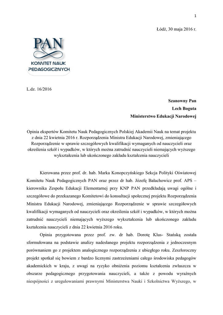 1 Łódź, 30 maja 2016 r. L.dz. 16/2016 Szanowny Pan Lech Boguta Ministerstwo Edukacji Narodowej Opinia ekspertów Komitetu Nauk Pedagogicznych Polskiej Akademii Nauk na temat projektu z dnia 22 kwietnia 2016 r. Rozporządzenia Ministra Edukacji Narodowej, zmieniającego Rozporządzenie w sprawie szczegółowych kwalifikacji wymaganych od nauczycieli oraz określenia szkół i wypadków, w których można zatrudnić nauczycieli niemających wyższego wykształcenia lub ukończonego zakładu kształcenia nauczycieli Kierowana przez prof. dr. hab. Marka Konopczyńskiego Sekcja Polityki Oświatowej Komitetu Nauk Pedagogicznych PAN oraz przez dr hab. Józefę Bałachowicz prof. APS – kierownika Zespołu Edukacji Elementarnej przy KNP PAN przedkładają uwagi ogólne i szczegółowe do przekazanego Komitetowi do konsultacji społecznej projektu Rozporządzenia Ministra Edukacji Narodowej, zmieniającego Rozporządzenie w sprawie szczegółowych kwalifikacji wymaganych od nauczycieli oraz określenia szkół i wypadków, w których można zatrudnić nauczycieli niemających wyższego wykształcenia lub ukończonego zakładu kształcenia nauczycieli z dnia 22 kwietnia 2016 roku. Opinia przygotowana przez prof. zw. dr hab. Dorotę Klus- Stańską została sformułowana na podstawie analizy nadesłanego projektu rozporządzenia z jednoczesnym porównaniem go z projektem analogicznego rozporządzenia z ubiegłego roku. Zeszłoroczny projekt spotkał się bowiem z bardzo licznymi zastrzeżeniami całego środowiska pedagogów akademickich w kraju, z uwagi na ryzyko obniżenia poziomu kształcenia zwłaszcza w obszarze pedagogicznego przygotowania nauczycieli, a także z powodu wyraźnych niespójności z uregulowaniami prawnymi Ministerstwa Nauki i Szkolnictwa Wyższego, w 2 tym negacji kwalifikacji zdobytych na studiach pierwszego stopnia na kierunkach pedagogicznych. W odniesieniu do obecnie konsultowanego projektu trzeba pozytywnie podkreślić próbę uwzględnienia przez Ministerstwo Edukacji Narodowej sformułowanych wówczas stanowisk i starania o podniesienie jakości kształcenia nauczycieli. Szczególnie znaczący jest powrót do koncepcji co najmniej 3-letniego pedagogicznego kształcenia nauczycieli, a nie 2letnego (jak w poprzedniej wersji realnie podważając kwalifikacje zdobyte na studiach pierwszego stopnia i uznając za wystarczające studia magisterskie uzupełniające realizowane po ukończeniu dowolnych innych studiów). Projekt cechują, niestety, dwa nieusunięte mankamenty. Po pierwsze, nadal pozostało niesprecyzowane pojęcie przygotowania pedagogicznego. Nie ma zatem żadnego przełożenia między standardami kształcenia nauczycieli, które obowiązują ośrodki akademickie i które przez uczelnie wyższe są zapewniane, a terminem przygotowanie pedagogiczne używanym w rozporządzeniu. Po drugie, co jest niedociągnięciem jeszcze poważniejszym, obok studiów pierwszego i drugiego stopnia oraz studiów podyplomowych w projekcie zachowano wysoki status kursów kwalifikacyjnych i to prowadzonych także przez ośrodki pozaakademickie. Sugeruje to, że wykonywanie zawodu nauczycielskiego traktowane jest w projekcie jako podobne na przykład do zawodów rzemieślniczych, których jakość nie jest uwarunkowania rozumieniem złożonych procesów psychospołecznych zachodzących w człowieku, społeczeństwie i kulturze. Złożoność współczesnego świata, dynamiczne zmiany zachodzące w nim w nieznanym w dotychczasowej historii tempie, wchodzenie do szkół generacji socjalizowanych w świecie zupełnie odmiennym od tego, w którym socjalizowali się nauczyciele, nowe technologie i strategie wytwarzania wiedzy – to wszystko powoduje, że kadry pedagogiczne stoją przed wyzwaniami daleko przekraczającymi to, co można zapewnić na kursach. Te ostatnie są znakomitą drogą doskonalenia zawodowego w wybranych, określonych treścią kursu obszarach kompetencji. Ale idea zapewniania pełnych kwalifikacji do wykonywania zawodu nauczyciela drogą kursową jest nie do pogodzenia ze staraniami zapewnienia w szkołach pełnowartościowego kształcenia i wychowania. Jakość szkoły zależy w ogromnej mierze od jakości kwalifikacji zatrudnionych w niej nauczycieli, a te ostatnie powinny osiągać poziom profesjonalizmu, który daje się porównać z tym, zdobywanym w krajach, w których edukację narodową traktuje się jako jedno z priorytetowych zadań państwa. Polska powinna nadążać za tymi zmianami, a nie tworzyć 3 ryzyko sytuacji, w której prawie – wykształceni nauczyciele będą prawie – nauczać i prawie – wychowywać. Pedagodzy wczesnej edukacji stwierdzają natomiast, że nowelizacja obowiązującego rozporządzenia jest oczekiwana, a proponowana zmiana powinna porządkować stan prawny. Podobnie sądzą, że przedłożony projekt rodzi szereg zasadniczych kontrowersji i wątpliwości. Proponowane zmiany nie idą bowiem w kierunku podniesienia wymagań wobec nabywanych uprawnień do zawodu nauczyciela, natomiast nadal podtrzymują możliwość uzyskiwania kwalifikacji do nauczania przedmiotu lub prowadzenia zajęć na kursach kwalifikacyjnych. Projektowane rozporządzenie w przedłożonej postaci budzi sprzeciw środowiska pedagogów. Jego treść i rozstrzygnięcia nie zmierzają do podniesienia jakości edukacji dzieci i zapewnienia im jak najlepszej, profesjonalnej opieki, ale przeciwnie – są wyrazem stagnacji dotychczasowych rozwiązań i utrwalają przekonanie co do tego, że poziom wykształcenia nauczycieli małych dzieci może być niski. Jest to przekonanie społecznie i pedagogicznie szkodliwe, gdyż w efekcie najbardziej narażeni na skutki niewłaściwych rozwiązań oświatowych są właśnie najmłodsi. Z projektu rozporządzenia wynika, że po zmianie standardów kształcenia nauczycieli Minister Edukacji Narodowej nadal nie oczekuje od nauczycieli przedszkola i edukacji wczesnoszkolnej wykształcenia na poziomie magisterskim (a nadal