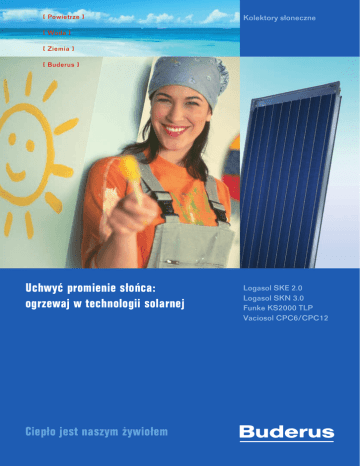 [ Powietrze ] Kolektory słoneczne [ Woda ] [ Ziemia ] [ Buderus ] Uchwyć promienie słońca: ogrzewaj w technologii solarnej Ciepło jest naszym żywiołem Logasol SKE 2.0 Logasol SKN 3.0 Funke KS2000 TLP Vaciosol CPC6/CPC12 Słoneczne widoki z nowoczesną techniką solarną Słońce jest życiem, a energia słoneczna – energią przyszłości. Każdego dnia świeci słońce, obdarowując nas ciepłem, światłem i energią. Energią, którą dzięki urządzeniom solarnym marki Buderus możesz bardzo łatwo wykorzystać, po to żeby np. brać ciepły prysznic i ogrzewać swój dom. A to się opłaca podwójnie: dla ciebie, a także dla natury. Przegląd światowych zasobów energetycznych: rocznie słońce dostarcza więcej energii niż wynoszą wszystkie pozostałe zasoby energetyczne na świecie. Zasoby Energia słoneczna, która rocznie dociera na Ziemię Gaz ziemny Ropa naftowa Węgiel Słońce obdarowuje nas energią. Wykorzystując energię słoneczną, oszczędzasz nie tylko cenne paliwa, ale także obniżasz koszty ogrzewania. Chronisz również środowisko naturalne: już przy powierzchni kolektorów wynoszącej 6m2 ograniczasz roczną emisję CO2 o około 1000 kg. A propos: z techniką solarną marki Buderus wszystko jest możliwe, nieważne, czy chodzi o nowy dom, czy o nowy system ogrzewania, czy o ogrzewanie gorącej wody, czy też o wspomaganie systemu grzewczego. Buderus oferuje nie tylko kolektory słoneczne, ale także całe systemy solarne – a wszystko naprawdę dopracowane. 2 Uran Roczne zużycie tradycyjnych źródeł energii na świecie (2004) Kolektory słoneczne Energia słoneczna: efektywność zaprojektowana Buderus bazuje na ponad 25-letnich doświadczeniach w technologii solarnej. Poszczególne elementy grzewczego systemu solarnego Buderusa to innowacyjna technologia i najnowocześniejsze tworzywa, perfekcyjnie dopracowane w najdrobniejszym szczególe. „W moim grzewczym systemie solarnym wszystko do siebie jest perfekcyjnie dopasowane i pracuje bez zarzutu. To oznacza dla mnie optymalne wykorzystanie energii” Energia na całą wieczność Kolektory słoneczne są skierowane na słońce przez cały rok. Ażeby zapewnić ich optymalną wydajność, oprócz ogromnego doświadczenia potrzebne są również nowoczesne konstrukcje i tworzywa. Na przykład długowieczne i lekkie włókna szklane, które są stosowane w ramach wszystkich kolektorów słonecznych marki Buderus. Dokładnie tak samo ważne jest szkło chroniące kolektor o bardzo dużej przepuszczalności energii, jak również odpowiednie powłoki absorbujące energię. Te niesamowite kolektory urzekną cię precyzyjnym, hermetycznie szczelnym zespoleniem krawędzi lub wypełnieniem gazem szlachetnym. Z nami twój system grzewczy będzie jeszcze lepszy Solarny system grzewczy składa się z większej ilości komponentów niż tylko kolektory słoneczne na dachu. Nie musisz sobie zawracać w ogóle tym głowy – przecież do- Technikę solarną marki Buderus tworzą perfek- stawcą systemów w branży urządzeń solarnych jest właśnie Buderus. Oznacza to, że cyjnie dopracowane systemy. To nie cud, tylko otrzymujesz optymalnie dopasowane ze sobą podzespoły, możesz również bez proble- wynik ponad 25-letniego doświadczenia. mu podłączyć swoje klasyczne centralne ogrzewanie z naszymi urządzeniami solarnymi. Zapytaj o to naszego fachowca od ogrzewania. Hermetycznie szczelne zespolenia wypełnione gazem szlachetnym: dzięki temu w godzinach rannych nie ma żadnego osadu, a energia jest wykorzystana efektywniej. ponad 25 lat doświadczenia w instalacjach solarnych Ramy z włókien szklanych: odporne na korozje i warunki pogodowe wysoka mechaniczna trwałość mocne, długowieczne i lekkie Najnowocześniejsza technologia to lepsza wydajność 3 Energia ze słońca: Logasol SKN 3.0 i SKE 2.0 Kolektory słoneczne Logasol SKN 3.0 i SKE 2.0 charakteryzują się atrakcyjnym stosunkiem ceny do wydajności i nowoczesną technologią. Z ich długowiecznością i jakością są idealne do ogrzewania wody użytkowej. W tej dziedzinie możesz z pewnością polegać na marce Buderus. Płaski kolektor słoneczny Logasol SKN 3.0 Płaski kolektor słoneczny Logasol SKE 2.0 Logasol SKE 2.0 – wydajność za niską cenę Zalety kolektorów Logasol SKN 3.0: Logasol SKE 2.0 to idealne urządzenie dla ludzi, którzy wkraczają w technologię solar- bardzo korzystny stosunek ceny do wydaj- ną, ale nie chcą przy tym zrezygnować z niezawodnej jakości marki Buderus. Miedziana blacha pokryta wyskokoselektywnym absorberem, którego rolę pełni tu lakier solar- ności, wysokie pozyskiwanie energii dzięki ny, jak również jednowarstwowe szkło zabezpieczające o wysokiej przepuszczalności miedzianym powierzchniom pokrytym troszczą się o większą wydajność. Dzięki praktycznej technice łączenia poszczegól- wysokoselektywnym absorberem, nych elementów montaż jest tak łatwy, jak w przypadku innych produktów marki Buderus. Logasol SKE 2.0 jest zatem idealny do podgrzewania wody użytkowej. wysoka przepuszczalność energii przez solarne szkło ochronne, Zalety kolektorów Logasol SKE 2.0: efektywne wykorzystanie dzięki miedzianym powierzchniom pokrytym wysokoselektywnym absorberem, dobre wykorzystanie światła słonecznego przy pomocy przepuszczalnego, jednowarstwowego szkła ochronnego, łatwy montaż. 4 Kolektory słoneczne Logasol SKN 3.0 Logasol SKE 2.0 Wylot ogrzanego czynnika grzewczego Szyba ochronna zbudowana ze specjalnego szkła o przejrzystości sięgającej 91% (15% więcej niż szkło standardowe) Miejsce pomiaru temperatury tuleja pomiarowa, do której można włożyć czujnik temperatury informujący automatykę o temperaturze, jaką ma w danej chwili kolektor Rurki miedziane wypełnione czynnikiem grzewczym Izolacja dla zminimalizowania strat ciepła przez tylną ścianę kolektora Rama montażowa z włókien szklanych lekka, wytrzymała i odporna na warunki atmosferyczne Powierzchni