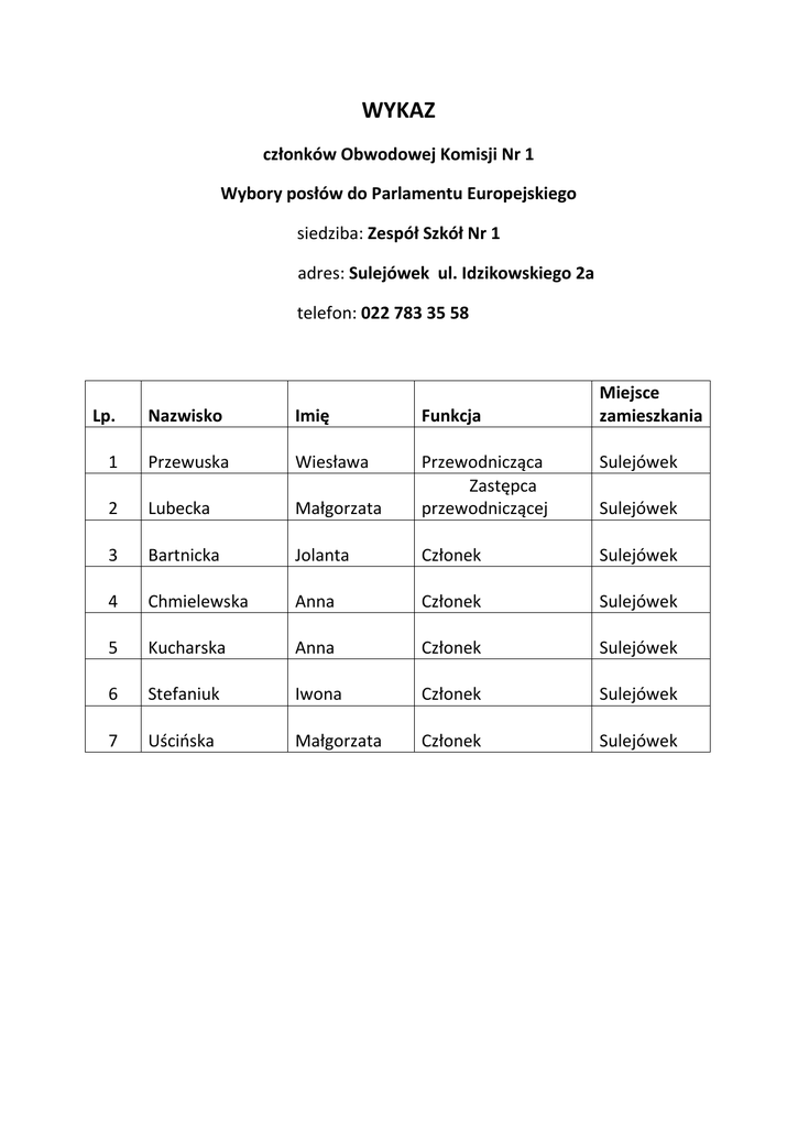WYKAZ członków Obwodowej Komisji Nr 1 Wybory posłów do Parlamentu Europejskiego siedziba: Zespół Szkół Nr 1 adres: Sulejówek ul. Idzikowskiego 2a telefon: 022 783 35 58 Lp. Miejsce zamieszkania Nazwisko Imię Funkcja 1 Przewuska Wiesława Sulejówek 2 Lubecka Małgorzata Przewodnicząca Zastępca przewodniczącej 3 Bartnicka Jolanta Członek Sulejówek 4 Chmielewska Anna Członek Sulejówek 5 Kucharska Anna Członek Sulejówek 6 Stefaniuk Iwona Członek Sulejówek 7 Uścińska Małgorzata Członek Sulejówek Sulejówek WYKAZ członków Obwodowej Komisji Nr 2 Wybory posłów do Parlamentu Europejskiego siedziba: Zespół Szkół Nr 1 adres: Sulejówek ul. Idzikowskiego 2a telefon: 022 783 35 58 Lp. Miejsce zamieszkania Nazwisko Imię Funkcja 1 Zaperta Joanna Sulejówek 2 Jakubczak Danuta Przewodnicząca Zastępca przewodniczącej 3 Chmielewska Agnieszka Członek Sulejówek 4 Czarnocki Janusz Członek Sulejówek 5 Małkiewicz Tomasz Członek Sulejówek 6 Stefaniuk Dariusz Członek Sulejówek 7 Zych Grażyna Członek Sulejówek Sulejówek WYKAZ członków Obwodowej Komisji Nr 3 Wybory posłów do Parlamentu Europejskiego siedziba: Zespół Szkół Nr 2 adres: Sulejówek ul. Okuniewska 2 telefon: 022 783 11 97 Lp. Miejsce zamieszkania Nazwisko Imię Funkcja 1 Zalewski Jacek Sulejówek 2 Zofia 3 Cielecka ChorobińskaPstrzoch Przewodniczący Zastępca przewodniczącego Anna Członek Sulejówek 4 Dudek Natalia Członek Sulejówek 5 Kaczorek Agnieszka Członek Sulejówek 6 Kwietniewski Tomasz Członek Sulejówek 7 Wysocka Halina Członek Sulejówek Sulejówek WYKAZ członków Obwodowej Komisji Nr 4 Wybory posłów do Parlamentu Europejskiego siedziba: Szkoła Podstawowa Nr 3 adres: Sulejówek ul. Głowackiego 47 telefon: 022 783 50 19 Miejsce zamieszkania Lp. Nazwisko Imię Funkcja 1 Gruzińska Grażyna Sulejówek 2 Goźliński Artur Przewodnicząca Zastępca przewodniczącej 3 Janiak Kamil Członek Sulejówek 4 Kapelewska Bożena Członek Sulejówek 5 Przeździecka Zofia Członek Sulejówek 6 Wasilewska Karolina Członek Sulejówek 7 Wyrostkiewicz Joanna Członek Sulejówek Sulejówek WYKAZ członków Obwodowej Komisji Nr 5 Wybory posłów do Parlamentu Europejskiego siedziba: Szkoła Podstawowa Nr 3 adres: Sulejówek ul. Głowackiego 47 telefon: 022 783 50 19 Lp. Miejsce zamieszkania Nazwisko Imię Funkcja 1 Wyrostkiewicz Robert Sulejówek 2 Furmańska Barbara Przewodniczący Zastępca przewodniczącego 3 Garbuliński Adam Członek Sulejówek 4 Krawczyk Julia Członek Sulejówek 5 Morawska Małgorzata Członek Sulejówek 6 Siporski Piotr Członek Sulejówek 7 Wąsowska Marlena Członek Sulejówek Sulejówek WYKAZ członków Obwodowej Komisji Nr 6 Wybory posłów do Parlamentu Europejskiego siedziba: Gimnazjum Nr 2 adres: Sulejówek ul. Narutowicza 10 telefon: 022 783 50 57 Lp. Miejsce zamieszkania Nazwisko Imię Funkcja 1 Zyskowska Joanna Sulejówek 2 Pawłowska Mirosława Przewodnicząca Zastępca przewodniczącej 3 Bartnicki Włodzimierz Członek Sulejówek 4 Chmielewski Piotr Członek Sulejówek 5 Jedlińska Karolina Członek Sulejówek 6 Markowski Cezary Członek Sulejówek 7 Matuszewski Piotr Członek Sulejówek Sulejówek WYKAZ członków Obwodowej Komisji Nr 7 Wybory posłów do Parlamentu Europejskiego siedziba: Gimnazjum Nr 2 adres: Sulejówek ul. Narutowicza 10 telefon: 022 783 50 57 Lp. Miejsce zamieszkania Nazwisko Imię Funkcja 1 Malinowska Renata Sulejówek 2 Kielak Andrzej Przewodnicząca Zastępca przewodniczącej 3 Bujakowska Izabela Członek Sulejówek 4 Lesińska Jolanta Członek Sulejówek 5 Matuszewski Michał Członek Sulejówek 6 Piotrowska Liliana Członek Sulejówek 7 Stefaniak Tomasz Członek Sulejówek Sulejówek WYKAZ członków Obwodowej Komisji Nr 8 Wybory posłów do Parlamentu Europejskiego siedziba: Zespół Szkół Ponadgimnazjalnych adres: Sulejówek ul. Paderewskiego 29 telefon: 022 783 10 09 Lp. Miejsce zamieszkania Nazwisko Imię Funkcja 1 Głodek Marta Sulejówek 2 Zieliński Jacek Przewodnicząca Zastępca przewodniczącej 3 Domańska Maria Członek Sulejówek 4 Pazio Grażyna Członek Sulejówek 5 Szynkiewicz Izabella Członek Sulejówek 6 Tarasow Irena Członek Sulejówek 7 Welter Elżbieta Członek Sulejówek Sulejówek