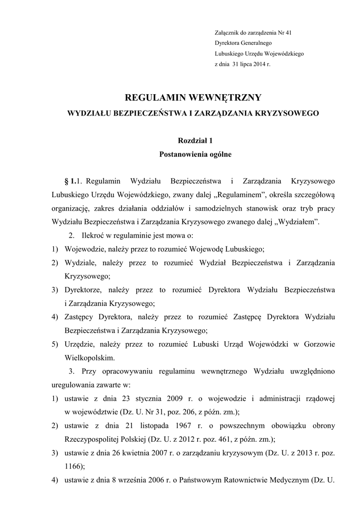 Załącznik do zarządzenia Nr 41 Dyrektora Generalnego Lubuskiego Urzędu Wojewódzkiego z dnia 31 lipca 2014 r. REGULAMIN WEWNĘTRZNY WYDZIAŁU BEZPIECZEŃSTWA I ZARZĄDZANIA KRYZYSOWEGO Rozdział 1 Postanowienia ogólne § 1.1. Regulamin Wydziału Bezpieczeństwa i Zarządzania Kryzysowego Lubuskiego Urzędu Wojewódzkiego, zwany dalej „Regulaminem”, określa szczegółową organizację, zakres działania oddziałów i samodzielnych stanowisk oraz tryb pracy Wydziału Bezpieczeństwa i Zarządzania Kryzysowego zwanego dalej „Wydziałem”. 2. Ilekroć w regulaminie jest mowa o: 1) Wojewodzie, należy przez to rozumieć Wojewodę Lubuskiego; 2) Wydziale, należy przez to rozumieć Wydział Bezpieczeństwa i Zarządzania Kryzysowego; 3) Dyrektorze, należy przez to rozumieć Dyrektora Wydziału Bezpieczeństwa i Zarządzania Kryzysowego; 4) Zastępcy Dyrektora, należy przez to rozumieć Zastępcę Dyrektora Wydziału Bezpieczeństwa i Zarządzania Kryzysowego; 5) Urzędzie, należy przez to rozumieć Lubuski Urząd Wojewódzki w Gorzowie Wielkopolskim. 3. Przy opracowywaniu regulaminu wewnętrznego Wydziału uwzględniono uregulowania zawarte w: 1) ustawie z dnia 23 stycznia 2009 r. o wojewodzie i administracji rządowej w województwie (Dz. U. Nr 31, poz. 206, z późn. zm.); 2) ustawie z dnia 21 listopada 1967 r. o powszechnym obowiązku obrony Rzeczypospolitej Polskiej (Dz. U. z 2012 r. poz. 461, z późn. zm.); 3) ustawie z dnia 26 kwietnia 2007 r. o zarządzaniu kryzysowym (Dz. U. z 2013 r. poz. 1166); 4) ustawie z dnia 8 września 2006 r. o Państwowym Ratownictwie Medycznym (Dz. U. 1 z 2013 r. poz. 757); 5) Statucie Lubuskiego Urzędu Wojewódzkiego w Gorzowie Wlkp. stanowiącym załącznik do zarządzenia Nr 313 Wojewody Lubuskiego z dnia 1 października 2012 r. w sprawie nadania Statutu Lubuskiemu Urzędowi Wojewódzkiemu w Gorzowie Wielkopolskim, ze zm.; 6) Regulaminie Organizacyjnym Lubuskiego Urzędu Wojewódzkiego w Gorzowie Wlkp. stanowiącym załącznik do zarządzenia Nr 400 Wojewody Lubuskiego z dnia 12 grudnia 2012 r. w sprawie ustalenia Regulaminu Organizacyjnego Lubuskiego Urzędu Wojewódzkiego w Gorzowie Wielkopolskim, ze zm. Rozdział 2 Zasady kierowania Wydziałem § 2.1. Całokształtem pracy Wydziału kieruje Dyrektor przy pomocy Zastępcy Dyrektora oraz kierowników poszczególnych oddziałów. 2. Dyrektor zapewnia wykonywanie zadań wynikających z obowiązujących aktów prawnych i zleconych przez Wojewodę. 3. Dyrektor odpowiada przed Wojewodą za prawidłowe i sprawne wykonywanie powierzonych zadań w ramach właściwości rzeczowej Wydziału i ustalonego przez Wojewodę upoważnienia. 4. Dyrektor odpowiada przed Dyrektorem Generalnym za należytą organizację pracy Wydziału. 5. Dyrektor jest bezpośrednim przełożonym pracowników zatrudnionych w Wydziale. 6. Jeśli Dyrektor nie pełni obowiązków z powodu urlopu, choroby lub innych przyczyn, wszystkie czynności należące do Dyrektora wykonuje Zastępca Dyrektora. 7. W razie jednoczesnej nieobecności Dyrektora i jego Zastępcy - zastępstwo obejmuje wyznaczony Kierownik Oddziału a zakres zastępstwa ustala Dyrektor. 8. Zakres upoważnień dla Dyrektora i jego Zastępcy do załatwiania spraw w imieniu Wojewody określa odrębne zarządzenie lub imienne upoważnienie. 9. Zakres upoważnień dla Dyrektora i jego Zastępcy do załatwiania spraw w imieniu Dyrektora upoważnienie. Generalnego określa odrębne zarządzenie lub imienne 2 Rozdział 3 Podział obowiązków pomiędzy Dyrektorem a Zastępcą i Kierownikami Oddziałów § 3.1. Do Dyrektora należy: 1) kierowanie i organizowanie pracy w Wydziale w sposób zapewniający wykonywanie zadań zgodnie z założeniami gospodarczymi, budżetem i przepisami prawa a także wytycznymi Wojewody; 2) nadzorowanie prawidłowego i terminowego wykonywania zadań i załatwiania spraw przez pracowników Wydziału, w tym sumiennego i terminowego załatwiania interesantów; 3) organizowanie i nadzorowanie realizacji zadań wynikających z przepisów prawa oraz zadań i obowiązków nałożonych przez Wojewodę i organy nadrzędne; 4) nadzorowanie przestrzegania przez pracowników dyscypliny pracy oraz przepisów o ochronie informacji niejawnych; 5) informowanie Wojewody i Wicewojewody lub Dyrektora Generalnego o stanie wykonania zadań Wydziału oraz potrzebach związanych z jego funkcjonowaniem; 6) rozstrzyganie sporów kompetencyjnych w Wydziale; 7) podejmowanie inicjatyw zmierzających do rozwiązywania istotnych problemów związanych z pracą Wydziału oraz stałego usprawniania organizacji pracy i poprawy jej efektywności; 8) dbanie o racjonalne wykorzystanie środków pracy jak również stałą poprawę warunków pracy; 9) dbanie o stałe podnoszenie przez pracowników Wydziału kwalifikacji zawodowych; 10) kształtowanie właściwych stosunków pracy wśród podległych pracowników, wdrażanie zasad sumienności, dbałości o pracę i wysokiej jej jakości. 2. W celu wykonania zadań i obowiązków określonych w § 3 Dyrektorowi przysługują następujące uprawnienia: 1) przedkładanie Dyrektorowi Generalnemu projektu Regulaminu Wewnętrznego Wydziału w celu ustalenia w drodze zarządzenia; 2) przydzielanie pracownikom indywidualnych zakresów czynności, określających ich zadania, obowiązki, uprawnienia i zakres odpowiedzialności; 3 3) kontrolowanie prawidłowego i terminowego wykonywania zadań i załatwiania spraw przez pracowników Wydziału; 4) organizowanie z pracownikami Wydziału narad (odpraw służbowych) poświęconych omawianiu, ocenie i rozliczaniu z realizacji zadań w szczególności wynikających z planów i programów Urzędu oraz poleceń Wojewody; 5) ustalanie planów pracy Wydziału i rozliczanie ich realizacji; 6) zapewnianie udziału pracowników w szkoleniach i organizowanie samokształcenia; 7) wydawanie zarządzeń wewnętrznych w zakresie sprawnego funkcjonowania i organizacji Wydziału. 3. Do stosowanych przez Dy