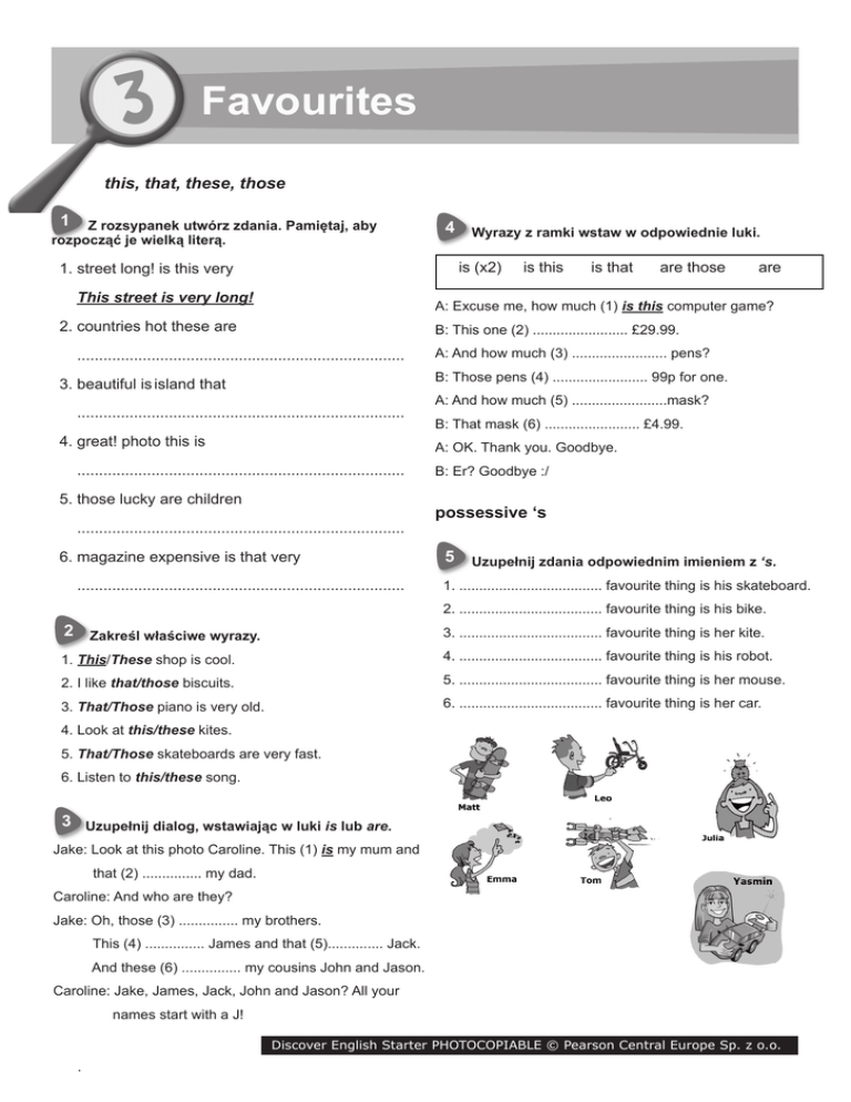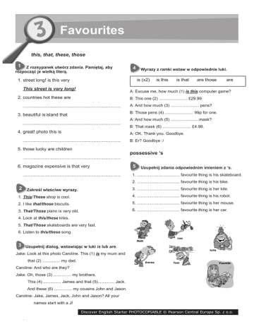 3 Favourites have got/has got this, that, these, those 1 Z rozsypanek utwórz zdania. Pamiętaj, aby rozpocząć je wielką literą. 4 Wyrazy z ramki wstaw w odpowiednie luki. is (x2) 1. street long! is this very This street is very long! is this is that are those are A: Excuse me, how much (1) is this computer game? 2. countries hot these are B: This one (2) ........................ £29.99. ........................................................................... A: And how much (3) ........................ pens? B: Those pens (4) ........................ 99p for one. 3. beautiful isisland that ........................................................................... 4. great! photo this is A: And how much (5) ........................mask? B: That mask (6) ........................ £4.99. A: OK. Thank you. Goodbye. ........................................................................... 5. those lucky are children ........................................................................... 6. magazine expensive is that very ........................................................................... B: Er? Goodbye :/ possessive ‘s 5 Uzupełnij zdania odpowiednim imieniem z ‘s. 1. .................................... favourite thing is his skateboard. 2. .................................... favourite thing is his bike. 2 Zakreśl właściwe wyrazy. 3. .................................... favourite thing is her kite. 1. This/These shop is cool. 4. .................................... favourite thing is his robot. 2. I like that/those biscuits. 5. .................................... favourite thing is her mouse. 3. That/Those piano is very old. 6. .................................... favourite thing is her car. 4. Look at this/these kites. 5. That/Those skateboards are very fast. 6. Listen to this/these song. 3 Uzupełnij dialog, wstawiając w luki is lub are. Jake: Look at this photo Caroline. This (1) is my mum and that (2) ............... my dad. Caroline: And who are they? Jake: Oh, those (3) ............... my brothers. This (4) ............... James and that (5).............. Jack. And these (6) ............... my cousins John and Jason. Caroline: Jake, James, Jack, John and Jason? All your names start with a J! Discover English Starter PHOTOCOPIABLE © Pearson Central Europe Sp. z o.o. . 6 3 Wstaw s lub ‘s. 1. My granddad loves puzzles. 2. Emily ....... family is from Belfast, in Northern Ireland. 3. Is this Oliver ......... hat? 4. Adam lives in the mountain ......... . 5. Is this Mia ......... house? 6. Jake and Jack are brother ......... . 7 Napisz is jeśli ‘s to skrócona forma is, lub p jeśli oznacza posiadanie. 9 Zakreśl właściwe słowa. 1.This man/men is our teacher. 1. This is Harry’s winter coat. p 2.Who are those person/people? 2.Spot’s a good dog. .......... 3.There are 17 child/children in my class. 3.Orange juice is Lena’s favourite drink. .......... 4. Your friend is a very nice person/people. 4.Those are Carly’s stickers. .......... 5.These woman/women are famous actresses. 5. Joe is tired. He’s in bed. .......... 6.The man/men in the photo are footballers. 6.Amy’s uncle is funny. .......... Nieregularna liczba mnoga 8 Rozwiąż krzyżówkę. Discover English Starter PHOTOCOPIABLE © Pearson Central Europe Sp. z o.o.