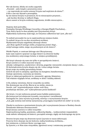 Nie tak dawno, bliska mi osoba zapytała: „Powiedz – jako ksiądz z pewnością wiesz – czy naprawdę nie wolno wieszać krzyża nad wejściem do domu?”. A kto z nas nie słyszał o przesądzie, by nie dawać krzyża w prezencie, bo to nieszczęście przynosi… …jak bardzo tkwimy w sidłach Złego, skoro nawet w krzyżu widzimy zagrożenie, źródło nieszczęścia… Stajemy dziś pośrodku. Pomiędzy liturgią Wielkiego Czwartku a liturgią Wigilii Paschalnej… Tym, który łączy te dwa punkty jest Chrystusowy krzyż. Najbardziej wymowny znak tego, że Chrystus całkowicie był i jest „dla nas”. To miłość prowadzi Go na to najstraszliwsze miejsce kaźni. To miłość strąca Go na dno straszliwej otchłani. Wydarzenie krzyża najpełniej obrazuje słowa: „Syn Boży ogołocił samego siebie, przyjąwszy postać sługi… uniżył samego siebie, stając się posłusznym aż do śmierci”. Wielki Piątek, w centrum którego stoi Ukrzyżowany, każe nam wpierw spojrzeć na Jego śmierć na drzewie hańby (na szubienicy antycznego świata, w miejscu przeklętym). Ale krzyż ukazuje się nam nie tylko w perspektywie śmierci. Krzyż zawiera w sobie znacznie więcej: zdradę i odstępstwo, szyderstwo i drwinę, pogardę i nienawiść, cierpienie duszy i ciała… W doświadczeniu krzyża skupia się zło i wina całego świata. Krzyż staje się wielką spowiedzią świata. Grzech nie jest tu zatajany, spychany na margines, banalizowany… Zostaje ujawniony, nazwany po imieniu. Krzyż w takiej perspektywie to: nienawiść, agresja, kłamstwo. Tak właśnie wygląda świat, uwikłany w złość i ludzką słabość. A On, Jedyny niewinny, bierze wszystko na siebie. Nie dystansuje się od zła. Bierze je na siebie, niesie je. Swoim „tak” wypowiedzianym wobec woli Ojca, przełamuje okrutne „nie” wykrzykiwane przez ludzkość! Ale krzyż, i to już wykracza ponad nasze ludzkie pojmowanie, dla Jezusa jest też miejscem tryumfu, zwycięstwa i uwielbienia! Ewangelia św. Jana wyraża tę prawdę, mówiąc o wywyższeniu krzyża: „A Ja, gdy zostanę nad ziemię wywyższony, przyciągnę wszystkich do siebie” (J 12,32). Chodzi tu zarówno o postawienie krzyża, jak i wywyższenie Jezusa w Boskiej chwale. Świadomie dobrana dwuznaczność. Krzyż Jezusa zawiera w sobie wszystko: Najstraszliwszą hańbę, poniżenie, całkowitą klęskę… i jednocześnie wspaniałość, znak miłości silniejszej od śmierci, początek nowego, nigdy nie kończącego się życia. Drzewo krzyża staje się drzewem życia! (wyraża to nasza dekoracja) Pozorny kres okazuje się nie końcem, żadną bezdenną otchłanią… Jest miejscem, w którym Ojciec wyciąga ręce, by Synowi, a w Nim nam wszystkim, zgotować nowy i ostateczny początek. Swym ostatnim tchnieniem Jezus nie tyle pokonuje śmierć, ile dopełnia dzieła zbawienia. Dzieła, które niesie w sobie życie! Ewangelia Janowa ukazuje to w niełatwy do uchwycenia sposób. W tekście pierwotnym brzmi to następująco: „[Jezus] pochylił głowę i oddał ducha” (nie: wyzionął). Drobna różnica, a znaczy tak wiele. W momencie śmierci Jezus przekazuje nam swojego Ducha. Ten Święty Duch, jako Duch Jezusowy, napełniać będzie całe stworzenie nowym życiem. Krzyż i zmartwychwstanie. Tych dwóch wydarzeń nie można rozdzielać. I tylko patrząc na nie wspólnie możemy te dwa wydarzenia właściwie zrozumieć. Ukazuje to również wielkopiątkowa liturgia. Po wysłuchaniu Pasji i po wezwaniach wielkiej modlitwy powszechnej centralne miejsce liturgii zajmuje adoracja krzyża. Oddamy cześć nie narzędziu śmierci, nie miejscu klęski. Uczcimy drzewo życia, sztandar zwycięstwa, źródło łaski Ducha Świętego. Boża obecność ukryta na krzyżu, staje się widoczna w fakcie Zmartwychwstania. Miłość Boża wychodzi na jaw w całej swej okazałości. W śmierci, w ofierze złożonej z miłości, ukryte jest życie. „W mroku jest tyle światła” – jak zapisał niegdyś poeta Karol Wojtyła. Życie chrześcijanina jednoczy w sobie śmierć i nowe życie. Ten, kto naśladuje Chrystusa, doświadcza różnych wymiarów śmierci: Obrażany przez innych, przyciskany do muru, prześladowany, powalany na ziemię… Ale właśnie dzięki temu zaczyna kiełkować w nas nowe życie, życie Zmartwychwstania. Tak oto krzyż jest i pozostaje ciągle obecny wśród nas. Nie tylko w naszych osobistych krzyżach, które dźwigamy każdego dnia… Ale też w ciągle wśród nas obecnym krzyżu Jezusa Chrystusa. Święty Augustyn uchwycił to w sposób nadzwyczaj przejrzysty: „Nasza Głowa jest już w niebie, a jednak cierpi tu na ziemi, jak długo cierpi Kościół. Tu, na ziemi, Chrystus głoduje, w tym życiu cierpi pragnienie, jest nagi, obcy, zamknięty w więzieniu. Tym wszystkim, czym cierpi Kościół, cierpi i On. …Podobnie jest i z naszym ciałem. A jednak, kiedy ktoś w tłumie nadepnie na twoje stopy, czyż to nie głowa krzyczy: nadepnąłeś mnie? …Tak i Chrystus jako Głowa, której nikt nie jest w stanie podeptać, woła …” i stale cierpi. Tak oto Jezus jest wciąż uwikłany w krzyż świata. Krzyż Chrystusa nie jest jakąś już załatwioną raz na zawsze sprawą z przeszłości. Każdego dnia trwa, nie przemija, jest obecny. W krzyżu skrywa się Boża Miłość. Przez fakt Zmartwychwstania staje się ona cudownie widoczna. W śmierci już teraz jest życie. Mając taką nadzieję, możemy nieść swój krzyż, swoje troski i cierpienia, niepowodzenia i porażki. To nie jest tylko nasz krzyż. Nad każdym Wielkim Piątkiem wschodzi słońce Niedzieli Zmartwychwstania. Amen.