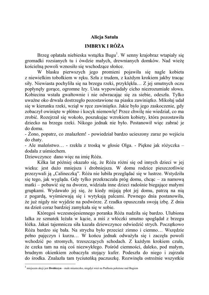 Alicja Satuła IMBRYK I RÓŻA Brzeg oplatała niebieska wstążka Bugu1. W senny krajobraz wtapiały się gromadki rozsianych tu i ówdzie małych, drewnianych domków. Nad wieżę kościelną powoli wznosiło się wschodzące słońce. W blasku pierwszych jego promieni pojawiła się nagle kobieta z niewielkim tobołkiem w ręku. Szła z trudem, z każdym krokiem jakby tracąc siły. Niewiasta pochyliła się na brzegu rzeki, przyklękła… Z jej smutnych oczu popłynęły gorące, ogromne łzy. Usta wypowiadały cicho niezrozumiałe słowa. Kobiecina wstała gwałtownie i nie odwracając się za siebie, odeszła. Tylko uważne oko drwala dostrzegło pozostawione na piasku zawiniątko. Mikołaj udał się w kierunku rzeki, wziął w ręce zawiniątko. Jakie było jego zaskoczenie, gdy zobaczył owinięte w płótno i kocyk niemowlę! Przez chwilę nie wiedział, co ma zrobić. Rozejrzał się wokoło, poszukując wzrokiem kobiety, która pozostawiła dziecko na brzegu rzeki. Nikogo jednak nie było. Postanowił więc zabrać je do domu. - Żono, popatrz, co znalazłem! - powiedział bardzo ucieszony zaraz po wejściu do chaty. - Ale maleństwo… - rzekła z troską w głosie Olga. - Piękne jak różyczka – dodała z uśmiechem. Dziewczynce dano więc na imię Róża. Kilka lat później okazało się, że Róża różni się od innych dzieci w jej wieku: jest dużo mniejsza i drobniejsza. W domu rodzice pieszczotliwie przezywali ją „Calineczką”. Róża nie lubiła przeglądać się w lustrze. Wstydziła się tego, jak wygląda. Gdy tylko przekraczała próg domu, chcąc – za namową matki – pobawić się na dworze, widziała inne dzieci radośnie biegające małymi grupkami. Wydawało jej się, że kiedy mijają płot jej domu, patrzą na nią z pogardą, wyśmiewają się i wytykają palcami. Pewnego dnia postanowiła, że już nigdy nie wyjdzie na podwórze. Z rzadka opuszczała swoją izbę. Z dnia na dzień coraz bardziej zamykała się w sobie. Któregoś wczesnojesiennego poranka Róża nudziła się bardzo. Ulubiona lalka ze szmatek leżała w kącie, a miś z włóczki smutno spoglądał z brzegu łóżka. Jakaś tajemnicza siła kazała dziewczynce odwiedzić strych. Początkowo Róża bardzo się bała. Na strychu było przecież zimno i ciemno… Wszędzie pełno pajęczyn i kurzu… W końcu jednak odważyła się i zaczęła powoli wchodzić po stromych, trzeszczących schodach. Z każdym krokiem czuła, że czeka tam na nią coś niezwykłego. Pośród ciemności, daleko, pod małym, brudnym okienkiem zobaczyła stojący kufer. Podeszła do niego i zajrzała do środka. Znalazła tam tyciuteńką paczuszkę. Rozwinęła ostrożnie wszystkie 1 miejscem akcji jest Drohiczyn – małe miasteczko, niegdyś wieś na Podlasiu położone nad Bugiem koniuszki płóciennej wiązki i na samym jej dnie odkryła potłuczone kawałki porcelany. Owinęła je z powrotem i zabrała ze sobą. Usiadła w kąciku pod oknem, aby uważnie przyjrzeć się zagadkowemu znalezisku. Zaczęła składać kawałek po kawałku aż zauważyła, że wszystko stanowi jedną całość – biały imbryczek do herbaty. Brakowało jedynie szyjki, ale i tak był piękny. Z pomocą taty skleiła naczynko, nasypała w nie świeżej ziemi, do środka włożyła nasionko tulipanu, które dostała od mamy i postawiła imbryk na komódce w pobliżu łóżka. Zapadał zmrok. Nadeszła noc. Róża usnęła, patrząc cały czas na swego nowego przyjaciela. Ze snu obudził ją głos wydobywający się z imbryka: - Och! Nareszcie! Po tylu latach ktoś mnie znalazł i pobudził do życia! I ten kwiatuszek, który znów we mnie rośnie! Tyle radości, tyle radości! Dziewczynka z wrażenia usiadła na łóżku. Wkoło było zupełnie ciemno. Rodzice spali w sąsiedniej izbie. Nikogo oprócz niej w pokoju nie było. - Dlaczego nic nie mówisz? Może się przywitasz? – usłyszała ponownie. - Mam na imię Róża. A ty, kim jesteś? – powiedziała niepewnie. - Ależ, kochana! Jestem imbrykiem, który znalazłaś na strychu – odrzekł ktoś w ciemnościach. „To niesamowite! Gadający imbryk? To się nie dzieje naprawdę!” - A tak, gadający! I jestem tu, na komodzie obok ciebie. Sama mnie tu postawiłaś – rzekł imbryk, najwyraźniej czytając w jej myślach. Najbliższe tygodnie były najszczęśliwsze w życiu Róży. Imbryk stał się jej największym i najserdeczniejszym przyjacielem. Zwierzała mu się z tęsknoty za mamą, której nigdy nie znała, z miłości do rodziców, którzy ją wychowali, strachu przed ludźmi i żalu wywołanego swoim dziwacznym wyglądem. Razem wymyślali fantastyczne historie, bohaterami których byli szmacianka lalka i miś z włóczki. Imbryk wielokrotnie zachęcał dziewczynkę do wyjścia przed dom i zabawy z innymi dziećmi. Przekonywał ją, że nie zawsze możemy być pewni tego, co myślą o nas inni. Warto jest poznać ludzi, dać im możliwość poznania siebie, aby móc przekonać się o ich prawdziwym obliczu. Róża jednak nie dawała się namówić. Pewnego listopadowego wieczoru Róża jak zwykle zasypiała przy opowieści imbryczka. Tym razem jednak historia brzmiała nieco inaczej: (…) Dziwna harmonia w duszy mi dźwięczy, gdy wraz z nikłemi dźwiękami, Północnym wichrem ziemia zajęczy, zapłacze deszczem i mgłami. Kiedy listopad w drugiej swej dobie, łzami się wspomnień skrysztali, A dłoń ludzkości na każdym grobie światło w cześć zmarłym zapali (…) Lubię więc dzień ten Zaduszny, stary, co innym myśli zasmuca; On mi złociste promienie wiary na pomrok życia tu zrzuca (…) 2 2 Gloger Z., Rok polski w życiu, tradycji i pieśni, Warszawa 1994, s.349-350 Nagle ucichł. Izbę wypełniła szara, gęsta mgła. Wtem w oddali Róża ujrzała światło. Dziewczynka zobaczyła przed sobą glinianą tabliczkę otoczoną promienistą łuną. Zbliżyła się ostrożnie i niepewnie. Tabliczka zdawała się poruszać w jej stronę. W