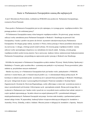 www.radiomaryja.pl/artykuly.php?id=110405 2011-02-27 Staże w Parlamencie Europejskim szansą dla najlepszych Z prof. Mirosławem Piotrowskim, wykładowcą WSKSiM oraz posłem do Parlamentu Europejskiego, rozmawia Paweł Pasionek Praca posła w Parlamencie Europejskim jest na tyle zajmująca, że wymaga grona współpracowników. Kto pomaga posłom w ich codziennej pracy? - W Parlamencie Europejskim mamy różne kategorie współpracowników. Do pierwszej grupy możemy zaliczyć osoby zatrudnione przez Parlament Europejski w Brukseli i Strasburgu na prawach Unii Europejskiej. I każdy z posłów ma prawo do dwóch asystentów akredytowanych przy Parlamencie Europejskim. Do drugiej grupy należą asystenci w Polsce, którzy pracują w biurze poselskim mieszczącym się zazwyczaj w okręgu, z którego poseł został wybrany. Do trzeciej grupy współpracowników można zaliczyć osoby sporządzające ekspertyzy czy zatrudniane do innych zadań. Kolejną, czwartą grupę współpracowników posła tworzą stażyści. Są to zazwyczaj studenci, którzy zainteresowani funkcjonowaniem Parlamentu Europejskiego przyjeżdżają na zaproszenie posła i pracują w Brukseli oraz Strasburgu. Od kilku lat stażystami w Parlamencie Europejskim są także studenci Wyższej Szkoły Kultury Społecznej i Medialnej w Toruniu, gdyż uczelnia dba o systematyczne praktyki w tej instytucji. Proszę powiedzieć, jakie zadania są przydzielane naszym studentom? - Bardzo się cieszę, że w Parlamencie Europejskim było już bardzo wielu praktykantów z WSKSiM, zarówno w moim biurze, jak i w biurach innych posłów czy w sekretariatach frakcji politycznych. W korelacji ze stałymi asystentami posła uczestniczą oni w pracach biura poselskiego w Brukseli i Strasburgu, ale są też delegowani do prac w poszczególnych komisjach. Ponieważ zasiadam w Komisji Spraw Zagranicznych i Komisji ds. Rozwoju Regionalnego, osoby odbywające u mnie staż uczestniczą razem ze mną w posiedzeniach tych komisji. Zobowiązane są do sporządzania notatek. Biorąc pod uwagę fakt, że wydarzeń w Parlamencie jest bardzo wiele i poseł nie we wszystkich może osobiście brać udział, stażyści w części spotkań reprezentują go. Są także obecni na sesjach plenarnych PE i posiedzeniach delegacji międzyparlamentarnych. Parlament Europejski utrzymuje bowiem stałe kontakty z parlamentami państw niemal całego świata. W poprzedniej kadencji byłem wiceprzewodniczącym delegacji ds. kontaktów z Australią i Nową Zelandią, a także z Indiami. Obecnie jestem w delegacji ds. kontaktów z Japonią. Stażyści www.radiomaryja.pl Strona 1/3 biorą zatem udział w licznych spotkaniach z dyplomatami z różnych części świata. Jak wiedza i umiejętności pozyskane podczas studiów w WSKSiM przekładają się na pracę naszych studentów jako stażystów w Parlamencie Europejskim? - Należy podkreślić, że przedmioty wykładane w Wyższej Szkole Kultury Społecznej i Medialnej w Toruniu są nie tylko pomocne, ale wręcz konieczne. Mając przegląd wielu studentów odbywających u mnie staże, także z innych uczelni, stwierdzam, iż WSKSiM kształci na najwyższym poziomie. Kiedy wybierałem swojego stałego asystenta do pracy w Brukseli i Strasburgu, przyjmując jako kryterium zdobyte podczas studiów kompetencje, zatrudniłem absolwenta Wyższej Szkoły Kultury Społecznej i Medialnej i jestem przekonany, że dokonałem dobrego wyboru. Ta uczelnia daje ugruntowany pogląd na świat poprzez głębsze spojrzenie filozoficzne, wykłady z historii i nauk politycznych, ale i kompetentną wiedzę fachową oraz profesjonalne umiejętności z zakresu dziennikarstwa. Wysoko oceniam też znajomość języków obcych przyjeżdżających do mnie na praktyki studentów. Trzeba podkreślić, że WSKSiM daje bardzo szeroką wiedzę z zakresu mediów, która w pracy w Parlamencie Europejskim jest niezbędna. Obecnie właściwie na każdym poziomie działania tej instytucji konieczna jest umiejętność współpracy z mediami, gdyż funkcjonują tam liczne studia radiowe, telewizyjne i newsroomy. Doświadczenie zawodowe uzyskane podczas praktyk w Parlamencie Europejskim jest zapewne dużym plusem przy poszukiwaniu ciekawej i dobrze płatnej pracy. - Niewątpliwie już samo zamieszczenie informacji w CV o praktykach w Parlamencie Europejskim jest ważną wiadomością dla przyszłego pracodawcy, bo wskazuje na aktywność i aspiracje danej osoby. Podczas oficjalnych egzaminów, przeprowadzanych zarówno w Parlamencie Europejskim oraz Komisji Europejskiej, jak i w innych instytucjach Unii Europejskiej, należy wykazać się także znajomością politycznego funkcjonowania Unii, które najlepiej poznaje się poprzez praktyki w Parlamencie Europejskim. Jest to bardzo dobre przygotowanie do udziału w konkursach umożliwiających zdobycie pracy w instytucjach Unii Europejskiej. Stażysta w Parlamencie Europejskim ma również niepowtarzalną szansę nawiązania licznych i cennych kontaktów, które są pomocne w przyszłości w pracy dla wspólnego dobra. Dziękuję za rozmowę. ****************** Urszula Koszarek, III rok dziennikarstwa i komunikacji społecznej: Staż w Parlamencie Europejskim w Brukseli był dla mnie szkołą życia i dobrym przygotowaniem do pracy zawodowej. Z racji tego, że studiuję dziennikarstwo, interesowały mnie stanowiska dziennikarskie w Parlamencie UE. Miałam okazję codziennie śledzić, w jaki sposób pracują zawodowcy z różnych państw i www.radiomaryja.pl Strona 2/3 myślę, że jest to jedno z cenniejszych doświadczeń, jakie wywiozłam z Brukseli. Lecz oprócz pracy, wystarczyło także czasu na zwiedzanie miasta. Bruksela ma bardzo piękną starówkę, którą warto zobaczyć. ****************** Anita Suraj, I rok studiów uzupełniających magisterskich na kierunku politologia: W bieżącym roku akademickim odbyłam miesięczny staż w Parlamencie Europejskim w Brukseli. Jednym z zadań, do którego zos