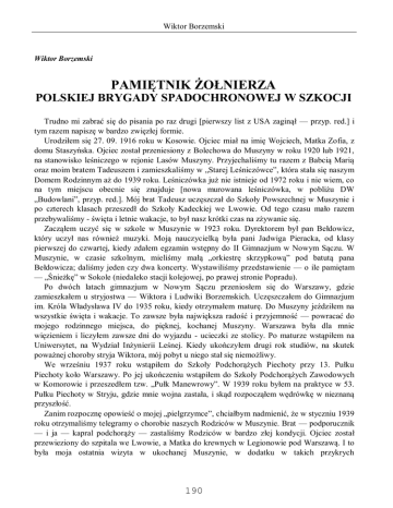 Wiktor Borzemski Wiktor Borzemski PAMIĘTNIK ŻOŁNIERZA POLSKIEJ BRYGADY SPADOCHRONOWEJ W SZKOCJI Trudno mi zabrać się do pisania po raz drugi [pierwszy list z USA zaginął — przyp. red.] i tym razem napiszę w bardzo zwięzłej formie. Urodziłem się 27. 09. 1916 roku w Kosowie. Ojciec miał na imię Wojciech, Matka Zofia, z domu Staszyńska. Ojciec został przeniesiony z Bolechowa do Muszyny w roku 1920 lub 1921, na stanowisko leśniczego w rejonie Lasów Muszyny. Przyjechaliśmy tu razem z Babcią Marią oraz moim bratem Tadeuszem i zamieszkaliśmy w „Starej Leśniczówce‖, która stała się naszym Domem Rodzinnym aż do 1939 roku. Leśniczówka już nie istnieje od 1972 roku i nie wiem, co na tym miejscu obecnie się znajduje [nowa murowana leśniczówka, w pobliżu DW „Budowlani‖, przyp. red.]. Mój brat Tadeusz uczęszczał do Szkoły Powszechnej w Muszynie i po czterech klasach przeszedł do Szkoły Kadeckiej we Lwowie. Od tego czasu mało razem przebywaliśmy - święta i letnie wakacje, to był nasz krótki czas na zżywanie się. Zacząłem uczyć się w szkole w Muszynie w 1923 roku. Dyrektorem był pan Bełdowicz, który uczył nas również muzyki. Moją nauczycielką była pani Jadwiga Pieracka, od klasy pierwszej do czwartej, kiedy zdałem egzamin wstępny do II Gimnazjum w Nowym Sączu. W Muszynie, w czasie szkolnym, mieliśmy małą „orkiestrę skrzypkową‖ pod batutą pana Bełdowicza; daliśmy jeden czy dwa koncerty. Wystawiliśmy przedstawienie — o ile pamiętam — „Śnieżkę‖ w Sokole (niedaleko stacji kolejowej, po prawej stronie Popradu). Po dwóch latach gimnazjum w Nowym Sączu przeniosłem się do Warszawy, gdzie zamieszkałem u stryjostwa — Wiktora i Ludwiki Borzemskich. Uczęszczałem do Gimnazjum im. Króla Władysława IV do 1935 roku, kiedy otrzymałem maturę. Do Muszyny jeździłem na wszystkie święta i wakacje. To zawsze była największa radość i przyjemność — powracać do mojego rodzinnego miejsca, do pięknej, kochanej Muszyny. Warszawa była dla mnie więzieniem i liczyłem zawsze dni do wyjazdu - ucieczki ze stolicy. Po maturze wstąpiłem na Uniwersytet, na Wydział Inżynierii Leśnej. Kiedy ukończyłem drugi rok studiów, na skutek poważnej choroby stryja Wiktora, mój pobyt u niego stał się niemożliwy. We wrześniu 1937 roku wstąpiłem do Szkoły Podchorążych Piechoty przy 13. Pułku Piechoty koło Warszawy. Po jej ukończeniu wstąpiłem do Szkoły Podchorążych Zawodowych w Komorowie i przeszedłem tzw. „Pułk Manewrowy‖. W 1939 roku byłem na praktyce w 53. Pułku Piechoty w Stryju, gdzie mnie wojna zastała, i skąd rozpocząłem wędrówkę w nieznaną przyszłość. Zanim rozpocznę opowieść o mojej „pielgrzymce‖, chciałbym nadmienić, że w styczniu 1939 roku otrzymaliśmy telegramy o chorobie naszych Rodziców w Muszynie. Brat — podporucznik — i ja — kapral podchorąży — zastaliśmy Rodziców w bardzo złej kondycji. Ojciec został przewieziony do szpitala we Lwowie, a Matka do krewnych w Legionowie pod Warszawą. I to była moja ostatnia wizyta w ukochanej Muszynie, w dodatku w takich przykrych 190 Pamiętnik żołnierza Polskiej Brygady Spadochronowej w Szkocji okolicznościach. Ojciec zmarł we Lwowie w lutym 1939 roku, wtedy to po raz ostatni spotkałem się z moim bratem Tadeuszem. 53. Pułk Piechoty w Stryju od 1 września zaczął mobilizację. Na papierze wyglądało to dobrze, ale w praktyce to inna historia. Zaraz na trzeci dzień, o ile pamiętam, były trzy naloty i bombardowanie mostu na Stryju — chociaż niezbyt skuteczne. Po kilku dniach Pułk wyruszył pociągiem na zachód, aby bronić przepraw, zdaje mi się w Przemyślu. Niestety nie dojechaliśmy daleko. Bombardowany i ostrzeliwany Pułk powrócił na piechotę do Stryja, już w dużo mniejszej liczbie, na skutek sporej dezercji żołnierzy wywodzących się z mniejszości ukraińskiej oraz spośród Łemków. W międzyczasie przyszły wiadomości o wkroczeniu Rosji na ziemie polskie oraz ostatni rozkaz Rządu, by przekroczyć granicę do Węgier czy Rumunii, z zadaniem dotarcia do Francji. Pozostawiłem więc wszystko w mojej walizie, zabrałem płaszcz oraz chlebak i wraz z 8. Kompanią, jako dowódca plutonu, wyruszyłem drogą w kierunku granicy węgierskiej. 1 tutaj też nie obeszło się bez artylerii niemieckiej, która nas obsypała dość silnym ogniem, powodując straty w zabitych i rannych. Przyszedł wieczór. Następnego dnia tylko kilka samolotów rozpoznawczych przelatywało. I tak domaszerowali- śmy do granicy, o ile pamiętam, w Skolem, dnia 21 września 1939 roku. Na drugi dzień złożyliśmy broń w ręce węgierskiej armii; po południu zajechał pociąg i ruszyliśmy w głąb Węgier. W końcu zostaliśmy rozmieszczeni w różnych obozach dla internowanych. W styczniu z małą grupką (4) jeńców uciekliśmy z obozu i dotarliśmy do Budapesztu; niestety w momencie przekraczania ulicy do polskiego konsulatu zostaliśmy aresztowani przez węgierską policję i zamknięci w cywilnym więzieniu w Budapeszcie. Dzięki interwencji polskiego konsulatu zostaliśmy zwolnieni i umieszczeni w obozie cywilnym w Barc w marcu 1940 roku. Po wielu wysiłkach w końcu udało nam się przeprawić łodzią przez rzekę Drawę do Jugosławii (obecnie Chorwacja) z początkiem kwietnia, następnie z portu w Splicie statkiem „Warszawa‖ dopłynęliśmy do Marsylii we Francji. Było to 17 kwietnia 1940 roku. Stamtąd przewieziono nas do obozu weryfikacyjnego do Carpiagne. Na szczęście miałem ze sobą swoją legitymację z fotografią ze Szkoły Podchorążych w Komorowie. Wtedy po raz pierwszy dowiedziałem się, że otrzymałem promocję do stopnia podporucznika ze starszeństwem od 1 IX 1939 roku. Nie będę wchodził w szczegóły organizacji Armii Polskiej we Francji, opiszę tylko moje osobiste przeżycia. Nie mieliśmy w tym czasie wielu żołnierzy. Przyszedł rozkaz, że trzeba ochotnik