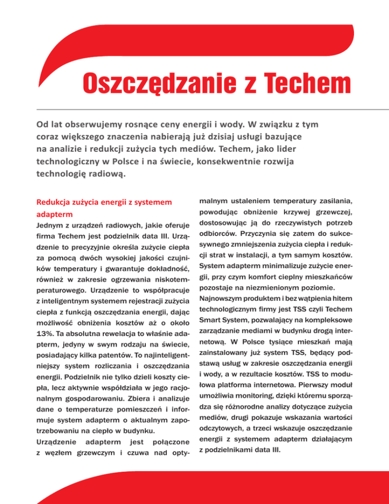 TECHEM Oszczędzanie z Techem Od lat obserwujemy rosnące ceny energii i wody. W związku z tym coraz większego znaczenia nabierają już dzisiaj usługi bazujące na analizie i redukcji zużycia tych mediów. Techem, jako lider technologiczny w Polsce i na świecie, konsekwentnie rozwija technologię radiową. Redukcja zużycia energii z systemem adapterm Jednym z urządzeń radiowych, jakie oferuje firma Techem jest podzielnik data III. Urządzenie to precyzyjnie określa zużycie ciepła za pomocą dwóch wysokiej jakości czujników temperatury i gwarantuje dokładność, również w zakresie ogrzewania niskotemperaturowego. Urządzenie to współpracuje z inteligentnym systemem rejestracji zużycia ciepła z funkcją oszczędzania energii, dając możliwość obniżenia kosztów aż o około 13%. Ta absolutna rewelacja to właśnie adapterm, jedyny w swym rodzaju na świecie, posiadający kilka patentów. To najinteligentniejszy system rozliczania i oszczędzania energii. Podzielnik nie tylko dzieli koszty ciepła, lecz aktywnie współdziała w jego racjonalnym gospodarowaniu. Zbiera i analizuje dane o temperaturze pomieszczeń i informuje system adapterm o aktualnym zapotrzebowaniu na ciepło w budynku. Urządzenie adapterm jest połączone z węzłem grzewczym i czuwa nad opty- 48 malnym ustaleniem temperatury zasilania, powodując obniżenie krzywej grzewczej, dostosowując ją do rzeczywistych potrzeb odbiorców. Przyczynia się zatem do sukcesywnego zmniejszenia zużycia ciepła i redukcji strat w instalacji, a tym samym kosztów. System adapterm minimalizuje zużycie energii, przy czym komfort cieplny mieszkańców pozostaje na niezmienionym poziomie. Najnowszym produktem i bez wątpienia hitem technologicznym firmy jest TSS czyli Techem Smart System, pozwalający na kompleksowe zarządzanie mediami w budynku drogą internetową. W Polsce tysiące mieszkań mają zainstalowany już system TSS, będący podstawą usług w zakresie oszczędzania energii i wody, a w rezultacie kosztów. TSS to modułowa platforma internetowa. Pierwszy moduł umożliwia monitoring, dzięki któremu sporządza się różnorodne analizy dotyczące zużycia mediów, drugi pokazuje wskazania wartości odczytowych, a trzeci wskazuje oszczędzanie energii z systemem adapterm działającym z podzielnikami data III. Poradnik energooszczędność TECHEM Redukcja zużycia wody dzięki filtrom Techem Firma Techem aktywnie wspiera działania w zakresie bezpośredniej redukcji zużycia wody. Na podstawie danych dostarczanych przez TSS oraz w oparciu o analizy sporządzane online w portalu, klient we współ- Rys. Techem Wszystkie dane dostępne są w portalu online, który jest centralnym źródłem informacji, pozwalającym klientowi na skuteczne zarządzanie swoimi zasobami. Oszczędzanie energii i wody rozpoczyna się od znajomości własnego zużycia. Za pomocą portalu online zarządzający otrzymuje bie- Rysunek 1. Analiza zużyć energii i wody żące i przejrzyste informacje na temat stanu energetycznego swoich nieruchomości (Rys. 1). Dzięki temu jest zawsze w stanie odpowiedzieć na pytania i służyć radą swoim mieszkańcom. Szacowania i kwestie sporne pochodzące od lokatorów redukowane są do minimum. Wszechstronne analizy, które można sporządzać w dowolnej chwili online identyfikują problemy, prowadząc do ich usunięcia. udziale Techem ma możliwość zmniejszać zużycie wody poprzez indywidualnie ustaloną dla każdego budynku redukcję ciśnienia w połączeniu z montażem filtrów wody. Efektem tego jest nie tylko obniżenie kosztów, lecz także poprawa jakości wody, ochrona armatury oraz zwiększenie komfortu podczas korzystania z bieżącej wody. Techem Techniki Pomiarowe Sp. z o.o. ul. Romana Maya 1, 61-371 Poznań tel.: 61 650 25 25; faks: 61 650 25 50 www.techem.pl, e-mail: [email protected] www.administrator24.info 49