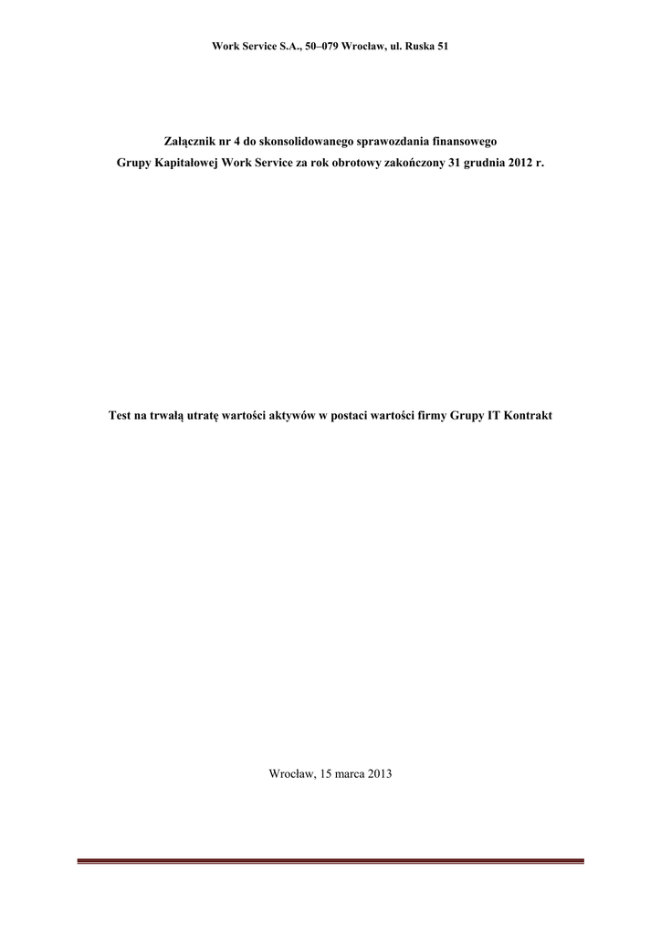 Work Service S.A., 50–079 Wrocław, ul. Ruska 51 Załącznik nr 4 do skonsolidowanego sprawozdania finansowego Grupy Kapitałowej Work Service za rok obrotowy zakończony 31 grudnia 2012 r. Test na trwałą utratę wartości aktywów w postaci wartości firmy Grupy IT Kontrakt Wrocław, 15 marca 2013 Work Service S.A., 50–079 Wrocław, ul. Ruska 51 I. Przedmiot Przedmiotem niniejszego testu jest wartość firmy, jaka powstała w wyniku nabycia udziałów w spółce IT Kontrakt Sp. z o.o. W dniu 5 kwietnia 2012 r. Work Service S.A. nabyła 7.500 udziałów w Spółce IT Kontrakt Sp. z o. o. z siedzibą we Wrocławiu, która obecnie wraz z 6 spółkami od niej zależnymi tworzy Grupę Kapitałową IT Kontrakt (spółkami zależnymi od IT Kontrakt Sp. z o.o. są IT Kontrakt Centrum Kształcenia Sp. z o.o. z siedzibą we Wrocławiu, IT Kontrakt GmbH z siedzibą w Stuttgarcie, Stermedia Sp. z o.o., w której IT Kontrakt Sp. z o.o. posiada 75,4% udziałów, Ebremor Trading Limited, w której IT Kontrakt Sp. z o.o. posiada 90% udziałów, 0,09% udziałów w kapitale zakładowym tej spółki posiada IP Work Service Cypr. Limited a 9,91% udziałów w kapitale zakładowym obejmuje spółka IP IT Kontrakt Partnership oraz IP IT Kontrakt Partnership – jest to spółka partnerska, w której 0,1% kapitału zakładowego zastało objęte przez spółkę Work Service IP Cypr. Ltd (w 100% zależną od Work Service S.A.), a 99,9% kapitałów zostało objętych przez spółkę IT Kontrakt Sp. z o.o. (w 75% zależną od Work Service S.A.). Grupa IT Kontrakt dzięki doświadczeniu oraz znajomości rynku, na którym działa, zdobyła zaufanie największych w kraju banków, towarzystw ubezpieczeniowych, firm telekomunikacyjnych i informatycznych oraz innych przedsiębiorstw realizujących projekty IT. Usługi oferowane przez Grupę IT Kontrakt obejmują: usługi outsourcingu kadry IT oraz outsourcingu testowania jakości systemów informatycznych, outsourcingu zarządzania projektami IT oraz rekrutacji pracowników na stanowiska informatyczne. Baza danych Grupy zawiera opis kompetencji ponad 25 tysięcy specjalistów IT. Na co dzień ponad 300 ekspertów zatrudnionych przez Grupę IT Kontrakt pracuje przy dużych projektach informatycznych dla takich klientów jak: BZ WBK, AIG Bank Polska, NBP, Cyfrowy Polsat, Netia, Siemens, KGHM, Warta, PZU. Cena zakupu udziałów w Spółce IT Kontrakt Sp. z o.o. obejmowała 3 elementy, tj.: 1. Płatność gotówkową ustaloną na poziomie 45.000.000zł 2. „Dopłatę 1”, która wynosi 4.766.453,60zł 3. „Dopłatę 2”, która stanowi uzupełnienie ceny zakupu. Jest ona należna każdemu wspólnikowi w wysokości 7% Zmodyfikowanego Rocznego Zysku Netto Spółki IT Kontrakt za każdy rok, w którym wspólnik będzie pełnił funkcję określoną w umowie inwestycyjnej (zarządzanie Spółką IT Kontrakt Sp. z o.o. w okresie współpracy) do roku 2014 włącznie. Zmodyfikowany Roczny Zysk Netto Spółki oznacza skonsolidowany zysk netto Grupy Kapitałowej IT Kontrakt nie uwzględniający transakcji dokonanych przez jednostki należące do tej grupy z Inwestorem (tj. Work Service S.A.). Dopłata 2 została oszacowana na poziomie 6.899.807,03zł. W sumie cena nabycia udziałów przyjętą do obliczenia wartości firmy na dzień nabycia kontroli wyniosła 57.116.260,62zł, natomiast wartość firmy powstała na nabyciu udziałów w spółce IT Kontrakt Sp. z o.o. wynosi 44.278.758,43zł. Grupę IT Kontrakt tworzą: 1. IT Kontrakt Sp. z o.o. - spółka jest liderem outsourcingu kadry IT w Polsce. Dostarcza najlepszych specjalistów IT do projektów informatycznych realizowanych w kluczowych sektorach gospodarki. Oferuje kompleksowe usługi z zakresu outsourcingu projektów IT oraz przeprowadzania testów jakości systemów informatycznych. Oferta IT Kontrakt obejmuje cztery obszary outsourcingu: outsourcing kadry IT, outsourcing testowania jakości systemów informatycznych, outsourcing projektów IT, outsourcing usług rekrutacyjnych na stanowiska informatyczne, 2. IT Kontrakt GmbH – spółka pośrednio zależna od Work Service S.A., której 100% właścicielem jest IT Kontrakt Sp. z o.o. Spółka dedykowana do obsługi rynku niemieckiego w zakresie analogicznym do spółki IT Kontrakt Sp. z o.o., 3. IT Kontrakt Centrum Kształcenia Sp. z o.o. - spółka pośrednio zależna od Work Service S.A., której 100% właścicielem jest IT Kontrakt Sp. z o.o. Przedmiotem działalności spółki jest outsourcing specjalistów IT do projektów informatycznych, 4. IP IT Kontrakt Partnership - jest to spółka partnerska, w której 0,1% kapitału zakładowego zastało objęte przez spółkę Work Service IP Cypr. Ltd (w 100% zależną od Work Service 2 Work Service S.A., 50–079 Wrocław, ul. Ruska 51 S.A.), a 99,9% kapitałów zostało objętych przez spółkę IT Kontrakt Sp. z o.o.(w 75% zależną od Work Service S.A.). Głównym przedmiotem działalności IP IT Kontrakt Partnership jest zarządzanie prawami do wartości niematerialnych i prawnych poprzez udzielanie licencji do korzystania z marki IT Kontrakt oraz know-how spółce IT Kontrakt oraz spółkom od niej zależnym, a także poprzez usługi utrzymywania narzędzi informatycznych służących do wsparcia działu handlowego oraz rekrutacji, 5. Stermedia Sp. z o.o. – jest to spółka w 75,4% zależna od spółki IT Kontrakt Sp. z o.o. (w 75% zależnej od Work Service S.A.). Głównym przedmiotem działalności spółki jest profesjonalna pomoc w tworzeniu dedykowanych aplikacji internetowych i mobilnych. Spółka oferuje m.in.: aplikacje dedykowane, systemy IT, aplikacje mobilne oraz outsourcing, nearshoring IT. 6. Ebremor Trading Limited – jest to spółka w 90% zależna od IT Kontrakt Sp. z o.o. (w 75% zależnej od Work Service S.A.), 0,09% udziałów w kapitale zakładowym tej spółki posiada IP Work Service Cypr. Limited a 9,91% udziałów w kapitale zakładowym obejmuje spółka IP IT Kontrakt Partnership. 