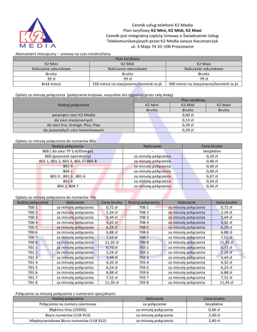 Cennik usług telefonii K2 Media Plan taryfowy K2 Mini, K2 Midi, K2
