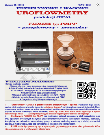 Wydanie 04.11.2016. PKWiU 32/50 PRZEPŁYWOWE I WAGOWE UROFLOWMETRY produkcji JEPAL FLOMEX typ P24PP – przepływowy - przenośny WYZNACZANE PARAMETRY Dotyczy obu typów aparatów # Krzywa mikcyjna – zapis formatowany, bez konieczności skalowania # Objętość mikcji (całkowita) # Przepływ maksymalny # Przepływ średni # Czas mikcji # Czas wypływu # Czas do maksymalnego przepływu # Przyspieszenie # Czas opóźnienia mikcji # Wskaźnik uroflowmetryczny wg nom. Siroky (dot. P24P , P24W) # Wartości normalne Qmax , Qavg wg nom. Liverpool (dot. P24W) # Zaleganie po mikcji (do wpisu odręcznego) Uroflowmetry FLOMEX z przetwornikiem przepływowym - ogólnie. Przetwornik tego aparatu zawiera silnik pomiarowy z turbinką (zwany też „wirującym dyskiem”), na którą spływa mocz w trakcie mikcji. Mocz, opuszczający turbinkę, spływa do wylotu przetwornika i jest kierowany do miejsca wg życzenia Użytkownika, na przykład do wiadra ściekowego, muszli klozetowej, bidetu, itp. ścieku. Nasz aparat można wyposażyć w system spłukiwania po mikcji. Aparat przepływowy jest znacznie wygodniejszy w obsłudze od wagowego Uroflowmetr FLOMEX typ P24PP ma minimalny gabaryt, zapewne w skali wszystkich tego typu aparatów, dostępnych na rynku, jest elementarnie prosty w transporcie, montażu, obsłudze, kompletny do całkowicie samodzielnej pracy, z własną drukarką termiczną o dużej szerokości papieru, z możliwością , lecz bez konieczności współpracy z komputerem. P24PP może być pomocny np. w sytuacjach, gdy urolog pracuje w kilku gabinetach, które nie są wyposażone w uroflowmetry stacjonarne CECHY APARATU P24PP Aparat przenośny # Zwłaszcza do rutynowej uroflowmetrii # produkcja od 1995 r. # „wyrób polski” Przetwornik pom. przepływowy turbinkowy typu „wirujący dysk” – Qmax 50 ml/sek , dokł. 3% Przetwornik pomiarowy odporny na artefakty Drukarka własna - drukarka trmiczna prod. pol/jap , papier szer. 112 mm Możliwość współpracy z komputerem - poprzez program współpracy Obsługa z klawiatury aparatu i/lub z komputera Połączenie zespołu sterującego z przetwornikiem pomiarowym – przewód - długośc do 30 m Łącza zespołu sterującego z komputerem : USB , Bluetooth Możliwosć sprawdzenia i ew. wykonania kalibracji - we własnym zakresie Odprowadzenie moczu: wiadro ściekowe zdjęcie Krzesło mikcyjne zdjęcie ; w opcji PREZENTACJA BADANIA Wydruk krzywej mikcyjnej i jej parametrów - na drukarce aparatu i/lub komputera Autoformatowanie krzywej mikcyjnej – bez ustawiania skali pomiarowej Wydruk numeru, daty, czasu badania Wydruk Logo badającego Pliki, wydruki w PDF – możliwość przesyłu danych Wydruki z danymi pacjenta - zarejestrowanego w kartotece pacjenta Wydruki zbiorcze z kartoteki - do 5-ciu badań danego pacjenta Wydruki komentarzy - wpis z komputera lub odręczny Wydruk wartości wskaźnika uroflowmetrycznego wg nom. Siroky, interpretacja Aparat gotowy do pracy Krzesło mikcyjne typ W-KMOS W stanie złożonym aparat jest wiadrem 10-litrowym z uchwytem do przenoszenia FLOMEX - P24PP WYPOSAŻENIE I KOMPLETACJA „STANDARD” – wszystkie zasadnicze podzespoły i możliwości aparatu, w typowym zestawie „OPCJA” – inne możliwości, wg nastaw aparatu, nie korzystania, zrezygnowania lub dokupienia wyposażenia „CENY BRUTTO * ” – prosić o aktualną ofertę cenową Podzespoły, wyposażenie , możliwości przetwornik pomiarowy przepływowy turbinkowy typu „wirujący dysk” zespół sterujący Zasilacz sieciowy wtyczkowy drukarka własna Kafka SQ prod. pol/jap szer. papieru 112 mm odprowadzenie moczu: wiadro ściekowe typ W-SKP program współpracy z komputerem typ W-24.2 Instrukcja Obsługi. Płytka CD INFO. Paszport Techniczny Butelka kalibracyjna, do sprawdzania kalibracji Krzesła, taborety mikcyjne , typ KMOS (inne typy – patrz oferta Flomex – ogólna) papier termiczny 1 opak. 5 rolek typ W-SEIKO płyn dezynfekcyjny 1 opak. 1 litr typ W-VC410 Możliwa współpraca z komputerem Użytkownika Połączenie z komputerem kablowe - USB Połączenie z komputerem bezprzewodowe - Bluetooth dostawa kurierem w opakowaniu specjalnym dostawa, uruchomienie, szkolenie obsługi - przez Jepal STANDARD tak tak tak tak tak tak tak tak nie 1 opak. tak 1 opak. tak tak tak nie tak OPCJA nie tak nie tak tak FLOMEX - P24PP OPIS APARATU FLOMEX P24PP jest kompletowany wg ww. tablicy wyposażenia i kompletacji - kol. „STANDARD” ZESPÓŁ STERUJĄCY aparatu zawiera: zasilacz sieciowy, sterownik z klawiaturą oraz drukarkę termiczną. Badanie jest inicjowane przyciskiem START. Po zakończeniu mikcji, po 5 lub 10 sek (wg ustawienia) następuje wydruk wyniku badania i aparat jest gotowy do następnego pomiaru. Przycisk STOP przerywa pracę aparatu. Przycisk COPY inicjuje wykonanie kopii ostatniego wyniku badania. Przycisk FLOW, w opcji ze spłukiwaniem, umożliwia spłukiwanie przetwornika w każdym czasie. Obsługę aparatu ułatwia sygnalizator akustyczny. PRZETWORNIK POMIAROWY PRZEPŁYWOWY, tzw. turbinkowy (typu „wirujący dysk”), w standardzie ICS – opracowanie Jepal. Cechują go małe gabaryty, duża dokładność pomiaru, uniwersalność zastosowania i przede wszystkim bezobsługowość, np. brak potrzeby każdorazowego opróżniania naczyń po pomiarze, jak np. w przetwornikach wagowych. Pomiar podstawowy - przepływu, w zakresie pomiarowym Qmax = 50ml/s. Pozostałe parametry – wyznaczane cyfrowo z krzywej mikcyjnej. Lejek przetwornika ma sitko, zabezpieczające przed przedostawaniem się zanieczyszczeń do jego wnętrza, w tym, w urologii dziecięcej np. kału PRZETWORNIK MAŁO WRAŻLIWY NA ARTEFAKTY (niezamierzone wyzwalanie działania) DRUKARKA aparatu: Kafka SQ prod. MEFA (Polska), z mechanizmem drukującym prod. SEIKO (Japonia), termiczna, o dużej szerokości papieru (112 mm) Statyw kompakt typ W-SKP stanowi całość z wiadrem ściekowym, o pojemności 10 litrów. Zajmuje bardzo mało miejsca. Można go postawić w dow