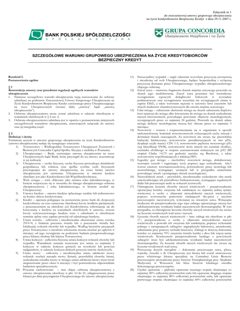 Załącznik nr 1 do zrzeszeniowej umowy grupowego ubezpieczenia na Ŝycie kredytobiorców Bezpieczny Kredyt z dnia 29.11.2007 r. SZCZEGÓŁOWE WARUNKI GRUPOWEGO UBEZPIECZENIA NA śYCIE KREDYTOBIORCÓW BEZPIECZNY KREDYT Rozdział I. Postanowienia ogólne §1 Konstrukcja umowy oraz przedmiot regulacji ogólnych warunków ubezpieczenia 1. Niniejsze szczegółowe warunki ubezpieczenia mają zastosowanie do ochrony udzielanej na podstawie Zrzeszeniowej Umowy Grupowego Ubezpieczenia na śycie Kredytobiorców Bezpieczny Kredyt zawieranego przez Ubezpieczającego na rzecz Ubezpieczonych (zwanej dalej „umową” bądź „umową ubezpieczenia”). 2. Ochrona ubezpieczeniowa moŜe zostać udzielona w zakresie określonym w wariantach określonych w § 4 ust. 2. 3. Ochrona ubezpieczeniowa udzielana jest w oparciu o postanowienia niniejszych szczegółowych warunków ubezpieczenia, stanowiących załącznik do umowy oraz jej integralną część. §2 Definicje i skróty Terminom uŜytym w umowie grupowego ubezpieczenia na Ŝycie Kredytobiorców (umowa ubezpieczenia) nadaje się następujące znaczenia: 1) Towarzystwo – Wielkopolskie Towarzystwo Ubezpieczeń śyciowych i Rentowych Concordia Capital Spółka Akcyjna z siedzibą w Poznaniu; 2) Ubezpieczający – Bank, zawierający umowę ubezpieczenia na rzecz Ubezpieczonych bądź Bank, który przystąpił do tej umowy uczestnicząc w jej realizacji; 3) Ubezpieczony – osoba fizyczna, osoba fizyczna prowadząca działalność gospodarczą lub rolniczą oraz spółka cywilna osób fizycznych przystępująca do umowy ubezpieczenia, na rzecz której umowa ubezpieczenia jest zawierana. Ubezpieczony w umowie kredytu określany jest jako Kredytobiorca lub Współkredytobiorca; 4) Wiek wstępu – wiek obliczany jako róŜnica roku kalendarzowego, w którym rozpoczyna się w stosunku do danego ubezpieczonego ochrona ubezpieczeniowa i roku kalendarzowego, w którym urodził się Ubezpieczony; 5) Umowa kredytu – umowa kredytu spłacanego ratalnie lub jednorazowo na koniec okresu kredytowania; 6) Kredyt – operacja polegająca na postawieniu przez bank do dyspozycji kredytobiorcy na czas oznaczony określonej kwoty środków pienięŜnych, z przeznaczeniem na określony cel. Kredytobiorca zobowiązuje się do korzystania z kredytu na warunkach określonych w umowie, zwrotu kwoty wykorzystywanego kredytu wraz z odsetkami w określonym terminie spłaty oraz zapłaty prowizji od udzielonego kredytu; 7) Utrata wzroku - całkowita i nieodwracalna obustronna utrata wzroku (VO=0, z brakiem poczucia światła lub z poczuciem światła bez lokalizacji) wskutek choroby lub wypadku. Według kryteriów przyjętych przez Towarzystwo o trwałości schorzenia moŜna orzekać po upływie 6 miesięcy od jego wystąpienia na podstawie badania przeprowadzonego przez lekarza okulistę lub lekarza Towarzystwa; 8) Utrata kończyn - całkowita fizyczna utrata kończyn wskutek choroby lub wypadku. Warunkiem uznania roszczenia jest utrata co najmniej 2 kończyn: w zakresie kończyn górnych na wysokości lub powyŜej nadgarstków, w zakresie kończyn dolnych powyŜej stawów skokowych; 9) Utrata mowy - całkowita i nieodwracalna utrata zdolności mowy wskutek: resekcji narządu mowy (krtani), przewlekłej choroby krtani, uszkodzenia ośrodka mowy w mózgu; utrata zdolności mowy musi trwać nieprzerwanie przez okres 6 miesięcy i być potwierdzona odpowiednim badaniem specjalistycznym; 10) PowaŜne zachorowanie – stan objęty ochroną ubezpieczeniową z umowy ubezpieczenia, określony w pkt. 12 do 21, zdiagnozowany przez lekarza po dniu przystąpienia Ubezpieczonego do umowy ubezpieczenia; 11) Nieszczęśliwy wypadek – nagłe zdarzenie wywołane przyczyną zewnętrzną i niezaleŜną od woli Ubezpieczonego, będące bezpośrednią i wyłączną przyczyną doznania przez Ubezpieczonego wypadku ubezpieczeniowego objętego ochroną; 12) Zawał serca – martwica fragmentu tkanek mięśnia sercowego powstała na skutek jego niedokrwienia. Zawał serca powinien być stwierdzony wystąpieniem typowych dolegliwości bólowych w wywiadzie podmiotowym oraz wystąpieniem wcześniej nie występujących zmian w zapisie EKG, a takŜe wzrostem stęŜenia w surowicy krwi enzymów lub innych markerów charakterystycznych dla zawału mięśnia sercowego; 13) Udar mózgu – zaburzenie ukrwienia mózgu na skutek zaburzenia dopływu krwi tętniczej do mózgu albo krwawienia do mózgu na skutek uszkodzenia naczyń krwionośnych, powodujące powstanie objawów neurologicznych, występujących przez co najmniej 24 godziny. Powstałe na skutek udaru mózgu deficyty neurologiczne muszą być obecne przez co najmniej 3 miesiące; 14) Nowotwór – rozrost i rozprzestrzenianie się w organizmie w sposób niekontrolowany komórek nowotworowych wykazujących cechy inwazji i destrukcji tkanek otaczających. Za nowotwór nie uwaŜa się: przewlekłej białaczki limfatycznej, nowotworów przedinwazyjnych in situ pTis, dysplazji szyjki macicy CIN 1-3, nowotworów pęcherza moczowego pTa (wg klasyfikacji TNM), nowotworów skóry innych niŜ czerniak złośliwy, czerniaka złośliwego w stopniu zaawansowania mniejszym niŜ pT2 (III stopień Clarka >0,75 cm grubości nacieku wg Breslowa), a takŜe nowotworów współistniejących z infekcją HIV; 15) Łagodny guz mózgu – niezłośliwy nowotwór mózgu, zlokalizowany wewnątrz czaszki i zagraŜający Ŝyciu poprzez jego uszkodzenie lub/i wzrost ciasnoty wewnątrzczaszkowej, potwierdzony przez neurologa lub neurochirurga, wymagający usunięcia lub w przypadku zaniechania powodujący trwały i postępujący ubytek neurologiczny; 16) Niewydolność nerek – przewlekłe, nieodwracalne uszkodzenie obu nerek uniemoŜliwiające ich prawidłowe funkcjonowanie, wymagające regularnych dializ lub przeszczepu nerki ze wskazań Ŝyciowych; 17) Chirurgiczne leczenie choroby naczyń wieńcowych – przeprowadzenie operacyjnej korekty zwęŜenia lub zamknięcia co naj