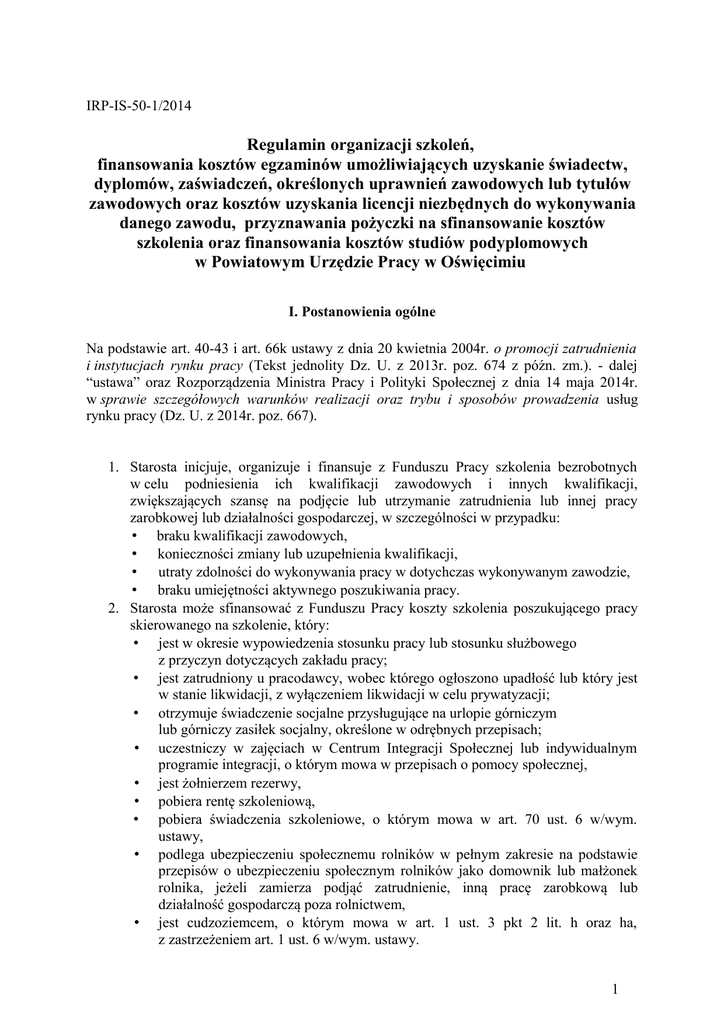 IRP-IS-50-1/2014 Regulamin organizacji szkoleń, finansowania kosztów egzaminów umożliwiających uzyskanie świadectw, dyplomów, zaświadczeń, określonych uprawnień zawodowych lub tytułów zawodowych oraz kosztów uzyskania licencji niezbędnych do wykonywania danego zawodu, przyznawania pożyczki na sfinansowanie kosztów szkolenia oraz finansowania kosztów studiów podyplomowych w Powiatowym Urzędzie Pracy w Oświęcimiu I. Postanowienia ogólne Na podstawie art. 40-43 i art. 66k ustawy z dnia 20 kwietnia 2004r. o promocji zatrudnienia i instytucjach rynku pracy (Tekst jednolity Dz. U. z 2013r. poz. 674 z późn. zm.). - dalej “ustawa” oraz Rozporządzenia Ministra Pracy i Polityki Społecznej z dnia 14 maja 2014r. w sprawie szczegółowych warunków realizacji oraz trybu i sposobów prowadzenia usług rynku pracy (Dz. U. z 2014r. poz. 667). 1. Starosta inicjuje, organizuje i finansuje z Funduszu Pracy szkolenia bezrobotnych w celu podniesienia ich kwalifikacji zawodowych i innych kwalifikacji, zwiększających szansę na podjęcie lub utrzymanie zatrudnienia lub innej pracy zarobkowej lub działalności gospodarczej, w szczególności w przypadku: • braku kwalifikacji zawodowych, • konieczności zmiany lub uzupełnienia kwalifikacji, • utraty zdolności do wykonywania pracy w dotychczas wykonywanym zawodzie, • braku umiejętności aktywnego poszukiwania pracy. 2. Starosta może sfinansować z Funduszu Pracy koszty szkolenia poszukującego pracy skierowanego na szkolenie, który: • jest w okresie wypowiedzenia stosunku pracy lub stosunku służbowego z przyczyn dotyczących zakładu pracy; • jest zatrudniony u pracodawcy, wobec którego ogłoszono upadłość lub który jest w stanie likwidacji, z wyłączeniem likwidacji w celu prywatyzacji; • otrzymuje świadczenie socjalne przysługujące na urlopie górniczym lub górniczy zasiłek socjalny, określone w odrębnych przepisach; • uczestniczy w zajęciach w Centrum Integracji Społecznej lub indywidualnym programie integracji, o którym mowa w przepisach o pomocy społecznej, • jest żołnierzem rezerwy, • pobiera rentę szkoleniową, • pobiera świadczenia szkoleniowe, o którym mowa w art. 70 ust. 6 w/wym. ustawy, • podlega ubezpieczeniu społecznemu rolników w pełnym zakresie na podstawie przepisów o ubezpieczeniu społecznym rolników jako domownik lub małżonek rolnika, jeżeli zamierza podjąć zatrudnienie, inną pracę zarobkową lub działalność gospodarczą poza rolnictwem, • jest cudzoziemcem, o którym mowa w art. 1 ust. 3 pkt 2 lit. h oraz ha, z zastrzeżeniem art. 1 ust. 6 w/wym. ustawy. 1 2a. Do pracowników oraz osób wykonujących inną pracę zarobkową lub działalność gospodarczą w wieku 45 lat i powyżej, zainteresowanych pomocą w rozwoju zawodowym, po zarejestrowaniu się w urzędzie pracy, przepisy art. 40, art. 41 ust. 47, art. 42 i art. 42a ust. 1-4 stosuje się odpowiednio. 3. Skierowanie na szkolenie, refundacja kosztów egzaminów i licencji, finansowanie kosztów studiów podyplomowych oraz udzielenie pożyczki na sfinansowanie kosztów szkolenia następuje w ramach posiadanych na ten cel środków Funduszu Pracy, Europejskiego Funduszu Społecznego lub ze środków programów Unii Europejskiej. 4. Koszty szkoleń finansowanych z Funduszu Pracy nie mogą przekroczyć dziesięciokrotności minimalnego wynagrodzenia za pracę na jedną osobę w okresie kolejnych 3 lat. 5. Powiatowy urząd pracy realizuje organizację szkoleń, udzielając osobom uprawnionym informacji i - zgodnie z indywidualnymi planami działania – sporządzonymi przez doradcę klienta – pomocy w nabywaniu, podwyższeniu lub zmianie kwalifikacji, poprzez: • szkolenia zlecane lub powierzane, zgodnie z art. 40 ustawy, instytucjom szkoleniowym dla grup osób uprawnionych kierowanych przez urząd pracy; • szkolenia z zakresu umiejętności poszukiwania pracy realizowane w powiatowym urzędzie pracy lub zlecane zgodnie z art. 24 ustawy; • szkolenia wskazane przez osoby uprawnione zgodnie z art. 40 ust. 3 ustawy; • przyznawanie i realizację bonów szkoleniowych, o których mowa w art. 66k ustawy; • finansowanie kosztów egzaminów umożliwiających uzyskanie świadectw, dyplomów, zaświadczeń, określonych uprawnień zawodowych lub tytułów zawodowych oraz kosztów uzyskania licencji niezbędnych do wykonywania danego zawodu; • udzielenie pożyczki na finansowanie kosztów szkolenia; • finansowanie kosztów studiów podyplomowych. 6. Szkolenia mogą być organizowane w trybie indywidualnym oraz grupowym, po złożeniu wniosku lub zgłoszenia zawierającego imię nazwisko, numer PESEL osoby wnioskującej a w przypadku cudzoziemca numer dokumentu stwierdzającego tożsamość i adres zamieszkania tej osoby oraz uzasadnienia jego celowości. 7. Szkolenia mogą być organizowane na podstawie umów trójstronnych. 8. W przypadku ograniczonej ilości środków finansowych w pierwszej kolejności realizowane będą umowy trójstronne, a następnie szkolenia dla osób posiadających uprawdopodobnienie zatrudnienia lub uprawdopodobnienie rozpoczęcia własnej działalności gospodarczej. 9. Szkolenie odbywa się w formie kursu, realizowanego według planu nauczania obejmującego przeciętnie nie mniej niż 25 godzin zegarowych w tygodniu, chyba że przepisy odrębne przewidują niższy wymiar szkolenia. Szkolenie może trwać do 6 miesięcy, a w sytuacjach uzasadnionych programem szkolenia w danym zawodzie nie dłużej niż 12 miesięcy; w przypadku osób bez kwalifikacji zawodowych szkolenie może trwać do 12 miesięcy, a w sytuacjach uzasadnionych programem szkolenia w danym zawodzie nie dłużej niż 24 miesiące. 10. Nie ma możliwości sfinansowania kosztów szkolenia, jeżeli osoba rozpoczęła szkolenie bez otrzymania skierowania z urzędu. 11. Organizacja szkolenia odbywa się na podstawie umowy lub powierzenia, zawartych w formie pisemnej pomiędzy Urzędem Pracy a instytu