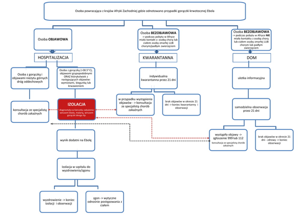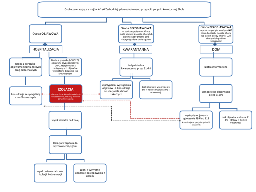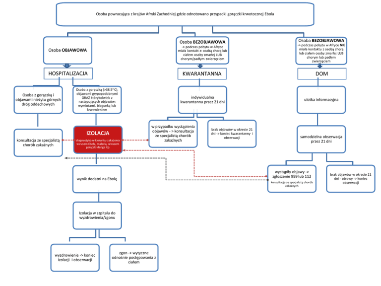 Osoba powracająca z krajów Afryki Zachodniej gdzie odnotowano przypadki gorączki krwotocznej Ebola Osoba BEZOBJAWOWA Osoba OBJAWOWA HOSPITALIZACJA Osoba z gorączką i objawami nieżytu górnych dróg oddechowych Osoba z gorączką (>38.5o C), objawami grypopodobnymi ORAZ którykolwiek z następujących objawów: wymiotami, biegunką lub krwawieniem IZOLACJA konsultacja ze specjalistą chorób zakaźnych diagnostyka w kierunku zakażenia wirusem Ebola, malarią, wirusem gorączki denga itp. Izolacja w szpitalu do wyzdrowienia/zgonu wyzdrowienie -> koniec izolacji i obserwacji -> podczas pobytu w Afryce NIE miała kontaktu z osobą chorą lub ciałem osoby zmarłej LUB chorym lub padłym zwierzęciem KWARANTANNA DOM indywidualna kwarantanna przez 21 dni ulotka informacyjna w przypadku wystąpienia objawów - > konsultacja ze specjalistą chorób zakaźnych wynik dodatni na Ebolę zgon -> wytyczne odnośnie postępowania z ciałem Osoba BEZOBJAWOWA -> podczas pobytu w Afryce miała kontakt z: osobą chorą lub ciałem osoby zmarłej LUB chorym/padłym zwierzęciem brak objawów w okresie 21 dni -> koniec kwarantanny i obserwacji samodzielna obserwacja przez 21 dni wystąpiły objawy -> zgłoszenie 999 lub 112 konsultacja ze specjalistą chorób zakaźnych brak objawów w okresie 21 dni - zdrowy -> koniec obserwacji