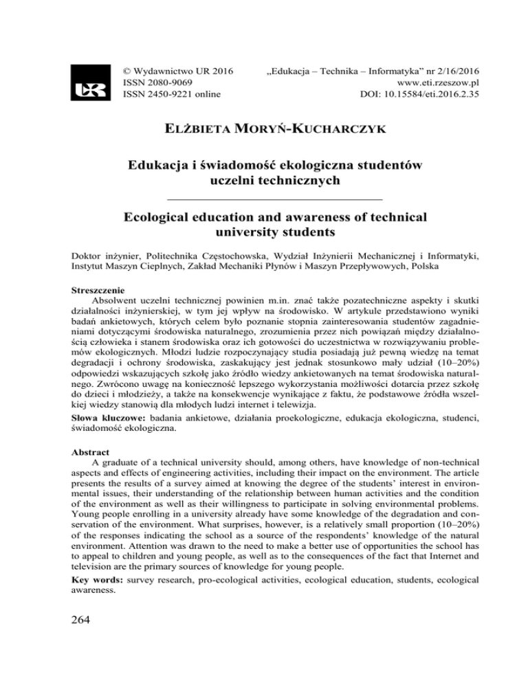 © Wydawnictwo UR 2016 ISSN 2080-9069 ISSN 2450-9221 online „Edukacja – Technika – Informatyka” nr 2/16/2016 www.eti.rzeszow.pl DOI: 10.15584/eti.2016.2.35 ELŻBIETA MORYŃ-KUCHARCZYK Edukacja i świadomość ekologiczna studentów uczelni technicznych Ecological education and awareness of technical university students Doktor inżynier, Politechnika Częstochowska, Wydział Inżynierii Mechanicznej i Informatyki, Instytut Maszyn Cieplnych, Zakład Mechaniki Płynów i Maszyn Przepływowych, Polska Streszczenie Absolwent uczelni technicznej powinien m.in. znać także pozatechniczne aspekty i skutki działalności inżynierskiej, w tym jej wpływ na środowisko. W artykule przedstawiono wyniki badań ankietowych, których celem było poznanie stopnia zainteresowania studentów zagadnieniami dotyczącymi środowiska naturalnego, zrozumienia przez nich powiązań między działalnością człowieka i stanem środowiska oraz ich gotowości do uczestnictwa w rozwiązywaniu problemów ekologicznych. Młodzi ludzie rozpoczynający studia posiadają już pewną wiedzę na temat degradacji i ochrony środowiska, zaskakujący jest jednak stosunkowo mały udział (10–20%) odpowiedzi wskazujących szkołę jako źródło wiedzy ankietowanych na temat środowiska naturalnego. Zwrócono uwagę na konieczność lepszego wykorzystania możliwości dotarcia przez szkołę do dzieci i młodzieży, a także na konsekwencje wynikające z faktu, że podstawowe źródła wszelkiej wiedzy stanowią dla młodych ludzi internet i telewizja. Słowa kluczowe: badania ankietowe, działania proekologiczne, edukacja ekologiczna, studenci, świadomość ekologiczna. Abstract A graduate of a technical university should, among others, have knowledge of non-technical aspects and effects of engineering activities, including their impact on the environment. The article presents the results of a survey aimed at knowing the degree of the students’ interest in environmental issues, their understanding of the relationship between human activities and the condition of the environment as well as their willingness to participate in solving environmental problems. Young people enrolling in a university already have some knowledge of the degradation and conservation of the environment. What surprises, however, is a relatively small proportion (10–20%) of the responses indicating the school as a source of the respondents’ knowledge of the natural environment. Attention was drawn to the need to make a better use of opportunities the school has to appeal to children and young people, as well as to the consequences of the fact that Internet and television are the primary sources of knowledge for young people. Key words: survey research, pro-ecological activities, ecological education, students, ecological awareness. 264 Wstęp Edukacja ekologiczna społeczeństwa, za którą formalnie jest odpowiedzialne Ministerstwo Środowiska (MŚ), to zadanie przede wszystkim dla szkół od podstawowej do średniej, ale także dla uczelni wyższych. Dla zrównoważonego rozwoju kraju niezbędne są bowiem nie tylko inwestycje w nowoczesne, proekologiczne technologie i racjonalna gospodarka zasobami naturalnymi, ale także wysoka świadomość ekologiczna społeczeństwa rozumiana jako gotowość do angażowania się w rozwiązywanie problemów dotyczących środowiska naturalnego. Młodzi ludzie rozpoczynający studia posiadają już pewną wiedzę na temat degradacji i ochrony środowiska naturalnego. Znajomość jej zakresu umożliwia ewentualne korygowanie i uzupełnianie programów odpowiednich zajęć. Między innymi temu celowi służyły badania ankietowe przeprowadzone przez autorkę wśród studentów Wydziału Inżynierii Mechanicznej i Informatyki Politechniki Częstochowskiej (WIMiI PCz), których wybrane wyniki przedstawiono w niniejszym artykule. Stan świadomości ekologicznej studentów budzi zainteresowanie głównie wykładowców Uczelni i Wydziałów: Nauk Rolniczych i o Zdrowiu [Poniedziałek, Rzymski 2010; Ziernicka-Wojtaszek 2011; Bednarek-Gejo, Mianowany, Skoczylas, Głowacka 2012]. W uczelniach technicznych z reguły nie prowadzi się tego typu badań, co wynika niewątpliwie z niedoceniania tematyki dotyczącej ochrony środowiska przez studentów i kadrę kierunków niezwiązanych bezpośrednio z tymi zagadnieniami. Tymczasem zgodnie z załącznikiem nr 5 do rozporządzenia Ministra Nauki i Szkolnictwa Wyższego z dnia 2 listopada 2011 r. (Dz.U. nr 253 poz. 1520) jeden z efektów kształcenia w zakresie nauk technicznych w ramach kompetencji społecznych (T1A_K02, T2A_K02) mówi, że absolwent „ma świadomość ważności i rozumie pozatechniczne aspekty i skutki działalności inżynierskiej, w tym jej wpływu na środowisko, i związanej z tym odpowiedzialności za podejmowane decyzje”. Dobrze się więc stało, że w programach większości kierunków prowadzonych na WIMiI PCz znalazły się przedmioty dotyczące ekologii i ochrony środowiska. Badania świadomości i zachowań ekologicznych studentów WIMiI PCz Przeprowadzone wśród studentów własne badania ankietowe miały na celu przede wszystkim poznanie podejścia studentów do zagadnień związanych z ochroną środowiska, ich zachowań ekologicznych i odbioru działań prowadzonych przez różne instytucje na rzecz poprawy stanu środowiska. Materiał do analizy stanowiły dane uzyskane od studentów WIMiI PCz reprezentujących różne kierunki (energetyka, inżynieria biomedyczna, mechanika i budowa maszyn, mechatronika), różne rodzaje studiów (stacjonarne i niestacjonarne), różne stopnie nauczania (studia I stopnia – inżynierskie i III stopnia – doktoranckie) oraz różne lata studiów (od II do IV). Ankietowanie studentów przeprowadzono w semestrze zimowym roku akademickiego 2013/2014 (110 ankiet) i 2014/2015 (88 ankiet). 265 Z przeprowadzonych na zlecenie MŚ badań wynika, że „na wiele spraw dotyczących środowiska natur