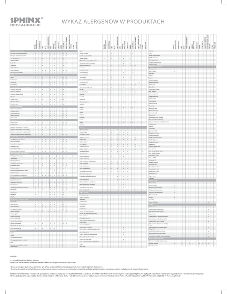 0 0 + 0 Woda gazowana So Pita z serem + + + + Mieszanka warzyw gotowanych + 0 Party Mix + + Mieszanka zielonych warzyw + 0 Jalapeños + + + + Warzywa grillowane 0 0 Krążki cebulowe + + + + Sos ostry + Sos czosnkowy Rösti z łososiem 0 Chrupiący Camembert + + + + 0 + 0 + 0 + MIĘCZAKI MIĘCZAKI 0 0 + 0 0 + + + + + + 0 0 0 + 0 0 Sos maślany + 0 + 0 Pomidorowa + 0 0 + + 0 0 Sos z zielonego pieprzu + 0 + 0 Cebulowa + 0 0 + + 0 0 Borowikowa + 0 0 + + 0 0 + POZYCJE KULTOWE - bez dodatków Rockstar Energy Drink 0 + + 0 + 0 Sos z czerwonego wina + 0 + + 0 + + Sos BBQ + + 0 + Sos chimichurri 0 + + 0 + Ketchup 0 0 + 0 0 + Ser żółty + 0 + + 0 + Bułka pita + + + Masło czosnkowe 0 0 0 + 0 0 + 0 0 + 0 0 + 0 0 0 Shoarma delikatna + Shoarma na dwa smaki + SPHINX SPHINX Party Shoarma de luxe + Shoarma ostra 0 0 + + 0 0 Boczek Stek po amerykańsku 0 0 0 0 0 0 0 Stek australijski 0 0 0 0 0 0 0 Porterhouse stek 0 0 0 0 0 0 0 Stek urugwajski 0 0 0 0 0 0 0 Pepper stek 0 0 0 0 0 0 0 + + 0 0 Long Island Mango Lemonade virgin Cape Code virgin + Mojito virgin Wściekły pies 0 Alternatywy 4 Kamikaze Blue Kamikaze Green Kamikaze Red Wyborowa Pieczarki Wyborowa Citrus Squeeze 0 Grecka uczta + 0 0 + 0 0 0 Salami Sałatka Cezar + + + + 0 + 0 Pomidor Bajeczna misa warzyw z łososiem + 0 0 + 0 DESERY Bajeczna misa warzyw z kurczakiem + 0 0 + 0 Wiśniowy sekret + + Bajeczna misa warzyw wegetariańska + 0 0 + o Creme Brûlée 0 + Sałata z boczkiem i serem pleśniowym + 0 + + 0 Szarlotka z lodami + + Jagodowy sekret + 0 + 0 0 0 Wyborowa Mango Splash 0 0 0 + Wyborowa Watermelon & Mint Fresh Helsinki Pure Absolut Żubrówka + + 0 0 + 0 0 0 + 0 + 0 + + 0 0 Soplica Orzech Laskowy 0 Soplica Pigwowa 0 0 Soplica Malinowa 0 0 + 0 0 0 + 0 Cherry lady + + 0 + + + Łosoś na szpinaku 0 0 + 0 + 0 + 0 Wiśniowy król 0 0 0 0 + 0 Sandacz na warzywach 0 0 + 0 0 0 + 0 Żar tropików + + o + + 0 0 Grillowany filet + Sułtańska gruszka + + o + + + 0 Kurczę z kieszonką + 0 0 Łosoś na sposób królewski 0 0 0 + 0 0 0 Puchar włoski + + 0 + + + 0 0 0 + 0 Sernik jagodowy + + 0 + + 0 Tarta ptysiowa + + 0 + + 0 0 + Żubrówka Biała Żołądkowa Gorzka Pstrąg grillowany z ziołami FUZJA SMAKÓW - bez dodatków Soplica Wiśniowa Ballantine’s + Johnnie Walker Red Jack Daniel’s 0 Jack Daniel’s Single Barrel Jack Daniel’s Honey Glenfiddich 12YO Delicja z piersi kurczaka 0 0 + + + 0 Stek sułtana + 0 0 + 0 0 Chrupiący kurczak + Lody wiśniowo - czekoladowe o o o + o Wątróbka z pieczarkami + 0 0 + 0 0 0 Lody waniliowe 0 0 0 + 0 Karkówka z grilla + 0 + 0 + + 0 Lody czekoladowe 0 0 0 + 0 Filet z kurczaka + Lody Maple Walnut 0 0 0 + + Filet z kurczaka zapiekany serem + Tequila Sierra Gold Sernik z Brzoskwiniami + + 0 0 + 0 Baileys Irish Cream Burger z angusa + + 0 Dorsz w płatkach migdałowych 0 + + + Martini Bianco + Czekolada na gorąco Czekolada na gorąco z gruszką 0 + + + Jägermeister Spaghetti carbonara + 0 Mus czekoladowy 0 + + + Brokułowa inspiracja + 0 Mus czekoladowo-gruszkowy + + Penne spinaci + Tagliatelle z polędwicą i grzybami 0 Malinowa pokusa + + + + + 0 + + + + 0 + 0 0 0 0 + 0 0 0 + 0 + + Shot 4You Papryka CZAS NA FIT - bez dodatków + Milk Melody 0 Oliwki Szynka + Cape Code Cebula ZAPRASZAMY NA SAŁATY 0 0 Green Line Ananas STEKI - bez dodatków + 0 Watermelon Mint 0 + 0 0 + Sex on the Beach + 0 + Misch Masch New York Sos słodkie chili Sos tzatziki Tropicanisch Mojito 0 0 DRINKI I ALKOHOLE Sphinx + Shoarma klasyczna Lipton Ice Tea 0 + Rosół ZUPY Sos holenderski Schweppes Tonic + Sos koktajlowy + 7-UP 0 Metaxa ***** Sorbet malinowy + Hennessy VS Bacardi Superior Seagram’s Gin Tequila Sierra Silver + 0 0 + + 0 + Tyskie Gronie + 0 + + + 0 0 Mus czekoladowo-tropikalny + + Lech Premium + + 0 + + 0 0 0 Czekoladka “20 lat Sphinx” + 0 Książęce czerwony lager + Margherita + 0 0 + 0 0 0 Brownie z gruszką + + Książęce złote pszeniczne + Capricciosa + + + 0 0 SOKI I NAPOJE Książęce ciemne łagodne + Pepperoni + 0 + 0 + Pomarańczowy Pilsner Urquell + Wiejska + + + 0 + Czarna porzeczka Grolsch + Jabłkowy Lech free + MAKARONY I PIZZA + 0 + 0 KIDS MENU / STUDENT MENU Shoaremka + Pizza Bambino + 0 Łosoś smakosza 0 0 Chrupiące kurczaczki + 0 Słodka pychotka + + + 0 0 0 0 + Grejpfrutowy Green Mill Cider + + 0 0 Pomidorowy WINA 0 + 0 0 0 Bananowy Olaria Branco + + 0 0 0 Sok do piwa Las Montañas Chardonnay + + + 0 Soczek dla dzieci jabłkowy Kressmann Grande Reserve + Olaria Tinto + Las Montañas Cabernet Sauvignon + Chianti Classico Villa Campobello + Prosecco Villa Delle Camelie + Viña San Juan Chardonnay - Verdejo -Viura + Gewürztraminer Domaine Sainte Marguerite + Castillo De Albai Crianza Rioja + Primitivo Marchesi Del Salento + Mossiere Vino Nobile Di Montepulciano + + Kawa espresso Gotowane brokuły Podwójne espresso 0 Kawa espresso bezkofeinowa Marchewka z jabłkiem 0 0 0 + 0 0 0 Marchewka do chrupania + + 0 + DODATKI Kawa czarna Kawa bezkofeinowa Kawa czarna z mlekiem + Kawa czarna z mlekiem bezkofeinowa + Kawa Cappuccino Frytki Kawa Cappuccino bezkofeinowe Talarki + + Herbata (wszystkie smaki) Chrupiące półksiężyce Chrupiące półksiężyce z ziołami Rösti Kawa Latte macchiato + Kawa Latte macchiato bezkofeinowe + Pepsi 0 0 + + Cząstki pomidora Ziemniak w mundurku z masłem czosnkowym 0 + Soczek dla dzieci pomarańczowy Racuchy słodziuchy + PIWO I CYDR + Świeży ogórek Ogórek w śmietanie + Campari 0 + 0 0 0 Pepsi light ROZGRZEWAJĄCY DUET Brownie z gruszką i bitą śmietaną + + Herbata zimowa 0 0 Orzechowe latte 0 + + 0 0 + 0 0 0 0 + Legenda: + = produkt zawiera wskazany alergen; 0 = produkt może zawierać wskazany alergen (obecności alergenu nie można wykluczyć) 1 2 Zboża zawierające gluten, tj.: pszenica (w tym orkisz i pszenica khorasan), żyto, jęczmień, owies lub ich odmiany hybrydowe. Orzechy, tj: migdały, orzechy laskowe, orzechy włoskie, orzechy nerkowca, orzeszki pekan, orzechy brazylijskie, pistacje/orzechy pistacjowe, orzechy makadamia lub orzechy
