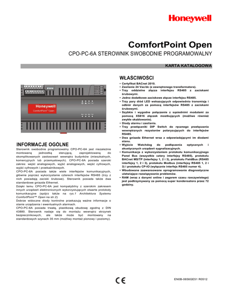 Honeywell ComfortPoint Open CPO-PC-6A STEROWNIK SWOBODNIE PROGRAMOWALNY KARTA KATALOGOWA WŁAŚCIWOŚCI INFORMACJE OGÓLNE Sterownik swobodnie programowalny CPO-PC-6A jest niezależnie montowaną jednostką sterującą, zaprojektowaną do skomplikowanych zastosowań wewnątrz budynków (mieszkalnych, komercyjnych lub przemysłowych). CPO-PC-6A posiada szeroki zakres: wejść analogowych, wyjść analogowych, wejść cyfrowych, wyjść cyfrowych i przekaźnikowych. CPO-PC-6A posiada także wiele interfejsów komunikacyjnych, głównie poprzez wykorzystanie czterech interfejsów RS485 (trzy z nich posiadają zaciski śrubowe). Sterownik posiada także dwa standardowe gniazda Ethernet. Dzięki temu CPO-PC-6A jest kompatybilny z szerokim zakresem innych urządzeń elektronicznych wykorzystujących otwarte protokoły komunikacyjne (spójrz także na rys.1 Architektura Systemu ComfortPoint™ Open na str.2) Dobrze widoczne diody kontrolne przekazują ważne informacje o stanie urządzenia i ewentualnych alarmach. CPO-PC-6A posiada trwałą, plastikową obudowę zgodną z DIN 43880. Sterownik nadaje się do montażu wewnątrz skrzynek bezpiecznikowych, ale także może być montowany na standardowych szynach 35 mm (możliwy montaż pionowy i poziomy). • Certyfikat BACnet 2010. • Zasilanie 24 Vac/dc (z zewnętrznego transformatora). • Trzy oddzielne złącza interfejsu RS485 z zaciskami śrubowymi. • Jedno dodatkowe zaciskowe złącze interfejsu RS485. • Trzy pary diód LED wskazujących odpowiednio transmisję i odbiór danych za pomocą interfejsów RS485 z zaciskami śrubowymi. • Szybkie i wygodne połączenie z sąsiednimi modułami za pomocą XS816 złączek mostkujących (możliwe również zwykłe okablowanie). • Diody alarmu i zasilania. • Trzy przełączniki DIP Switch do ręcznego przełączania wewnętrznych rezystorów polaryzujących do interfejsów RS485. • Dwa gniazda Ethernet wraz z odpowiadającymi im diodami stanu. • Wyjście Watchdog do podłączenia optycznych i akustycznych urządzeń sygnalizacyjnych. • Komunikacja z wykorzystaniem protokołu komunikacyjnego Panel Bus (wszystkie cztery interfejsy RS485), protokołu BACnet MS/TP (interfejsy 1, 2 i 3), protokołu FieldBus (RS485 interfejsy 1, 2 i 3), protokołu Modbus (interfejsy RS485 1, 2 i 3) i protokołu CP-IO (wyłącznie interfejs RS485 numer 4). • Wbudowane zaawansowane oprogramowanie diagnostyczne ułatwiające rozwiązywanie problemów. • RAM (wraz z danymi online i zegarem czasu rzeczywistego) jest podtrzymywany za pomocą super kondensatora przez 72 godziny. EN0B-0656GE51 R0512 Sterownik swobodnie programowalny ComfortPoint™ Open CPO-PC-6A – Karta katalogowa OPIS System ComfortPoint™ Open składa się ze sterownika obiektowego CPO-PC-6A, innych urządzeń obiektowych oraz systemów zarządzania podłączonych za pomocą różnych interfejsów i magistral. Patrz Rys.1. Fig. 1. Architektura systemu ComfortPoint Open ENGB-G656GE51 RG512 2 Sterownik swobodnie programowalny ComfortPoint™ Open CPO-PC-6A – Karta katalogowa Złącza CPO-PC-6A ZŁĄCZA Tabela 1. Opisy złącz CPO-PC-6A ZACISKI ŚRUBOWE Typ Rys. 2. Złącza i interfejsy Legenda Złącze Sygnał Komentarz 1 24 V~ Zasilanie (24 Vac/dc) z transformatora (wewnętrzne połączenie ze złączem 77) 2 24 V~0 Zasilanie (24 Vac/dc) z transformatora (wewnętrzne połączenie ze złączem 78) 3 (+) dla interfejsu 1 RS485 4 (-) dla interfejsu 1 RS485 5 (GND) dla interfejsu 1 RS485 6 (GND) dla interfejsu 4 RS485 7 Nie używane 8 Nie używane 9 Przekaźnik watchdog 10 Przekaźnik watchdog 11 (+) dla interfejsu 2 RS485 12 (-) dla interfejsu 2 RS485 Zasilanie dla modułów wejść/wyjść 2 Złącza komunikacyjne magistrali Panel Bus 13 (GND) dla interfejsu 2 RS485 3 Dioda LED Transmisji danych 1 (żółta) –Tx1 14 (+) dla interfejsu 3 RS485 4 Dioda LED Odbioru danych 1 (żółta) – Rx1 5 Dioda LED alarmu (czerwona) 15 (-) dla interfejsu 3 RS485 6 Dioda LED zasilania (zielona) 16 (GND) dla interfejsu 3 RS485 7 Dioda LED Transmisji danych 3 (żółta) – Tx3 75 COM a (+) dla interfejsu 4 RS485 8 Dioda LED Odbioru danych 3 (żółta) – Rx3 9 Dioda LED Transmisji danych 2 (żółta) – Tx2 76 COM b (-) dla interfejsu 4 RS485 10 Dioda LED Odbioru danych 2 (żółta) – Rx2 77 24 V~ Zasilanie dla podłączonych modułów 11 Dwa bloki złącz zawierające złącza 1-16 12 78 24 V~0 Zasilanie dla podłączonych modułów 13 Przełączniki do indywidualnej terminacji magistral RS485 Interfejs RS232 14 Złacze Ethernet 1 15 Złacze Ethernet 2 16 Złącze USB-B (nie wykorzystywane) 17 Złącze USB-A (nie wykorzystywane) ZACISKI 1 UWAGA Możliwość uszkodzenia urządzenia! ► Upewnij się, że CPO-PC-6A nie jest podłączony do uziemienia. ► Jeżeli jednak uziemienie jest wymagane, upewnij się, że tylko złącze 2 jest podłączone do uziemienia. Terminal 1 nie moze być podłączony do uziemienia. 3 EN0B-0656GE51 R0512 Sterownik swobodnie programowalny ComfortPoint™ Open CPO-PC-6A – Karta katalogowa Tabela 3. Zachowania diody zasilania i ich znaczenia Diody LED sygnalizujące transmisję i odbiór zachowanie CPO-PC-6A jest wyposażony w trzy diody LED transmisji (stan: zółta/wyłączona) i trzy odpowiednie diody LED odbioru danych (stan: żółta/wyłączona) Włączona Normalna praca. CPO-PC-6A jest w trybie boot loader. Boot loader 1 lub boot loader 2 pracują. Wyłączona Brak zasilania procesora, dioda uszkodzona, zbyt niskie napięcie na płycie, pierwsza sekunda od włączenia, uszkodzony boot loader lub trwa process formatu pamięci flash NAND Bardzo powolne miganie CPO-PC-6A pracuje normalnie i firmware wykonuje aplikację. Powolne miganie Firmware nie wykonuje aplikacji. Diody wskazują (poprzez miganie) transmisję/odbiór danych przez CPO-PC-6A za pomocą jego trzech interfejsów RS485. Dokładniej: ■ Tx1 and Rx1 wskazują odpowiednio transmisję/odbiór danych przez interfejs RS485 (magistrala 1: złącza 3,4 i 5)