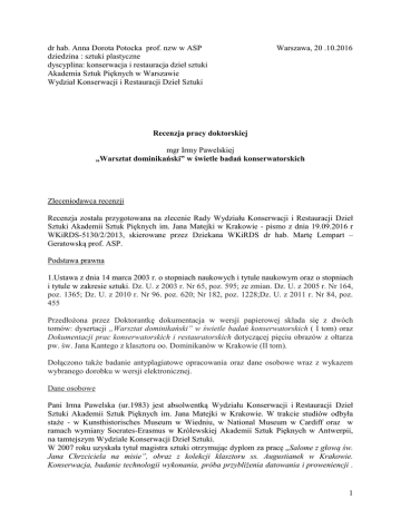 dr hab. Anna Dorota Potocka prof. nzw w ASP dziedzina : sztuki plastyczne dyscyplina: konserwacja i restauracja dzieł sztuki Akademia Sztuk Pięknych w Warszawie Wydział Konserwacji i Restauracji Dzieł Sztuki Warszawa, 20 .10.2016 Recenzja pracy doktorskiej mgr Irmy Pawelskiej „Warsztat dominikański” w świetle badań konserwatorskich Zleceniodawca recenzji Recenzja została przygotowana na zlecenie Rady Wydziału Konserwacji i Restauracji Dzieł Sztuki Akademii Sztuk Pięknych im. Jana Matejki w Krakowie - pismo z dnia 19.09.2016 r WKiRDS-5130/2/2013, skierowane przez Dziekana WKiRDS dr hab. Martę Lempart – Geratowską prof. ASP. Podstawa prawna 1.Ustawa z dnia 14 marca 2003 r. o stopniach naukowych i tytule naukowym oraz o stopniach i tytule w zakresie sztuki. Dz. U. z 2003 r. Nr 65, poz. 595; ze zmian. Dz. U. z 2005 r. Nr 164, poz. 1365; Dz. U. z 2010 r. Nr 96. poz. 620; Nr 182, poz. 1228;Dz. U. z 2011 r. Nr 84, poz. 455 Przedłożona przez Doktorantkę dokumentacja w wersji papierowej składa się z dwóch tomów: dysertacji „Warsztat dominikański” w świetle badań konserwatorskich ( I tom) oraz Dokumentacji prac konserwatorskich i restauratorskich dotyczącej pięciu obrazów z ołtarza pw. św. Jana Kantego z klasztoru oo. Dominikanów w Krakowie (II tom). Dołączono także badanie antyplagiatowe opracowania oraz dane osobowe wraz z wykazem wybranego dorobku w wersji elektronicznej. Dane osobowe Pani Irma Pawelska (ur.1983) jest absolwentką Wydziału Konserwacji i Restauracji Dzieł Sztuki Akademii Sztuk Pięknych im. Jana Matejki w Krakowie. W trakcie studiów odbyła staże - w Kunsthistorisches Museum w Wiedniu, w National Museum w Cardiff oraz w ramach wymiany Socrates-Erasmus w Królewskiej Akademii Sztuk Pięknych w Antwerpii, na tamtejszym Wydziale Konserwacji Dzieł Sztuki. W 2007 roku uzyskała tytuł magistra sztuki otrzymując dyplom za pracę „Salome z głową św. Jana Chrzciciela na misie”, obraz z kolekcji klasztoru ss. Augustianek w Krakowie. Konserwacja, badanie technologii wykonania, próba przybliżenia datowania i proweniencji . 1 (promotor prof. Grażyna Korpal). Po uzyskaniu dyplomu odbyła prawie roczny staż w Królewskim Instytucie Dziedzictwa Artystycznego KIK-IRPA w Brukseli a także uczęszczała na kurs ebenistyki w Instytucie Diderot. W następnym roku z powodzeniem odbyła dwunastomiesięczny staż w Kunsthistorisches Museum w Wiedniu w pracowni konserwacji malarstwa sztalugowego. W 2009 roku została pracownikiem macierzystego Wydziału w Katedrze Malowideł Ściennych. W 2011 roku została przyjęta do grupy dwunastu stażystów programu edukacyjnego Getty Panel Painting Initiative (Getty PPI) w ramach którego w 2012 roku pracowała pod kierunkiem Raya Marchanta i Simona Bobaka w London Studio of the Hamilton Kerr Institute Uniwersytetu w Cambridge, w 2013 roku uczestniczyła w warsztatach podczas prac konserwatorskich przy obrazach z cyklu św. Katarzyny Aleksandryjskiej Hansa Sueska Kulmbacha ze zbiorów Bazyliki Mariackiej oraz w 2014 roku, przez cztery miesiące, pracowała pod kierunkiem Jose de La Fuente w madryckim muzeum Prado. Ponadto uczestniczyła w serii krótszych – tygodniowych warsztatów dotyczących konserwacji strukturalnej podobrazi drewnianych organizowanych w różnych miastach Europy (Florencja, Madryt, Londyn, Bruksela, Maastricht). Pracowała także w pracowniach konserwatorskich w Brukseli i Wiedniu. W latach 2011-2012 była stypendystką Ministerstwa Nauki i Szkolnictwa Wyższego. Ocena dorobku W jej interesującym i zróżnicowanym już dorobku, znajduje się wiele dokonań konserwatorskich związanych z zagranicznymi stażami w Wiedniu, Londynie, Madrycie, Brukseli etc. jak i pracami rodzimych zespołów konserwatorskich. Dotyczy to obrazów wykonanych na podłożach drewnianych, tekstylnych, mebli (m.in. XVIII-to wieczne wyposażenie tzw. Zimowej Zakrystii opactwa w Melku) jak i malowideł ściennych, pochodzących z XV po XVIII wiek. Doktorantka samodzielnie wykonała prace konserwatorskie przy pięciu obrazach z ołtarza pw. św. Jana Kantego z klasztoru oo. Dominikanów w Krakowie, datowanych na rok 1604, przypisywanych Stanisławowi Boi z wizerunkami świętych: Jacka, Dominika, Agnieszki z Montepulciano, Katarzyny ze Sieny i Rajmunda de Penyafort. Na jej dorobek składa się także konserwacja obrazów Pocałunek Judasza i Modlitwa w Ogrojcu należących do kolekcji Bazyliki Mariackiej w Krakowie, datowanych na początek XVII wieku, będących najprawdopodobniej częścią nieistniejącego ołtarza Zwiastowania Jakuba Mertensa. W roku bieżącym wraz z Aleksandrą Holą i Grzegorzem Kosteckim wykonała konserwację obrazów na drewnie z wizerunkami świętych Stanisława i Wojciecha, należących do nieistniejącego, XV-to wiecznego ołtarza głównego z Katedry Wawelskiej w Krakowie. Jest autorką publikacji, które ukazały się w branżowych czasopismach min. w Bulletin BRKAPROA, Association Professionnelle de Conservateures – Restaurateursd’Ouvresd’Art” (Belgia, 2007) a także aktywną uczestniczką międzynarodowych konferencji i sympozjów (Facing the Challenges of Panel Paintings Conservation: Trends, Treatments and Training Los Angeles 2009). Jej wszechstronne zainteresowania i doświadczenie zdobyte podczas licznych staży zagranicznych, jest znakomitą bazą dla dalszych prac badawczych i konserwatorskich prowadzonych w kraju. W oparciu o zdobyte doświadczenie i wiedzę, konfrontowane ze 2 współczesnymi wyzwaniami przed którymi stoi nasza dyscyplina, Pani Irma Pawelska z powodzeniem samodzielnie realizuje podjęte zadania w obszarze konserwacji dzieł sztuki. Ocena pracy doktorskiej Pracę wykonano na Wydziale Konserwacji i Restauracji Dzieł Sztuki Akademii Sztuk Pięknych im. Jana Matejki w Krakowie pod kierunkiem prof. dr hab. Grażyny Korpal. Doktorantka podjęła temat dotyczący tzw.„warsztatu dominikańskiego” działającego przy konwencie oo. Dominikanów w
