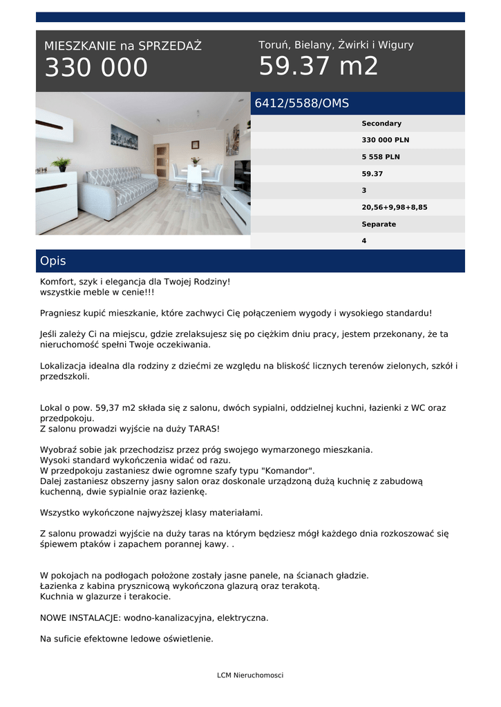 Toruń, Bielany, Żwirki i Wigury MIESZKANIE na SPRZEDAŻ 59.37 m2 330 000 6412/5588/OMS Secondary 330 000 PLN 5 558 PLN 59.37 3 20,56+9,98+8,85 Separate 4 Opis Komfort, szyk i elegancja dla Twojej Rodziny! wszystkie meble w cenie!!! Pragniesz kupić mieszkanie, które zachwyci Cię połączeniem wygody i wysokiego standardu! Jeśli zależy Ci na miejscu, gdzie zrelaksujesz się po ciężkim dniu pracy, jestem przekonany, że ta nieruchomość spełni Twoje oczekiwania. Lokalizacja idealna dla rodziny z dziećmi ze względu na bliskość licznych terenów zielonych, szkół i przedszkoli. Lokal o pow. 59,37 m2 składa się z salonu, dwóch sypialni, oddzielnej kuchni, łazienki z WC oraz przedpokoju. Z salonu prowadzi wyjście na duży TARAS! Wyobraź sobie jak przechodzisz przez próg swojego wymarzonego mieszkania. Wysoki standard wykończenia widać od razu. W przedpokoju zastaniesz dwie ogromne szafy typu "Komandor". Dalej zastaniesz obszerny jasny salon oraz doskonale urządzoną dużą kuchnię z zabudową kuchenną, dwie sypialnie oraz łazienkę. Wszystko wykończone najwyższej klasy materiałami. Z salonu prowadzi wyjście na duży taras na którym będziesz mógł każdego dnia rozkoszować się śpiewem ptaków i zapachem porannej kawy. . W pokojach na podłogach położone zostały jasne panele, na ścianach gładzie. Łazienka z kabina prysznicową wykończona glazurą oraz terakotą. Kuchnia w glazurze i terakocie. NOWE INSTALACJE: wodno-kanalizacyjna, elektryczna. Na suficie efektowne ledowe oświetlenie. LCM Nieruchomosci Wszystkie okna PCV. Możliwość dokupienia mebli najwyższej klasy w cenie 20 000 zł. Czynsz do spółdzielni - około 470 zł. W otoczeniu pełna infrastruktura: sklepy, markety, punkty usługowe, przystanki MZK, szpital miejski, obiekty rekreacyjne (lodowisko, korty tenisowe, hala sportowa). MIESZKANIE, O KTÓRYM MARZYSZ CZEKA TYLKO NA CIEBIE!!!! POŚREDNICTWO W OBROCIE NIERUCHOMOŚCIAMI JEST USŁUGĄ ODPŁATNĄ. Oświadczenie Biuro Pośrednictwa LCM Nieruchomości działa zgodnie z zasadami Standardów Zawodowych Pośredników w Obrocie Nieruchomościami, zamieszcza w ofertach informacje prawdziwe wg wszelkiej wiedzy i starania, nie łamie regulaminów serwisów nieruchomościowych, w tym nie publikuje celowo nieaktualnych i nieistniejących ofert, oraz stanowczo odcina się od praktyk nieetycznych i wprowadzających inne firmy oraz potencjalnych klientów w błąd. ZAPEWNIAMY BEZPŁATNE I PROFESJONALNE DORADZTWO W ZAKRESIE POZYSKIWANIA KREDYTÓW HIPOTECZNYCH NA ZAKUP NIERUCHOMOŚCI Powyższe informacje zostały sporządzone na podstawie oświadczeń i nie są ofertą w rozumieniu przepisów Kodeksu Cywilnego. Mają one jedynie charakter informacyjny. Jolanta Adamczyk tel. 883941097 email: [email protected] LCM Nieruchomosci Powered by TCPDF (www.tcpdf.org)