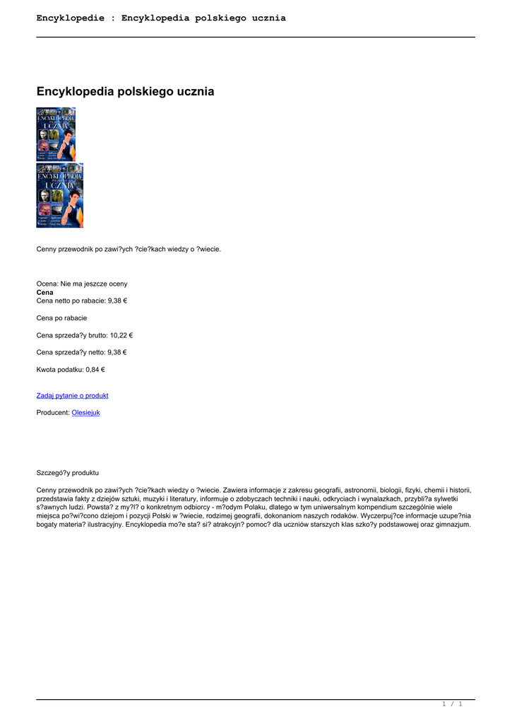 Encyklopedie : Encyklopedia polskiego ucznia Encyklopedia polskiego ucznia Cenny przewodnik po zawi?ych ?cie?kach wiedzy o ?wiecie. Ocena: Nie ma jeszcze oceny Cena Cena netto po rabacie: 9,38 € Cena po rabacie Cena sprzeda?y brutto: 10,22 € Cena sprzeda?y netto: 9,38 € Kwota podatku: 0,84 € Zadaj pytanie o produkt Producent: Olesiejuk Szczegó?y produktu Cenny przewodnik po zawi?ych ?cie?kach wiedzy o ?wiecie. Zawiera informacje z zakresu geografii, astronomii, biologii, fizyki, chemii i historii, przedstawia fakty z dziejów sztuki, muzyki i literatury, informuje o zdobyczach techniki i nauki, odkryciach i wynalazkach, przybli?a sylwetki s?awnych ludzi. Powsta? z my?l? o konkretnym odbiorcy - m?odym Polaku, dlatego w tym uniwersalnym kompendium szczególnie wiele miejsca po?wi?cono dziejom i pozycji Polski w ?wiecie, rodzimej geografii, dokonaniom naszych rodaków. Wyczerpuj?ce informacje uzupe?nia bogaty materia? ilustracyjny. Encyklopedia mo?e sta? si? atrakcyjn? pomoc? dla uczniów starszych klas szko?y podstawowej oraz gimnazjum. 1 / 1 Powered by TCPDF (www.tcpdf.org)
