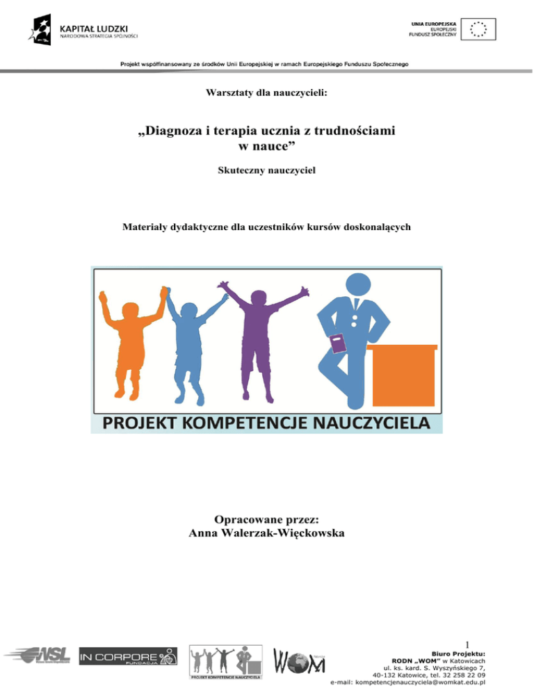 Warsztaty dla nauczycieli: „Diagnoza i terapia ucznia z trudnościami w nauce” Skuteczny nauczyciel Materiały dydaktyczne dla uczestników kursów doskonalących Opracowane przez: Anna Walerzak-Więckowska 1 Biuro Projektu: RODN „WOM” w Katowicach ul. ks. kard. S. Wyszyńskiego 7, 40-132 Katowice, tel. 32 258 22 09 e-mail: [email protected] DYSKALKULIA ROZWOJOWA – DIAGNOZA I TERAPIA Do zrozumienia dyskalkulii rozwojowej jako zaburzenia zdolności matematycznych niezbędne jest wyjaśnienie podstawowych pojęć. Zdolności matematyczne są to dyspozycje, które stanowią warunek pomyślnego uczenia się i uzyskiwania osiągnięć w matematyce. Jest to zdolność do zrozumienia istoty matematycznej i pokrewnych problemów, metod i twierdzeń; zdolność do uczenia się, pamiętania i odtwarzania ich; do wiązania ich z innymi problemami, symbolami, metodami i twierdzeniami; do używania ich przy rozwiązywaniu matematycznych i podobnych problemów (L. Košč). Liczne badania neurologiczne dowodzą istnienia specjalnych predyspozycji do matematyki. Jeżeli zostaną zniszczone określone ośrodki w mózgu, powstają zaburzenia w zakresie zdolności matematycznych. Obszary te są więc uważane za anatomicznofizjologiczne podłoże tych zdolności. Zaburzenia zdolności matematycznych są wynikiem dziedzicznego lub wrodzonego osłabienia pełnej dynamiczności ośrodków mózgowych, stanowiących organiczne podłoże tych zdolności. Korzystne cechy wrodzone mogą być osłabione w czasie rozwoju. Jeżeli nastąpi to w ciągu pierwszego roku życia, kiedy umysł dziecka jest jeszcze bardzo plastyczny, mogą powstać praktycznie nieodwracalne zaburzenia zdolności matematycznych, tak jakby predyspozycje te nie istniały genetycznie. We wszystkich tych przypadkach mamy do czynienia z dyskalkulią rozwojową. Dyskalkulia rozwojowa jest strukturalnym zaburzeniem zdolności matematycznych mającym swe źródło w genetycznych lub wrodzonych nieprawidłowościach tych części mózgu, które są bezpośrednim anatomiczno-fizjologicznym podłożem dojrzewania zdolności matematycznych zgodnie z wiekiem; jest zaburzeniem występującym bez jednoczesnego zaburzenia ogólnych funkcji umysłowych (L. Košč ). Pojęcie dyskalkulii rozwojowej odnosi się jedynie do dzieci, u których stwierdzono wiek matematyczny wyraźnie niższy od wieku jego rozwoju umysłowego. Iloraz matematyczny ( I. M. ) jest obliczany za pomocą formuły analogicznej do używanej w przypadku obliczania ilorazu inteligencji : wiek matematyczny ( W. M. ) I. M. = ____________________________ x 100 wiek życia ( W. Ż ) 2 Biuro Projektu: RODN „WOM” w Katowicach ul. ks. kard. S. Wyszyńskiego 7, 40-132 Katowice, tel. 32 258 22 09 e-mail: [email protected] Iloraz matematyczny ≤70 jest uważany za niższy niż przeciętny W przypadku braku predyspozycji dziecko nie jest w stanie zdobyć podstawowych umiejętności i wiedzy bez intensywnego oraz systematycznego ćwiczenia. Psychologiczna analiza zaburzeń matematycznych funkcji umysłowych u dorosłych wykazała, że same zdolności matematyczne nie są proste ani zwarte; podobnie jak w przypadku ogólnych zdolności umysłowych, konieczne jest rozróżnianie pomiędzy poszczególnymi względnie niezależnymi zdolnościami lub funkcjami. Te specyficzne zdolności wydają się rozwijać w niejednolity sposób i jeżeli występują zaburzenia typu dyskalkulia rozwojowa, to nie dotyczą one w jednakowym stopniu wszystkich funkcji. Podstawowe formy dyskalkulii rozwojowej (L. Košč ): Dyskalkulia werbalna (słowna) przejawia się zaburzeniem umiejętności słownego wyrażania pojęć i zależności matematycznych, takich jak oznaczanie ilości i kolejności przedmiotów, nazywanie cyfr i liczebników, symboli działań i operacji matematycznych. Zdarzają się przypadki uszkodzeń mózgowych, przy których dziecko nie jest zdolne utożsamiać określonej ilości z odpowiadającą jej liczbą, np. pokazać określoną liczbę palców, chociaż jest zdolne przeczytać i napisać daną liczbę czy policzyć przedmioty (dyskalkulia sensoryczno-słowna). Człowiek z werbalną dyskalkulią może nie być w stanie określić ilości pokazanych rzeczy czy wartości napisanych liczb, chociaż potrafi odczytać i napisać dane liczby ( dyskalkulia czynnościowo-słowna). Dyskalkulia praktognostyczna (wykonawcza): zaburzenie matematycznych manipulacji konkretnymi lub obrazowymi przedmiotami ( palcami, piłkami, kostkami, patyczkami itd.). Manipulacje matematyczne obejmują liczenie (pojedyncze dodawanie) przedmiotów oraz porównywanie wielkości czy ilości (bez ich dodawania). Dziecko z dyskalkulią wykonawczą nie jest w stanie ułożyć patyczków kolejno wg ich wielkości, nie jest w stanie wskazać, który z nich jest cieńszy, grubszy czy tej samej wielkości. Dyskalkulia leksykalna: zaburzenie związane z nieumiejętnością czytania symboli matematycznych (cyfr, liczb, znaków działań matematycznych i zapisanych operacji matematycznych). W cięższym przypadku dziecko nie potrafi odczytywać pojedynczych cyfr czy prostych znaków działań matematycznych ( +, -, x, :, itd. ). W lżejszej postaci nie umie czytać liczb wielocyfrowych, szczególnie mających więcej niż jedno zero w środku, a także ułamków, kwadratów i pierwiastków, liczb dziesiętnych itd. W niektórych przypadkach zamienia podobne wyglądem cyfry: 3 i 8, 6 i 9, albo odczytuje w odwrotnym kierunku liczby dwucyfrowe: 12 jak 21 itp. Dyskalkulia graficzna: niezdolność zapisywania symboli matematycznych, często współwystępująca z dysgrafią i dysleksją. W poważniejszych przypadkach uczeń nie jest w stanie napisać dyktowanych liczb, nazw liczb, a nawet ich skopiować. 3 Biuro Projektu: RODN „WOM” w Katowicach ul. ks. kard. S. Wyszyńskiego 7, 40-132 Katowice, tel. 32 258 22 09 e-mail: [email protected] W łagodniejszym przypadku nie potrafi napisać liczb dwu- czy trzycyfrowych – pisze je 
