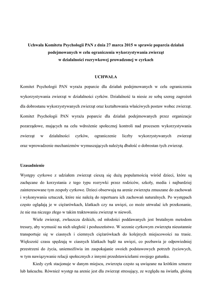 Uchwała Komitetu Psychologii PAN z dnia 27 marca 2015 w sprawie poparcia działań podejmowanych w celu ograniczenia wykorzystywania zwierząt w działalności rozrywkowej prowadzonej w cyrkach UCHWAŁA Komitet Psychologii PAN wyraża poparcie dla działań podejmowanych w celu ograniczenia wykorzystywania zwierząt w działalności cyrków. Działalność ta niesie ze sobą szereg zagrożeń dla dobrostanu wykorzystywanych zwierząt oraz kształtowania właściwych postaw wobec zwierząt. Komitet Psychologii PAN wyraża poparcie dla działań podejmowanych przez organizacje pozarządowe, mających na celu wdrożenie społecznej kontroli nad procesem wykorzystywania zwierząt w działalności cyrków, ograniczenie liczby wykorzystywanych zwierząt oraz wprowadzenie mechanizmów wymuszających należytą dbałość o dobrostan tych zwierząt. Uzasadnienie Występy cyrkowe z udziałem zwierząt cieszą się dużą popularnością wśród dzieci, które są zachęcane do korzystania z tego typu rozrywki przez rodziców, szkoły, media i najbardziej zainteresowane tym zespoły cyrkowe. Dzieci obserwują na arenie zwierzęta zmuszane do zachowań i wykonywania sztuczek, które nie należą do repertuaru ich zachowań naturalnych. Po występach często oglądają je w ciężarówkach, klatkach czy na uwięzi, co może utrwalać ich przekonanie, że nie ma niczego złego w takim traktowaniu zwierząt w niewoli. Wiele zwierząt, zwłaszcza dzikich, od młodości poddawanych jest brutalnym metodom tresury, aby wymusić na nich uległość i posłuszeństwo. W sezonie cyrkowym zwierzęta nieustannie transportuje się w ciasnych i ciemnych ciężarówkach do kolejnych miejscowości na trasie. Większość czasu spędzają w ciasnych klatkach bądź na uwięzi, co pozbawia je odpowiedniej przestrzeni do życia, uniemożliwia im zaspokajanie swoich podstawowych potrzeb życiowych, w tym nawiązywanie relacji społecznych z innymi przedstawicielami swojego gatunku. Kiedy cyrk stacjonuje w danym miejscu, zwierzęta często są uwiązane na krótkim sznurze lub łańcuchu. Również występ na arenie jest dla zwierząt stresujący, ze względu na światła, głośną muzykę i tłum hałasujących ludzi. Poza sezonem zwierzęta trzymane są w tzw. kwaterach zimowych, często małych i obskurnych pomieszczeniach. U wielu zwierząt cyrkowych takich jak lwy, tygrysy czy słonie można zaobserwować stereotypie, będące manifestacją powstających zaburzeń psychicznych. Przyczyną tych zachowań jest głównie permanentny stres, wynikający z izolacji oraz bardzo małej przestrzeni, w której te zwierzęta są przetrzymywane. Wiele krajów na świecie zakazało wykorzystywania wszystkich, bądź przynajmniej dzikich zwierząt w cyrkach. Spektakle cyrkowe z udziałem zwierząt są pozbawione walorów edukacyjnych, a także potencjalnie szkodliwe dla procesu wychowania młodych ludzi. Warto wspomnieć, że człowiek szkoli zwierzęta dla osiągnięcia rozmaitych celów, w tym wsparcia działalności rozmaitych służb ratowniczych lub mundurowych, działalności hobbystycznej, przystosowania zwierząt towarzyszących do asystowania osobom z różnymi formami niepełnosprawności, dla potrzeb terapeutycznych, sportowych i poprawiania dobrostanu szkolonych zwierząt. We wszystkich tych formach wykorzystywania i szkolenia zwierząt wartości stojące za podejmowaniem decyzji o użyciu zwierzęcia i podjęciu jego szkolenia mogą taką aktywność uzasadniać. W przypadku działalności cyrkowej osiągane wartości tej działalności (rozrywka dla publiczności oraz wypracowanie zysku dla cyrku) są możliwe do osiągnięcia bez wykorzystywania zwierząt. Ponadto, warunki, w jakich zwierzęta cyrkowe są utrzymywane, czynią ten sektor działalności gospodarczej niezwykle okrutnym i urągającym współczesnym standardom moralnym. Warszawa, 27 marca 2015r.
