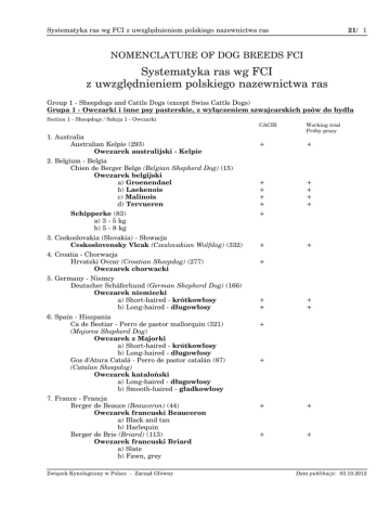 Systematyka ras wg FCI z uwzględnieniem polskiego nazewnictwa ras 21/ 1 NOMENCLATURE OF DOG BREEDS FCI Systematyka ras wg FCI z uwzględnieniem polskiego nazewnictwa ras Group 1 - Sheepdogs and Cattle Dogs (except Swiss Cattle Dogs) Grupa 1 - Owczarki i inne psy pasterskie, z wyłączeniem szwajcarskich psów do bydła Section 1 - Sheepdogs / Sekcja 1 - Owczarki 1. Australia Australian Kelpie (293) Owczarek australijski - Kelpie 2. Belgium - Belgia Chien de Berger Belge (Belgian Shepherd Dog) (15) Owczarek belgijski a) Groenendael b) Laekenois c) Malinois d) Tervueren Schipperke (83) a) 3 - 5 kg b) 5 - 8 kg 3. Czekoslovakia (Slovakia) - Słowacja Ceskoslovensky Vlcak (Czeslovakian Wolfdog) (332) 4. Croatia - Chorwacja Hrvatski Ovcar (Croatian Sheepdog) (277) Owczarek chorwacki 5. Germany - Niemcy Deutscher Schäferhund (German Shepherd Dog) (166) Owczarek niemiecki a) Short-haired - krótkowłosy b) Long-haired - długowłosy 6. Spain - Hiszpania Ca de Bestiar - Perro de pastor mallorquin (321) (Majorca Shepherd Dog) Owczarek z Majorki a) Short-haired - krótkowłosy b) Long-haired - długowłosy Gos d'Atura Catalá - Perro de pastor catalán (87) (Catalan Sheepdog) Owczarek kataloński a) Long-haired - długowłosy b) Smooth-haired - gładkowłosy 7. France - Francja Berger de Beauce (Beauceron) (44) Owczarek francuski Beauceron a) Black and tan b) Harlequin Berger de Brie (Briard) (113) Owczarek francuski Briard a) Slate b) Fawn, grey Związek Kynologiczny w Polsce - Zarząd Główny CACIB Working trial Próby pracy + + + + + + + + + + + + + + + + + + + + + + + + Data publikacji: 03.10.2012 21/ 2 Systematyka ras wg FCI z uwzględnieniem polskiego nazewnictwa ras Berger de Picardie (Berger Picard) (176) Owczarek pikardyjski Berger des Pyrénées a poil long (141) (Long-haired Pyrenean Sheepdog) Owczarek pirenejski (a poil long) Berger des Pyrénées a face rase (138) (Pyrenean Sheepdog - smooth faced) Owczarek pirenejski (a face rase) 8. Great Britain - Wielka Brytania Bearded Collie (271) Borded Collie (297) Collie Rough (156) Owczarek szkocki długowłosy Collie Smooth (296) Owczarek szkocki krótkowłosy Old English Sheepdog (Bobtail) (16) Owczarek staroangielski Bobtail Shetland Sheepdog (88) Owczarek szetlandzki Welsh Corgi Cardigan (38) Welsh Corgi Pembroke (39) CACIB Working trial Próby pracy + + + + + + + + + + + + + + + 9. Italy - Włochy Cane da pastore Bergamasco (Bergamasco Shepherd Dog) (194) Bergamasco Cane da pastore Maremmano-Abruzzese (201) (Maremma and Abruzzes Sheepdog) Maremmano-Abruzzese + + 10. Hungary - Węgry Komondor (53) Kuvasz (54) Mudi (238) a) Black b) Blue-merle c) Ashen d) Brown e) White Puli (55) a) Black b) Black discretely shaded with rust-red or grey c) Fawn with pronounced black mask + + + + d) Pearl-white without any rust-red shade + Pumi (56) a) Grey in different shades b) Black c) Fawn: groundcolours red, yellow, cream d) White + 11. The Netherlands - Holandia Hollandse Herdershond (Dutch Shepherd Dog) (223) Owczarek holenderski a) Short-haired - krótkowłosy b) Long-haired - długowłosy c) Rough-haired - szorstkowłosy + + + Związek Kynologiczny w Polsce - Zarząd Główny Systematyka ras wg FCI z uwzględnieniem polskiego nazewnictwa ras CACIB Saarlooswolfhond (Saarloos Wolfdog) (311) Schapendoes (313) 12. Poland - Polska Polski Owczarek Nizinny (Polish Lowland Sheepdog) (251) Polski owczarek nizinny Polski Owczarek Podhalanski (Tatra Shepherd Dog) (252) Owczarek podhalański + + + 14. Slovakia - Słowacja Slovenský Cuvac (Slovakian Chuvach) (142) + 16. Switzerland - Szwajcaria Berger Blanc Suisse (White Swiss Shepherd Dog) (347) Biały owczarek szwajcarski 17. U.S.A. Australian Shepherd (342) Owczarek australijski (typ amerykański) Working trial Próby pracy + + 13. Portugal - Portugalia Cão da Serra de Aires (Portuguese Sheepdog) (93) 15. Russia - Rosja Ioujnorousskaia Ovtcharka (326) (South Russian Shepherd Dog) Owczarek południoworosyjski Jużak 21/ 3 + + + Section 2 - Cattle Dogs (except Swiss Cattle Dogs) / Sekcja 2 - Psy pasterskie, z wyłączeniem szwajcarskich psów do bydła 1. Australia Australian Cattle Dog (287) + 2. Belgium - Belgia Bouvier des Ardennes (Ardennes Cattle Dog) (171) + + + + 3. Belgium/France - Belgia/Francja Bouvier des Flandres / Vlaamse Koehond (191) (Flandres Cattle Dog) Związek Kynologiczny w Polsce - Zarząd Główny 21/ 4 Systematyka ras wg FCI z uwzględnieniem polskiego nazewnictwa ras Group 2 - Pinscher and Schnauzer - Molossoid breeds - Swiss Mountain and Cattle Dogs and other breeds Grupa 2 - Pinczery i sznaucery, molosy, szwajcarskie psy górskie i do bydła, pozostałe rasy CACIB Working trial Próby pracy + + Section 1 - Pinscher and Schnauzer type / Sekcja 1 - Pinczery i sznaucery 1.1. Pinscher - Pinczery 1. Germany - Niemcy Dobermann (143) Doberman a) Black with rust red markings b) Brown with rust red markings German Pinscher (184) Pinczer średni a) Stag-red, red-brown to dark red-brown b) Black with tan markings Zwergpinscher (Miniature Pinscher) (185) Pinczer miniaturowy a) Stag-red, red-brown to dark red-brown b) Black with tan markings Affenpinscher (186) Pinczer małpi 2. Austria Österreichischer Kurzhaariger Pinscher (64) (Austrian short-haired Pinscher) Pinczer austriacki + + + + 1.2. Schnauzer - Sznaucery 1. Germany - Niemcy Riesenschnauzer (Giant Schnauzer) (181) Sznaucer olbrzym a) Pure black with undercoat - czarny b) Pepper and salt = blackened sand with sandcoloured markings - pieprz i sól Schnauzer (182) Sznaucer średni a) Pure black with undercoat - czarny b) Pepper and salt = blackened sand with sandcoloured markings - pieprz i sól Zwergschnauzer (Miniature Schnauzer) (183) Sznaucer miniaturowy a) Pure black with undercoat - czarny b) Pepper and salt = blackened sand with sandcoloured markings - pieprz i sól c) Black and silver = black with sand-coloured markings - czarno-srebrny d) Pure white with undercoat - biały + + + + + + + + + + 1.3. Smoushond 1.The Netherlands 