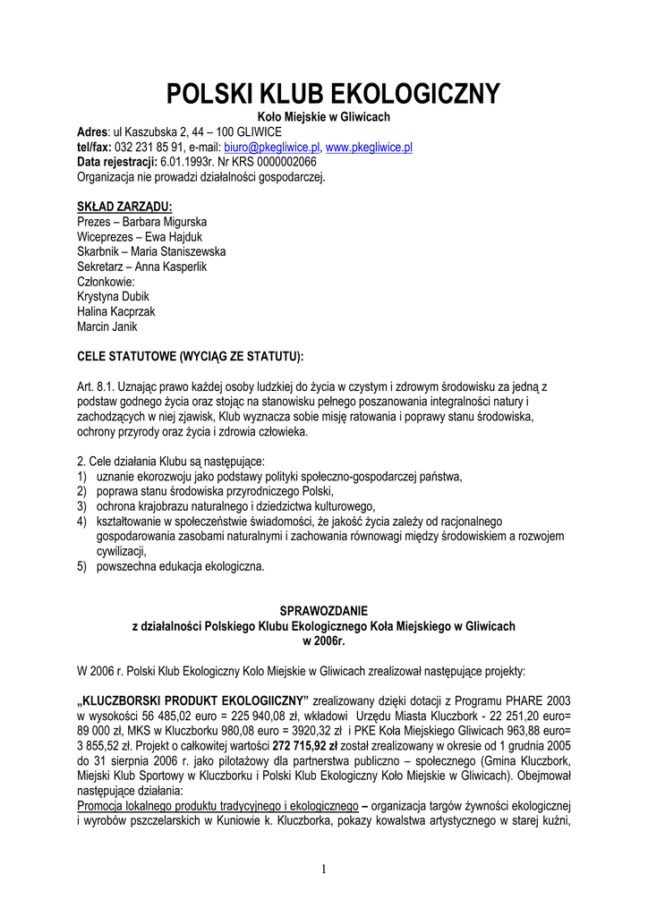 POLSKI KLUB EKOLOGICZNY Koło Miejskie w Gliwicach Adres: ul Kaszubska 2, 44 – 100 GLIWICE tel/fax: 032 231 85 91, e-mail: [email protected], www.pkegliwice.pl Data rejestracji: 6.01.1993r. Nr KRS 0000002066 Organizacja nie prowadzi działalności gospodarczej. SKŁAD ZARZĄDU: Prezes – Barbara Migurska Wiceprezes – Ewa Hajduk Skarbnik – Maria Staniszewska Sekretarz – Anna Kasperlik Członkowie: Krystyna Dubik Halina Kacprzak Marcin Janik CELE STATUTOWE (WYCIĄG ZE STATUTU): Art. 8.1. Uznając prawo kaŜdej osoby ludzkiej do Ŝycia w czystym i zdrowym środowisku za jedną z podstaw godnego Ŝycia oraz stojąc na stanowisku pełnego poszanowania integralności natury i zachodzących w niej zjawisk, Klub wyznacza sobie misję ratowania i poprawy stanu środowiska, ochrony przyrody oraz Ŝycia i zdrowia człowieka. 2. Cele działania Klubu są następujące: 1) uznanie ekorozwoju jako podstawy polityki społeczno-gospodarczej państwa, 2) poprawa stanu środowiska przyrodniczego Polski, 3) ochrona krajobrazu naturalnego i dziedzictwa kulturowego, 4) kształtowanie w społeczeństwie świadomości, Ŝe jakość Ŝycia zaleŜy od racjonalnego gospodarowania zasobami naturalnymi i zachowania równowagi między środowiskiem a rozwojem cywilizacji, 5) powszechna edukacja ekologiczna. SPRAWOZDANIE z działalności Polskiego Klubu Ekologicznego Koła Miejskiego w Gliwicach w 2006r. W 2006 r. Polski Klub Ekologiczny Kolo Miejskie w Gliwicach zrealizował następujące projekty: „KLUCZBORSKI PRODUKT EKOLOGIICZNY” zrealizowany dzięki dotacji z Programu PHARE 2003 w wysokości 56 485,02 euro = 225 940,08 zł, wkładowi Urzędu Miasta Kluczbork - 22 251,20 euro= 89 000 zł, MKS w Kluczborku 980,08 euro = 3920,32 zł i PKE Koła Miejskiego Gliwicach 963,88 euro= 3 855,52 zł. Projekt o całkowitej wartości 272 715,92 zł został zrealizowany w okresie od 1 grudnia 2005 do 31 sierpnia 2006 r. jako pilotaŜowy dla partnerstwa publiczno – społecznego (Gmina Kluczbork, Miejski Klub Sportowy w Kluczborku i Polski Klub Ekologiczny Koło Miejskie w Gliwicach). Obejmował następujące działania: Promocja lokalnego produktu tradycyjnego i ekologicznego – organizacja targów Ŝywności ekologicznej i wyrobów pszczelarskich w Kuniowie k. Kluczborka, pokazy kowalstwa artystycznego w starej kuźni, 1 wypiek chleba według tradycyjnej receptury w zabytkowej piekarni, cykl konkursów na temat Ŝywności ekologicznej dla młodzieŜy z kluczborskich gimnazjów. W ramach projektu sfinansowano takŜe wykonanie trzech stoisk rozbieralnych dla rolników ekologicznych przydatnych na róŜnych imprezach otwartych organizowanych takŜe poza Kluczborkiem. Stworzenie zaplecza dla prowadzenia czynnej edukacji ekologicznej - utworzenie Ośrodka Edukacji Ekologicznej, Pszczelarskiej i Historycznej przy Muzeum im. Jana DzierŜona w Kluczborku i Centrum Szkoleniowo-Konferencyjnego „EKOTUR” na terenie Miejskiego Ośrodka Turystyki i Sportu w Bąkowie. Z projektu sfinansowano prac remontowych i adaptacyjnych oraz zakup wyposaŜenia i sprzętu (5 komputerów z oprogramowaniem, rzutnik multimedialny, aparat cyfrowy, kamera cyfrowa, odtwarzacz DVD, 20 stołów i 80 krzeseł oraz 10 rowerów do wypoŜyczalni). Opublikowano ksiąŜkę „Zieleń miasta Kluczborka”, w której opisano ogólnodostępne tereny zieleni miasta Kluczborka oraz podano wiele informacji o występujących tam drzewach i krzewach. Aktywizacja społeczności lokalnych w celu tworzenia inicjatyw ekologicznych na rzecz zatrudnienia obejmowała cykl 14 dwudniowych warsztatów rękodzielnictwa, dwa warsztaty pszczelarskie w Pasiece Zarodowej w Maciejowie oraz dwudniowy kurs rolnictwa ekologicznego dla zainteresowanych rolników. Podczas warsztatów rękodzielnictwa uczestnicy zapoznali się z techniką haftowania, dziergania na drutach i szydełkiem, malowania jaj wielkanocnych, plecenia koszyków z wikliny, rzeźbienia w masie solnej, gotowania potraw tradycyjnych oraz z przepisami obowiązującymi dla usług gastronomicznych w gospodarstwie agroturystycznym. „MONITORING WDRAśANIA ZALECEŃ UNII EUROPEJSKIEJ W ZAKRESIE ZASAD ZRÓWNOWAśONEGO ROZWOJU I OCHRONY ŚRODOWISKA W ROLNICTWIE” zrealizowany dzięki dotacji z Programu PHARE 2003 w wysokości 19 511,33 euro = 78 045 zł i 1800,00 zł z WFOŚiGW oraz wkładowi własnemu PKE Koła Miejskiego w Gliwicach w kwocie 1657,24 euro = 6629 zł. Projekt o całkowitej wartości 86 474 zł został zrealizowany w okresie od 1 grudnia 2005 do 31 sierpnia 2006 r. Obejmował następujące działania: Monitoring wdraŜania II filaru polityki rolnej oraz polityki strukturalnej na terenach wiejskich – kompletowanie informacji i spostrzeŜeń podczas spotkań doradców rolnośrodowiskowych i Koalicji na Rzecz Rozwoju Rolnictwa Ekologicznego oraz na zamkniętym internetowym forum dyskusyjnym członków Koalicji na stronie www.pkegliwice.pl. Monitoring przygotowań dokumentów dla następnego okresu programowania na lata 2007-2013 pod kątem ochrony środowiska w polityce rolnej przez bieŜące komentowanie dokumentów dotyczących rozwoju wsi i rolnictwa ekologicznego, w ramach stałego elektronicznego kontaktu z Ministerstwem Rolnictwa i Rozwoju Wsi. Upowszechnianie informacji na temat moŜliwości wdraŜania zasad zrównowaŜonego rozwoju, a w szczególności ochrony przyrody i ich finansowania w ramach polityki Unii Europejskiej przez zorganizowanie ogólnopolskiej konferencji p. t. „ROLNICY DLA ŚRODOWISKA - DOŚWIADCZENIA PIERWSZYCH LAT CZŁONKOSTWA W UNII EUROPEJSKIEJ I REKOMENDACJE NA PRZYSZŁOŚĆ” w Krakowie w dniach 1-2 czerwca 2006 r. połączonej z wyjazdem do gospodarstw realizujących program rolnośrodowiskowy we wsi Ispina, umieszczanie bieŜących informacji w Internecie na stronie www.pkegliwice.pl, www.agro-info.org.pl oraz www.faow.org.pl. oraz opracowanie i druk ulotki „POMOC FINANSOWA DLA ROLNIKÓW CHRONIĄCYCH ŚRODOWISKO proponowana na lata 2007 – 2013” „EKOLOGICZNA 