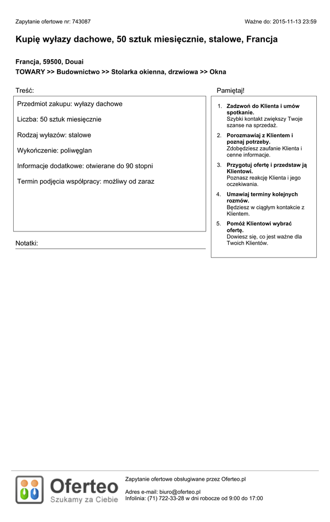 Zapytanie ofertowe nr: 743087 Ważne do: 2015-11-13 23:59 Kupię wyłazy dachowe, 50 sztuk miesięcznie, stalowe, Francja Francja, 59500, Douai TOWARY >> Budownictwo >> Stolarka okienna, drzwiowa >> Okna Treść: Pamiętaj! Przedmiot zakupu: wyłazy dachowe 1. Zadzwoń do Klienta i umów spotkanie. Szybki kontakt zwiększy Twoje szanse na sprzedaż. Liczba: 50 sztuk miesięcznie Rodzaj wyłazów: stalowe 2. Porozmawiaj z Klientem i poznaj potrzeby. Zdobędziesz zaufanie Klienta i cenne informacje. Wykończenie: poliwęglan Informacje dodatkowe: otwierane do 90 stopni Termin podjęcia współpracy: możliwy od zaraz Notatki: 3. Przygotuj ofertę i przedstaw ją Klientowi. Poznasz reakcję Klienta i jego oczekiwania. 4. Umawiaj terminy kolejnych rozmów. Będziesz w ciągłym kontakcie z Klientem. 5. Pomóż Klientowi wybrać ofertę. Dowiesz się, co jest ważne dla Twoich Klientów. Zapytanie ofertowe obsługiwane przez Oferteo.pl Adres e-mail: [email protected] Infolinia: (71) 722-33-28 w dni robocze od 9:00 do 17:00